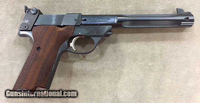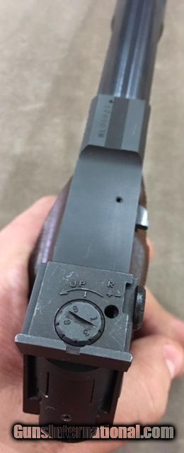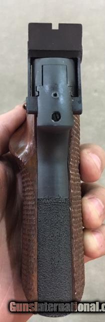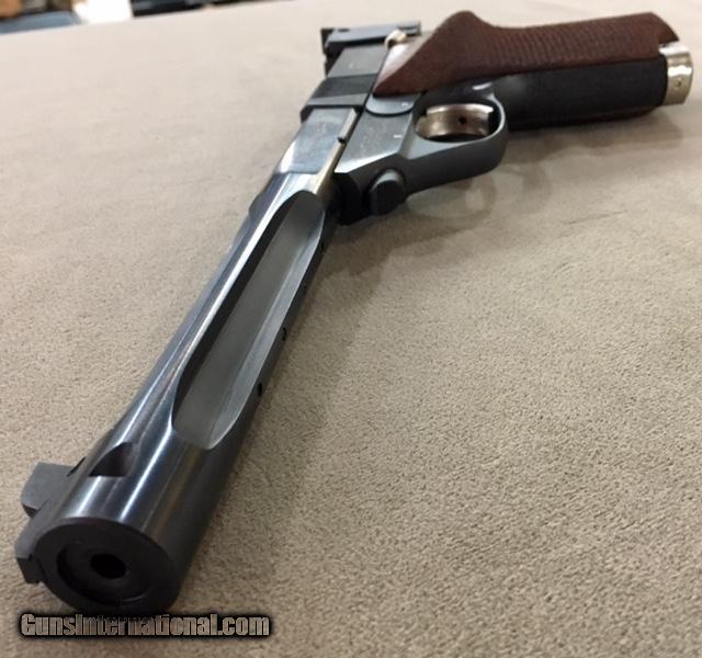 Description: This pistol has been fired but looks as though it has not. A very minty High Standard Supermatic Citation in .22long rifle caliber, and with Military Frame (serial range ML0602x). Pistol has a 7&1/4 inch Heavy Fluted barrel, with cuts for a muzzle brake, factory drilled and tapped for weights on the bottom, with perfect bore and chamber. Grips are original and perfect. Magazine is original and excellent. Overall condition on this pistol is Near Perfect or 99%, in all respects. As nice as one can find without a box. SOLD |