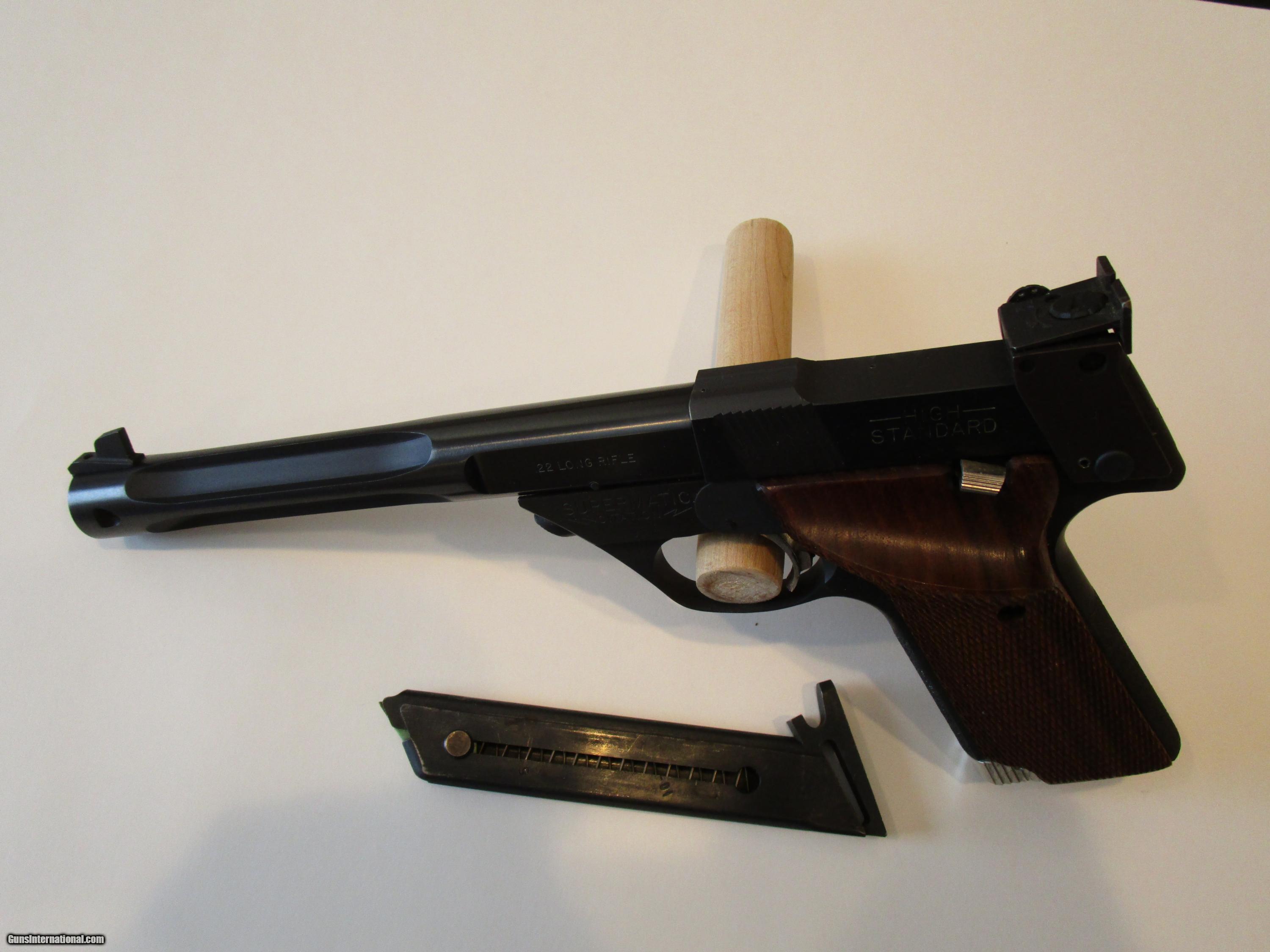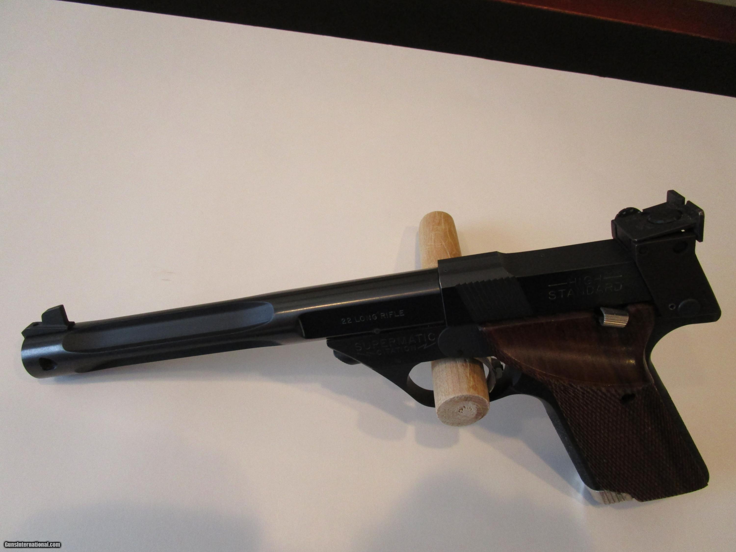 Description: High Standard Supermatic Citation Military 22 Long Rifle Metal condition - excellent, wood condition - excellent, bore condition - excellent. Barrel - 7 1/4 fluted Stock - Checkered walnut grips with right hand thumbrest. Sights - Adjustable target rear blade front. Comes with 2 magazines. Serial # 2424XXX Made in Hamden, Ct. No box. SOLD |