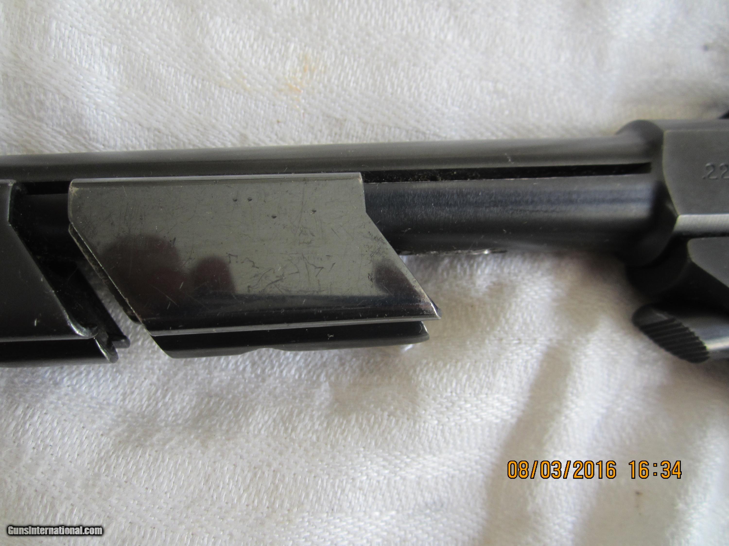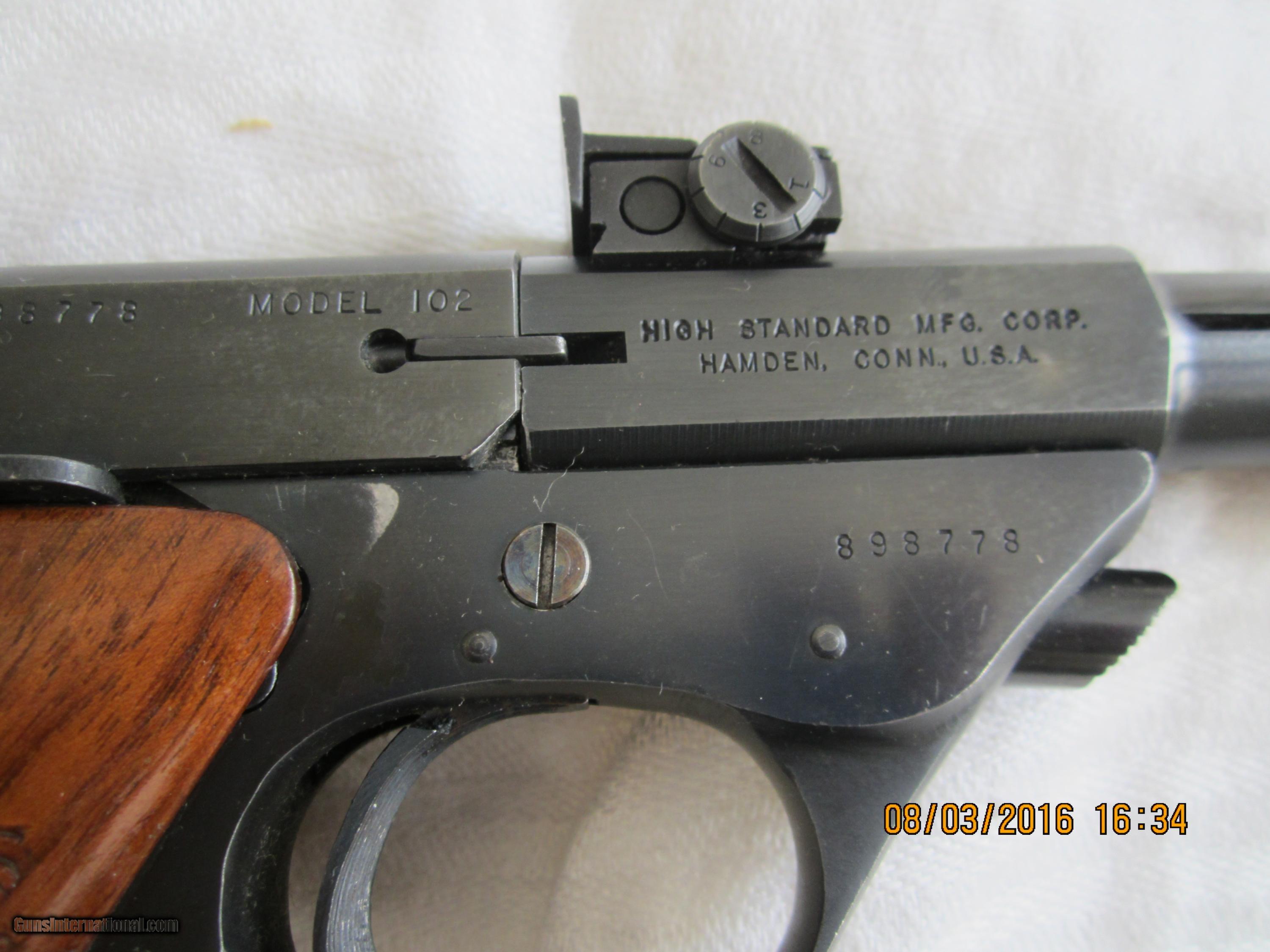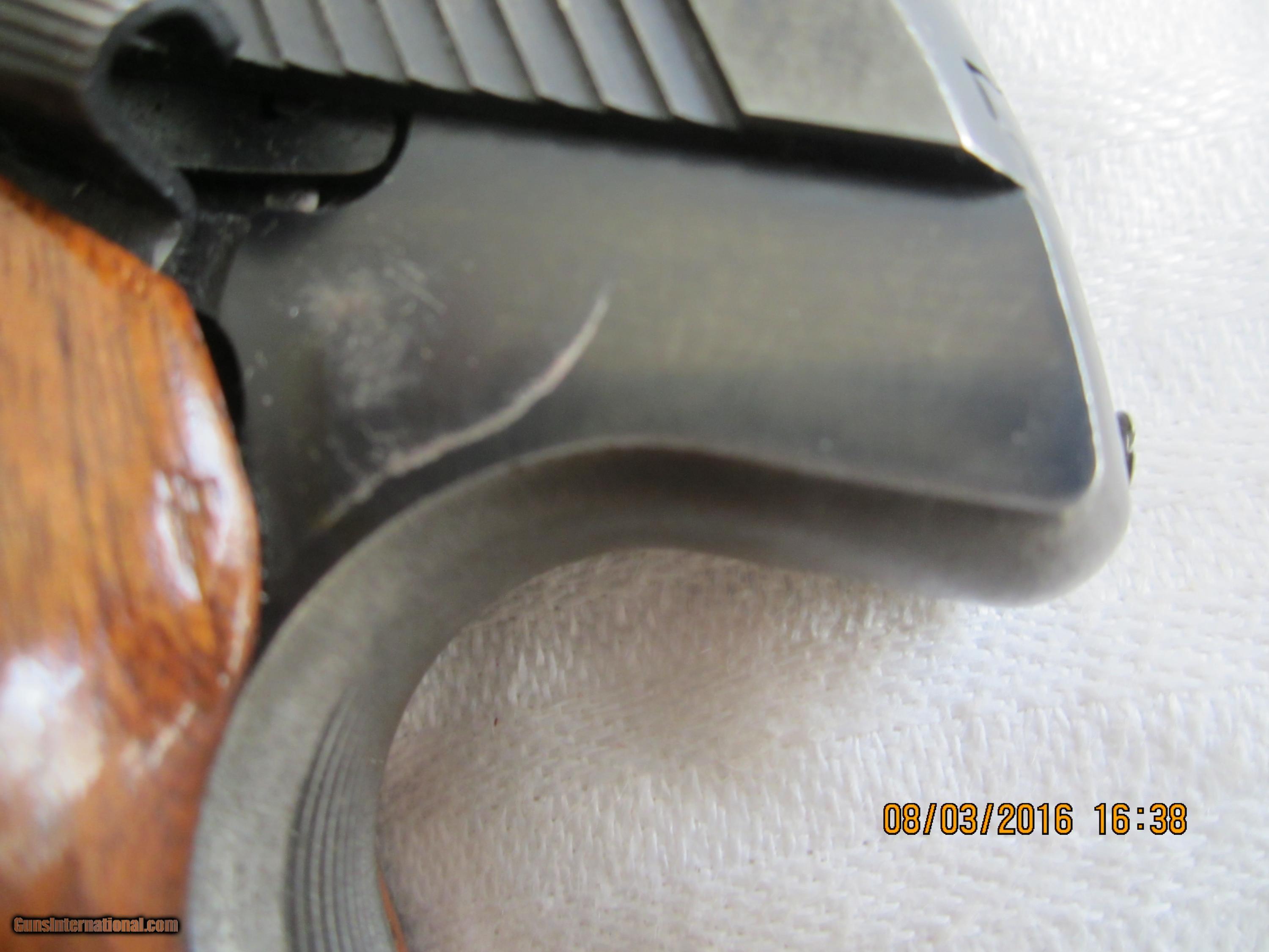 Description: A High Standard Space Gun made in 1958 in about 95% condition as to metal and wood. The magazine holds 10 -.22LR cartridges. It has an 8" tapered barrel and the attached muzzle break adds about one more inch. There are 2 weights attached to the barrel for balance.The walnut grips are checkered with a thumb rest.The rear sight is adjustable. The magazine is marked "High Standard". A beautiful target pistol to look at and to shoot. Quite unique in appearance. Sure to get attention at the gun range. A no interest payment plan is available. SALE PENDING SOLD Manufacturer: High Standard Mfg. Corp., Hamden, Conn. USA Model: Mod el 102 Supermatic Citation Serial Number: 898778 Caliber Info: .22 LR Bore: rifled Condition: 95% Metal Condition: 95% Wood Condition: 95% Bore Condition: bright/shiney Barrels: one Barrel Type: tapered Action: semi-automatic Triggers: target type Stock: checkered walnut grips Finish: Blued Sights: front & rear Manufacture Date: 1958 Engraving: none Extras: weights/compensator Item Location: California-San Diego |