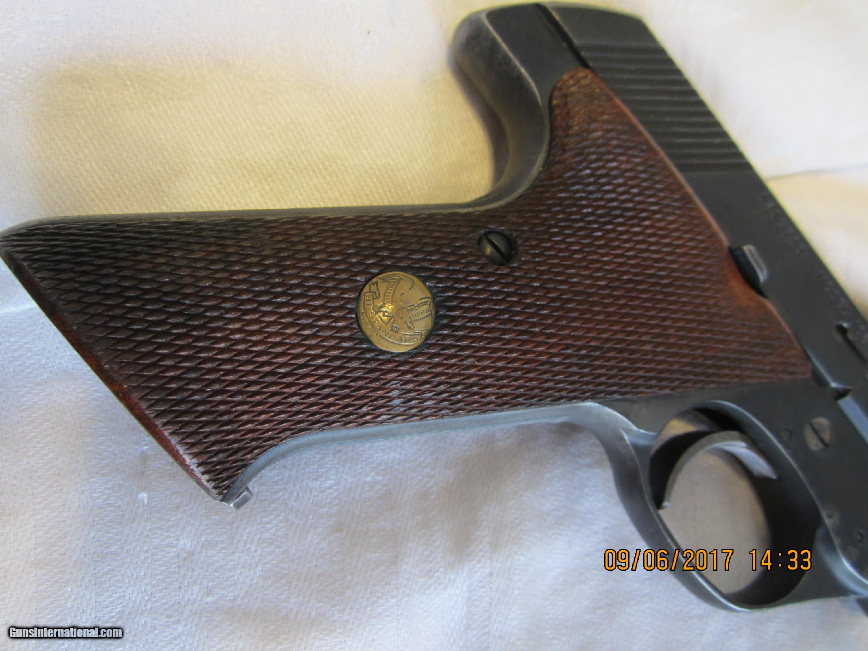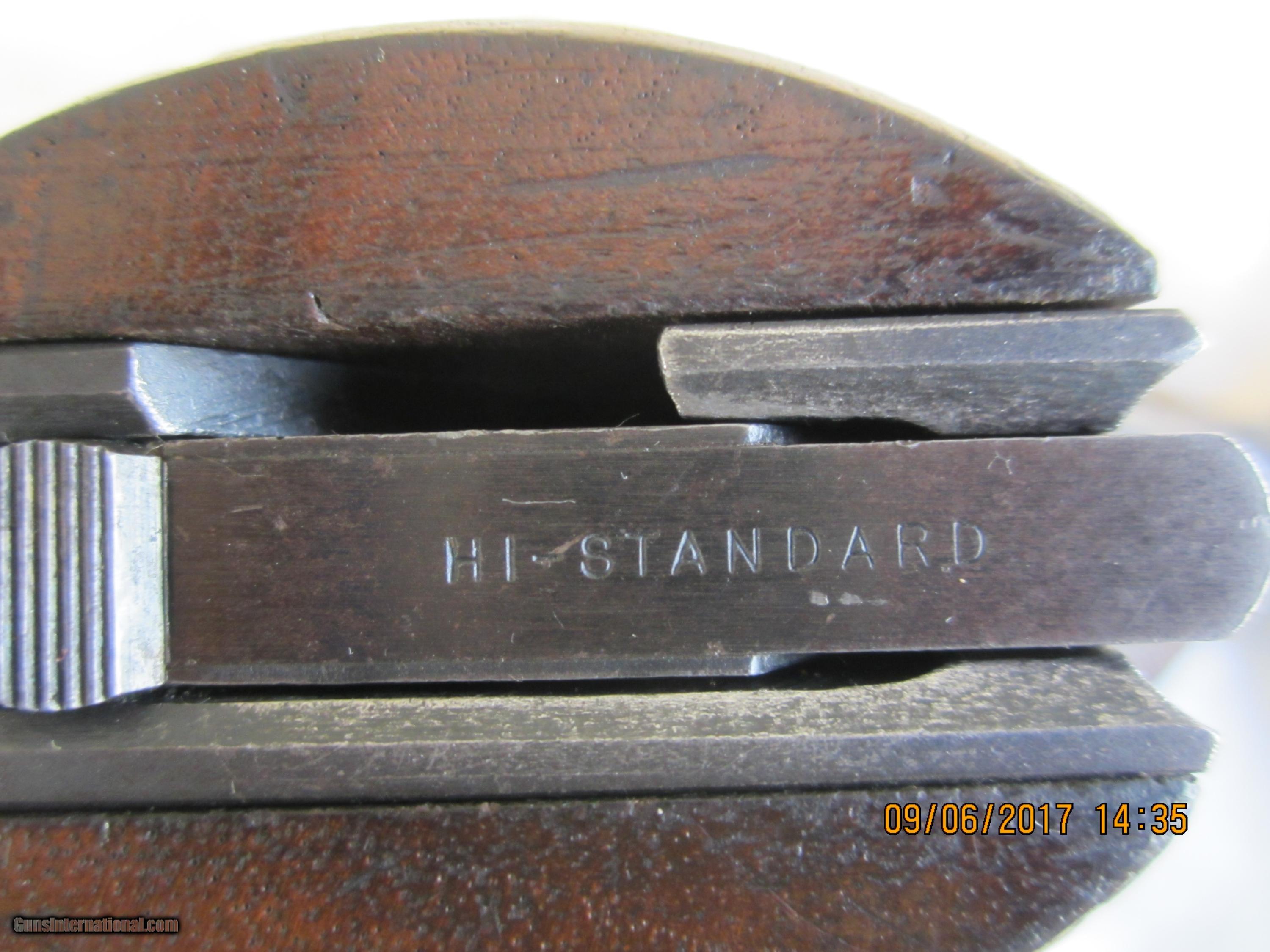Description: A SPACE GUN made in 1961 in about 96% condition as to metal and about 98% condition as to the walnut checkered target grips with a gold HIGH STANDARD Medalion set in each one.The tapered barrel is 8" long and the attached stabilizer adds 1" for a total of 9".There are 2 barrel weights attached for better balance. The rear sight is adjustable. The grip straps are grooved front and rear for an improved grip. The target trigger is very smooth. This pistol is a pleasure to shoot and with its unique configureation, a delight to behold. The magazine holds 10 rounds. SOLD Manufacturer: High Standard Mfg. Corp., Hamden, Conn. USA Model: MODEL 103 SUPERMATIC CITATION Serial Number: 1215711 Caliber Info: .22LR Bore: rifled Condition: 96% Metal Condition: 96% Wood Condition: 98% Bore Condition: bright/shiney Barrels: one Barrel Type: tapered Action: semi-automatic Triggers: one, target type Stock: check. walnut/thumb rest Finish: Highly Polished Blue Sights: front & rear Manufacture Date: 1959 Engraving: none Extras: 2 weights Item Location: California |