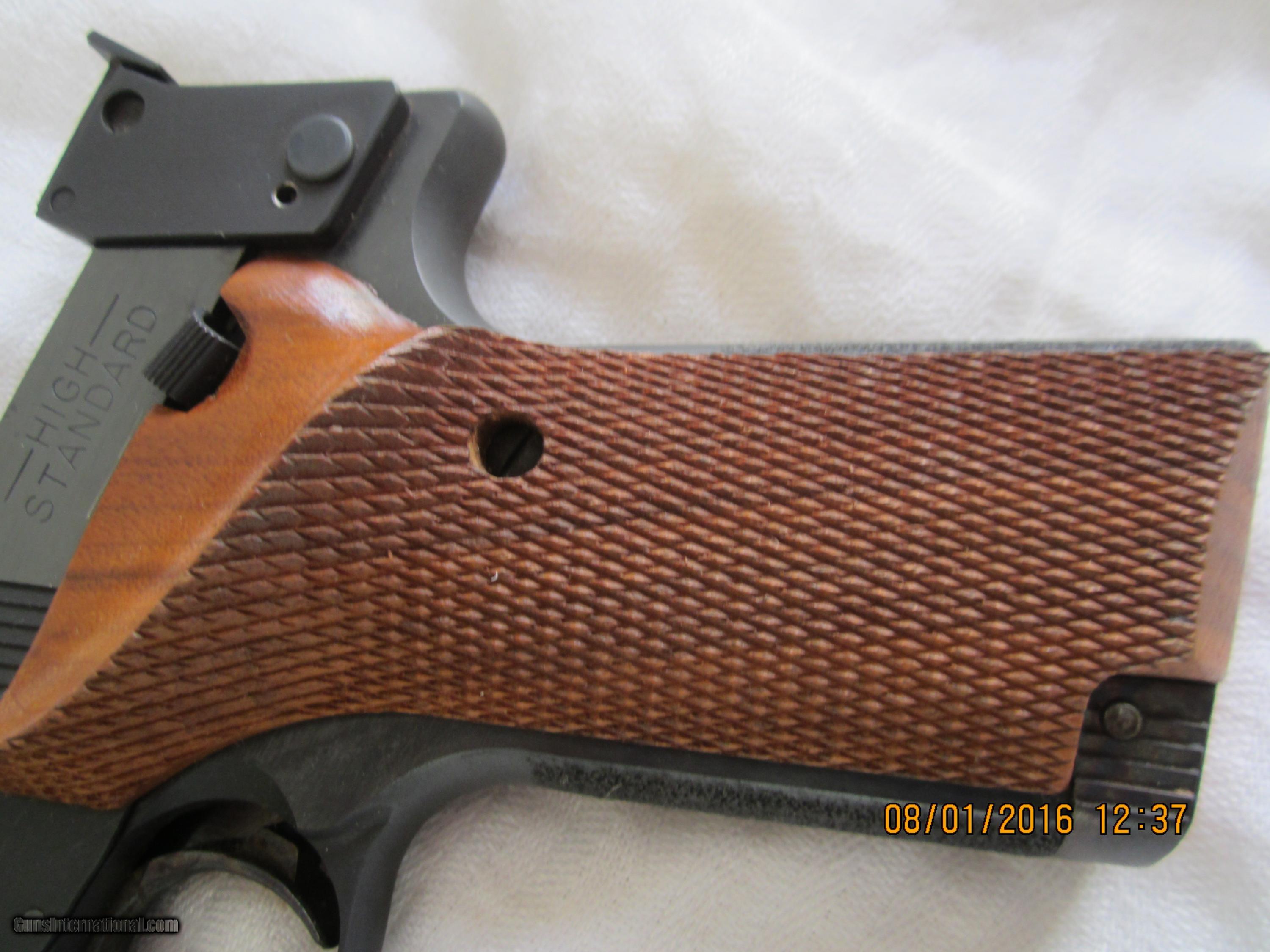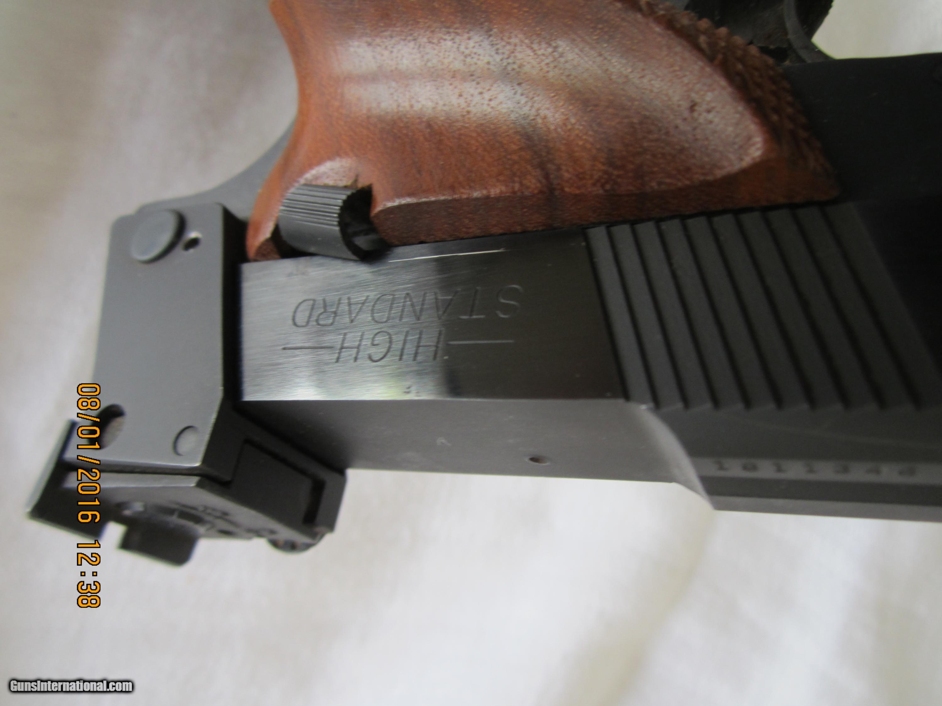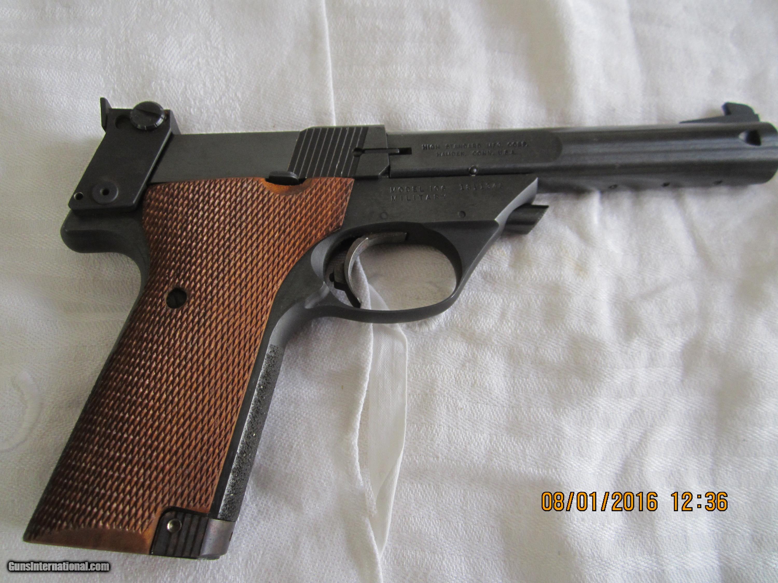 Description: Made in 1967 and in 98+% condition.The checkered walnut grips are close to 100% condition.It has a 5 & 1/2" bulltype barrel with a ribbed sight plane on top. The metal is finished in a high polish blue. The barrel is drilled to add weights (not included). The box has ben taped (see pictures).This pistol has seen little use. NICE! SOLD Manufacturer: High Standard Mfg. Corp., Hamden, Conn. USA Model: Supermatic Citation Model 106- Military Serial Number: 1,811,346 Caliber Info: .22LR Bore: rifled Condition: 98+% Metal Condition: 98+% Wood Condition: 100% Bore Condition: bright/shiney Barrels: 0ne Barrel Type: bull type Action: semi-automatic Triggers: one Stock: checkered walnut grips Finish: High Polish Blue Sights: front & rear Manufacture Date: 1967 Engraving: none Item Location: California |
