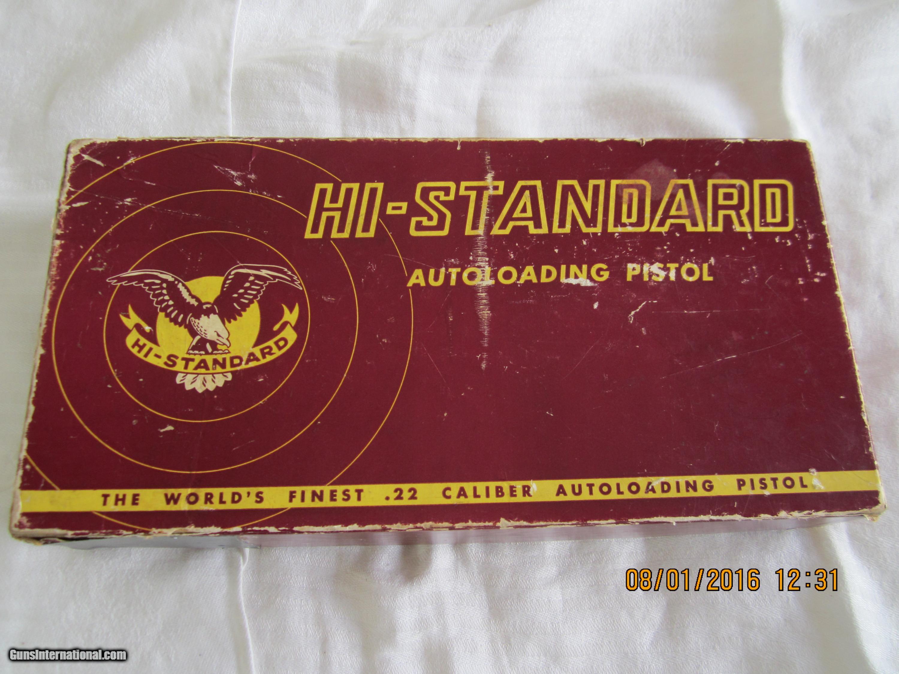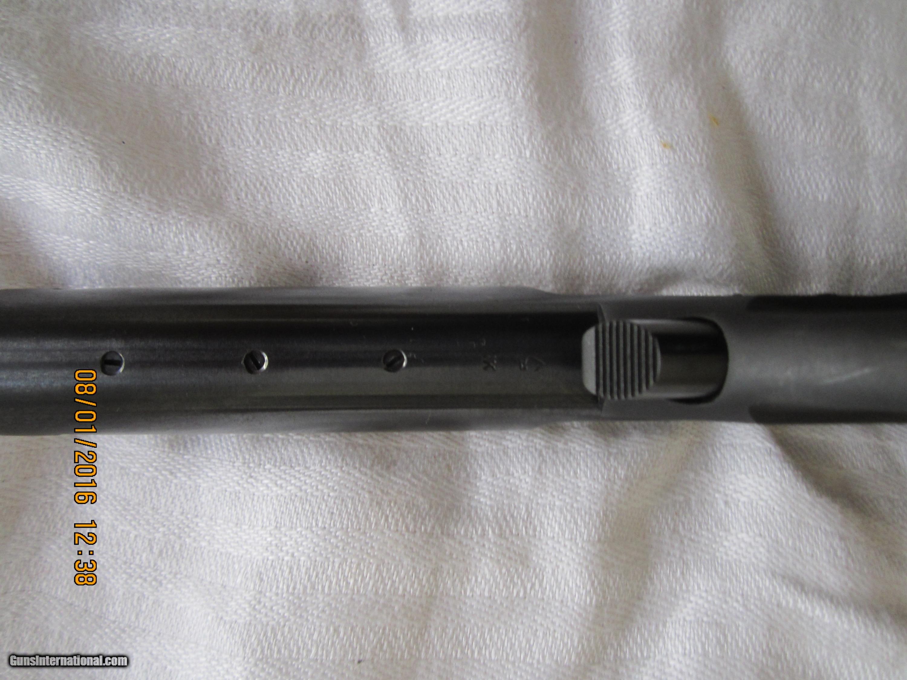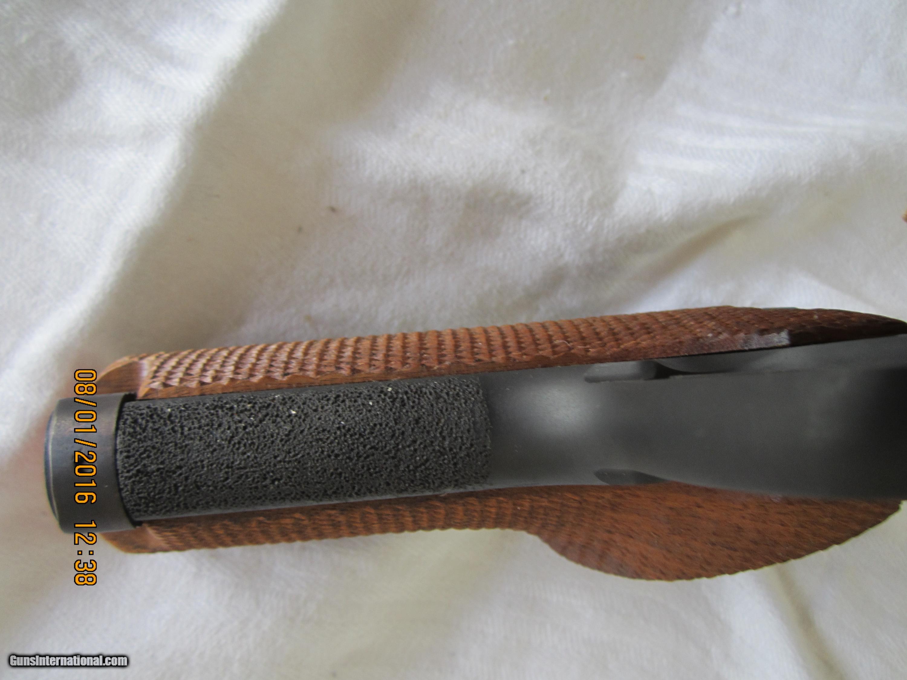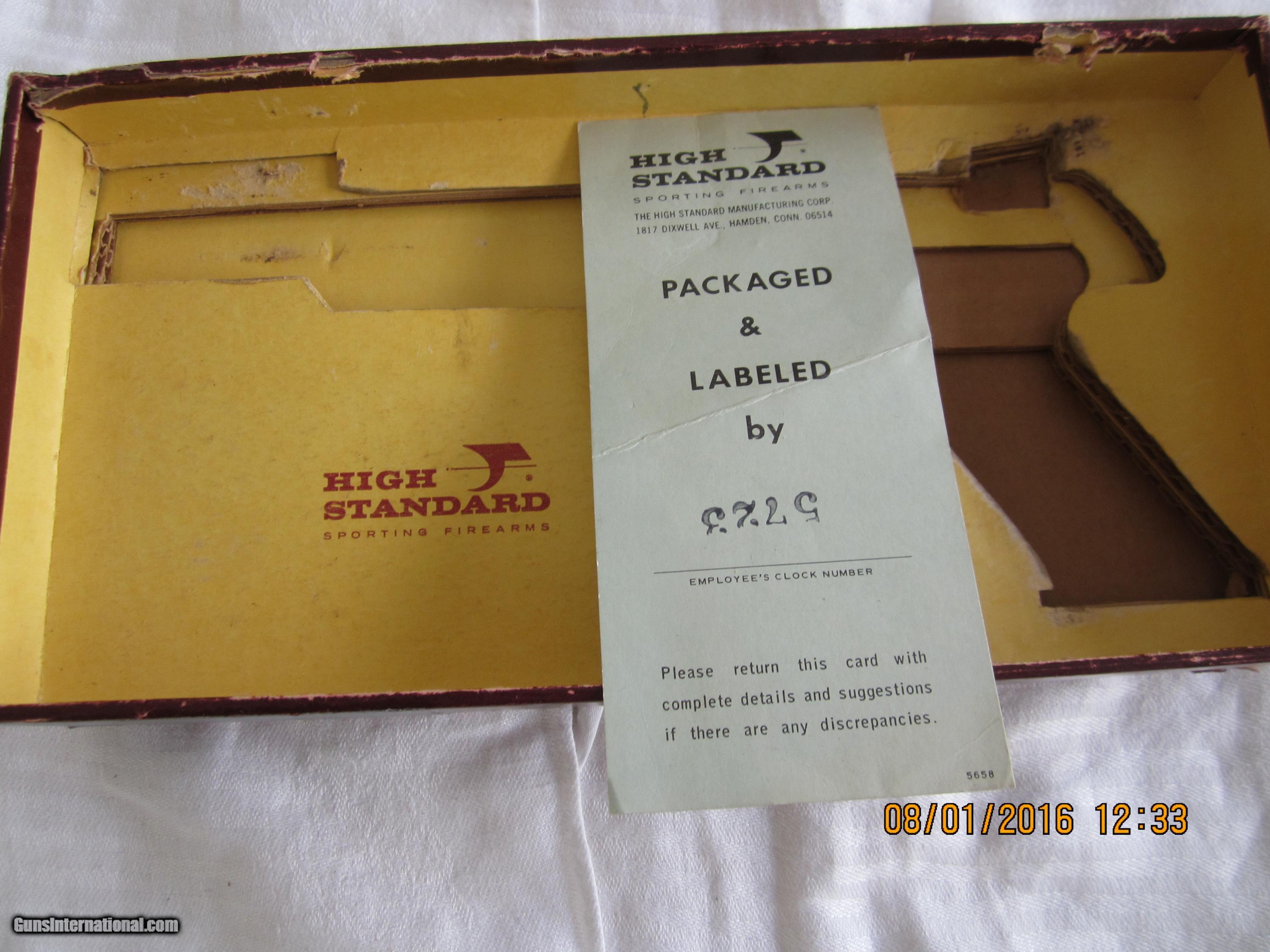 Description: Made in 1967 and in 98+% condition.The checkered walnut grips are close to 100% condition.It has a 5 & 1/2" bulltype barrel with a ribbed sight plane on top. The metal is finished in a high polish blue. The barrel is drilled to add weights (not included). The box has ben taped (see pictures).This pistol has seen little use. NICE! SOLD Manufacturer: High Standard Mfg. Corp., Hamden, Conn. USA Model: Supermatic Citation Model 106- Military Serial Number: 1,811,346 Caliber Info: .22LR Bore: rifled Condition: 98+% Metal Condition: 98+% Wood Condition: 100% Bore Condition: bright/shiney Barrels: 0ne Barrel Type: bull type Action: semi-automatic Triggers: one Stock: checkered walnut grips Finish: High Polish Blue Sights: front & rear Manufacture Date: 1967 Engraving: none Item Location: California |