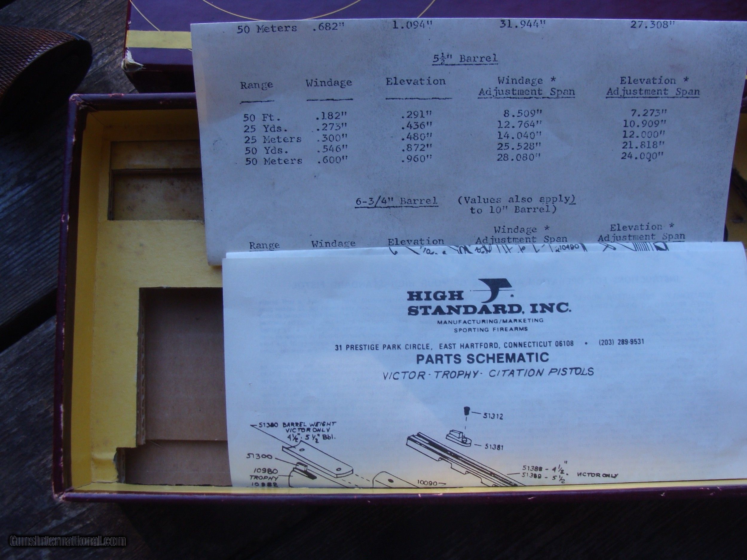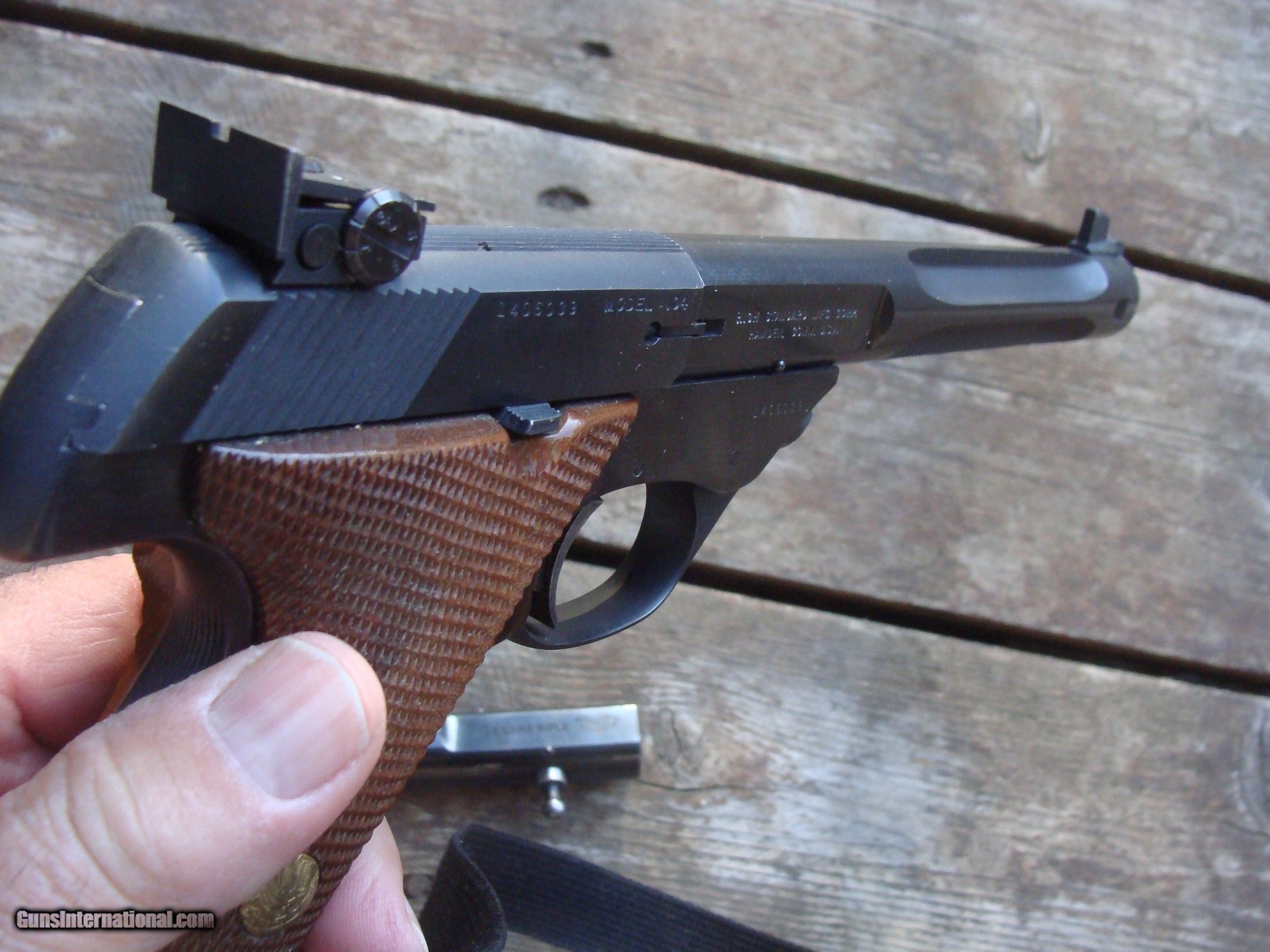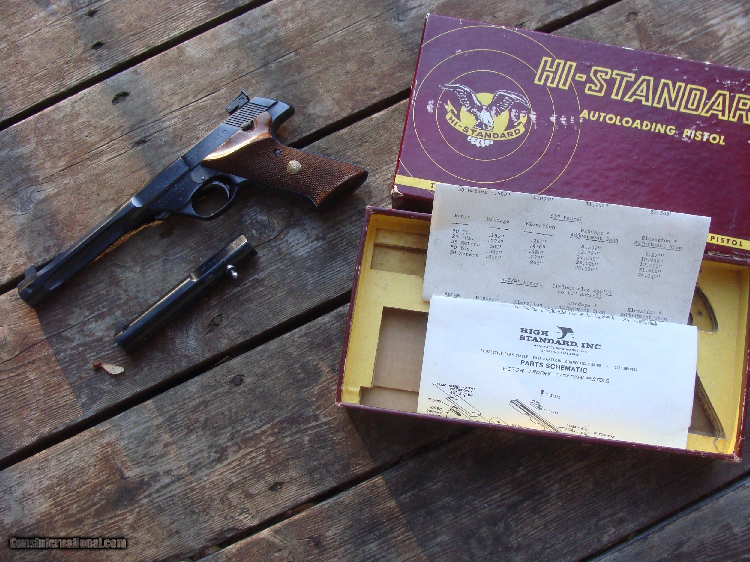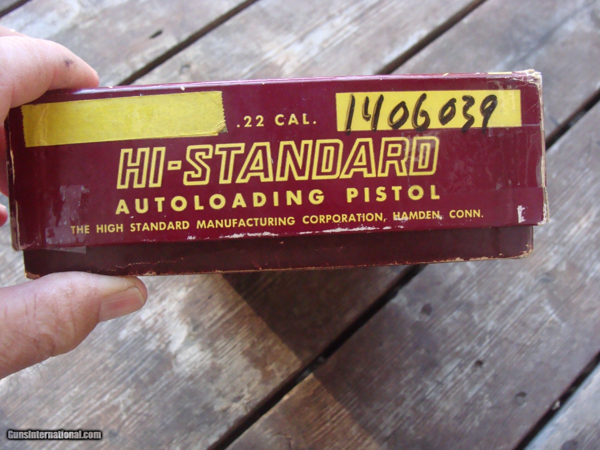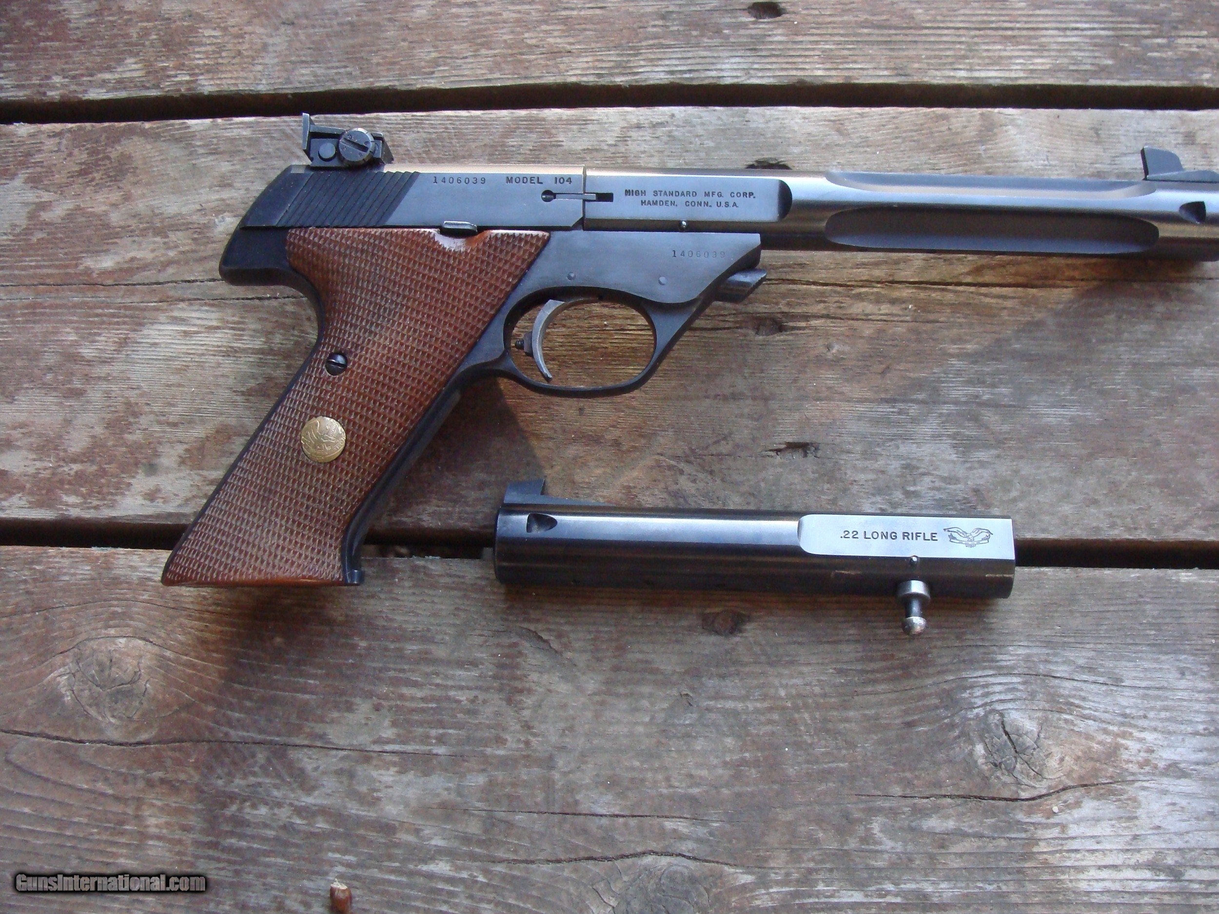 Description: This gun is more or less incredible. It does NOT have a scratch or flaw of any type that we can see. It is most desirable with the 7 1/2 " fluted barrel shown. A fellow with greater knowledge of these than we have observed that it would have come with the 5 1/2" bull barrel. We will take some pics with the bull barrel instaled (very quick instand barrel changes) It has the correct properly serialized box (box is pretty good) and papers shown (the schematic is from a later gun) It is an oxtreamly high quality Hamden Connecticut made gun and really in as or near new conditon . It was likely produced in 1963 or 1964. The beautiful High Standard walnut factory checkered grips are likely an upgrade PLEASE READ EVERYTHING BELOW IN BOLD: IF IT DOES NOT SAY NEXT TO THE PRICE..."SALE PENDING OR UNDER DEPOSIT"...IT IS AVAILABLE. WE DO NOT REPLY TO INQUIRIES THAT SAY "INTERESTED IN THIS GUN" OR "IS IT AVAILABLE" IF YOU WOULD LIKE TO BUY THIS OR ANY OF OUR GUNS WE SUGGEST YOU PHONE US; WE ARE OFTEN AVAIALABLE LONG HOURS. IF YOU ARE INTERSTED IN A GUN THAT IS UNDER DEPOSIT AND WOULD LIKE TO BE NOTIFIED IF A SIMILAR GUN COMES IN DROP US A LINE AND WE WILL MAKE EFFORTS TO CONTACT YOU WHEN ONE DOES COME IN. WE HAVE OVER 2000 SALES ON ALL SITES WITH AN A+ RATING ON ALL WE ALSO KEEP AN INVENTORY OF OLDER PERIOD CORRECT SCOPES; CALL WITH NEEDS WE MOSTLY PICK VERY CLEAN AND LIGHLTY USED GUNS. WE ARE HAPPY TO TAKE CONSIGNMENT GUNS AND COLLECTIONS OR WILL BUY YOURS OUTRIGHT. WE SOMETIMES ARE EMPLOYED FOR ESTATE PURPOSES AND VALUATIONS. CT RESIDENTS MUST CONTACT US TO UNDERSTAND OUR IN STATE TRANSFER POLICIES. PAYMENT USPS MONEY ORDER ONLY AT THIS TIME. ( WE CAN TAKE A DEPOSIT WITH A CARD BUT THE GUN MUST BE PAID WITH A USPS MONEY ORDER) IT IS THE BUYERS RESPONSIBILITY TO GET US A COPY OF YOUR RECEIVING FFL'S LIC AND A COPY OF YOUR PHOTO ID BEFORE THE GUN SHIPS YOU MUST CALL YOUR FFL.WE DO NOT CALL FOR YOU. LAYAWAY PURCHASES NOT COMPLETED OR ANY RETURNED ITEM UNLESS NOT AS DESCRIBED OR DAMAGED ARE SUBJECT TO A 10% RELISTING/RESTOCKING FEE AND MUST BE RETURNED WITH NO NEW MARKS OR SCRATCHES, SENT BACK INSURED, PRIORITY SIGNATURE REQUIRED. ALL INFORMATION CONTAINED HEREIN IS BELIEVED TO BE ACCURATE BUT IS NOT GUARANTEED. WITH ANY OLDER OR USED GUN IT SHOULD BE EXAMINED BY A GUNSMITH OR COMPETENT EXPERT PRIOR TO USE) SOLD |