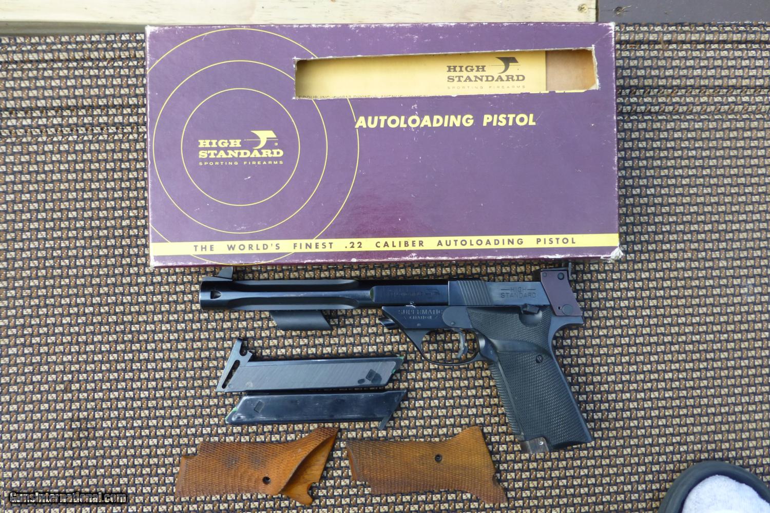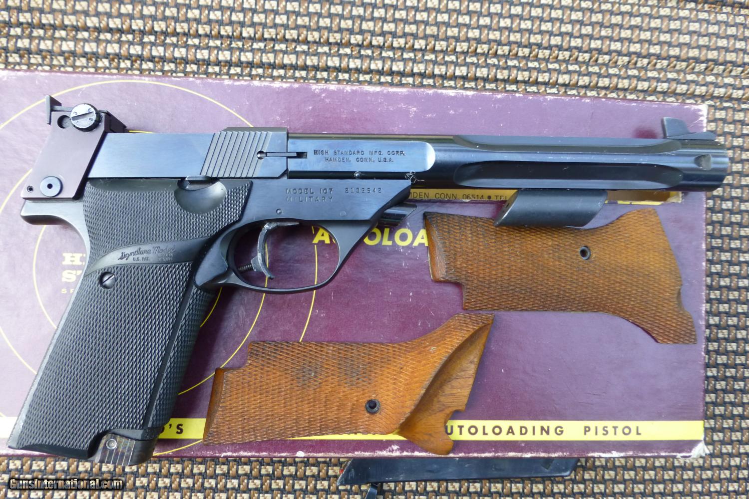 Description: 22 Cal LR Semi-auto Supermatic Citation. 7 1/4" Flutted barrel with lower weight. Triggger stop, trigger pull adjustment, stippeled front and rear back straps, bridge type rear site. Three magazines. Factory box and papers. Adjustable rear sight. Factory wood and Pachymar grips. SOLD Manufacturer: High Standard Model: 107 Military Supermatic Citation Condition: excellent Metal Condition: excellent Wood Condition: excellent Bore Condition: excellent |