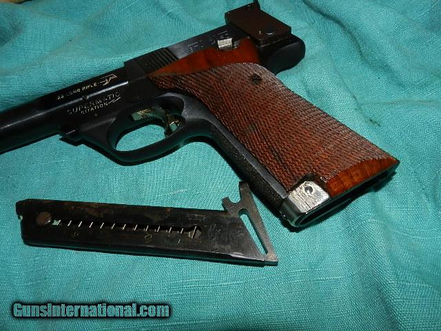 Description: A military style High Standard semi-auto .22lr with the rear adjustable sight and ramp front sight, and a bull barrel. The bore is shiny clean and rifled.This model has the checkered American walnut grips in very good condition, and the mag release is on the front of the bottom grip strap, where it pulls forward to release the mag.Factory finish is about 98% blue and doesn't appear to have been holstered. A few very small specks from storage on the right side of the barrel. Overall a very clean gun. The high Standard .22lr semi-auto pistol has been considered by professional competitive shooters to be the best pistol to use in competition! We don’t have asite .I prefer money orders or a check. Item ships when funds come in. If you can only pay with a card let me know. I’m sorry I don’t list my phone number, did that for 30 days, never again.. I can’t talk on the phone all day…who will ship the guns? I’m just one person, and it’s very bust here! I do a brisk volume! I hope you like my wide selection of unusual guns, knives and gun parts. Shipping price determined by zip code. I try to keep the prices affordable, which means I make less money than most dealers. You won’t get altitude sickness with my prices! I consistently have the best selection of older guns If you BUY IT NOW you must still contact us for details buy it now doesn't end the sale, it just sends an email telling us you want to buy this gun. A phone call won’t secure a sale! Not home many times, the first buyer by email buys the gun !Thissite doesnot close down a sale when you do a BUY IT NOW like Ebay!I can get six buy it nows in an hour, first buyer to email gets the guns, others are in second place! Best to send another email . Sometimes not home to get calls. Some guns are required shipment to a gun dealer near you for a transfer to you when it arrives. With the widest selection of older guns at great prices, We don’t have a store, and sell on the internet only. SOLD |