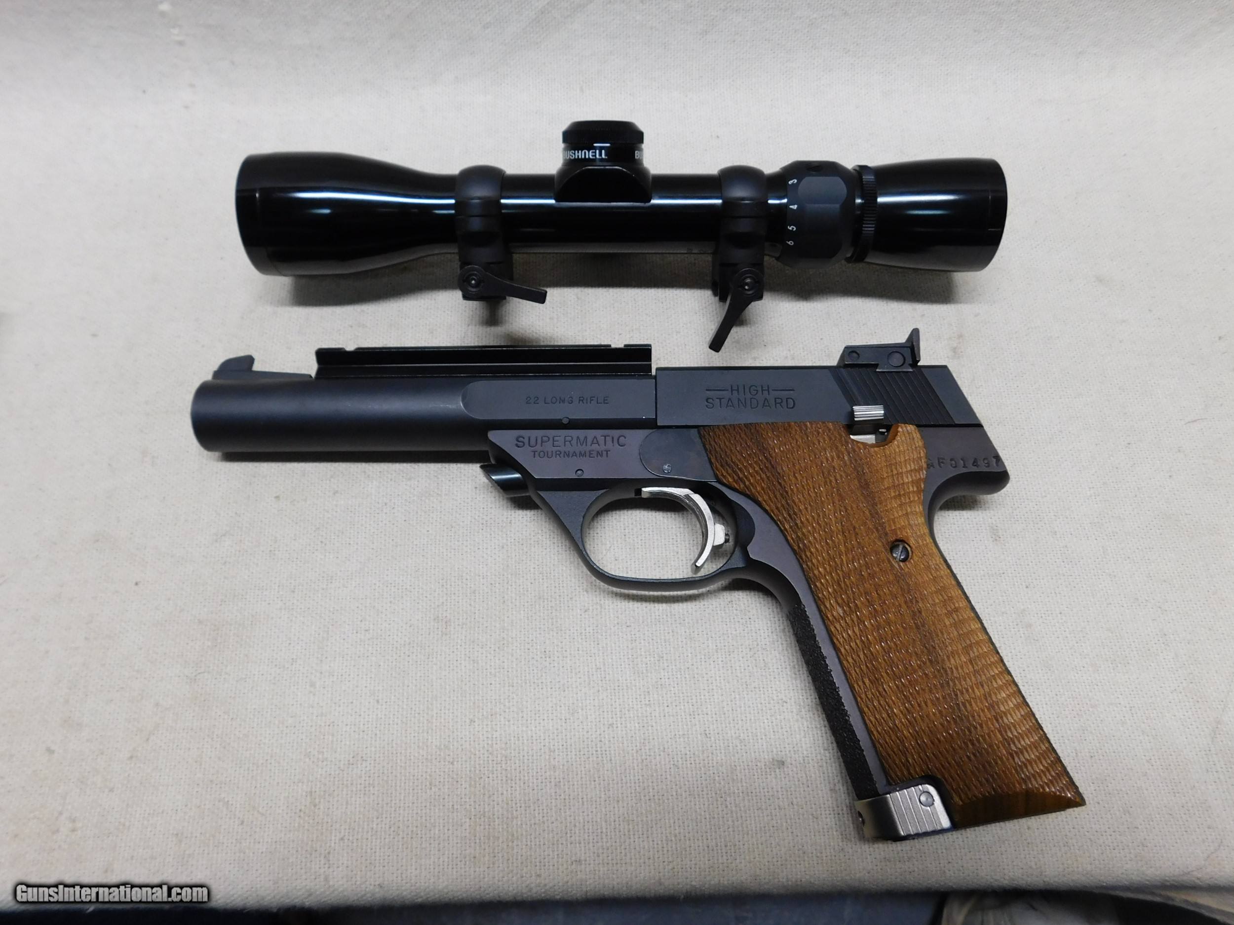 Description: High Standard Supermatic Tournament pistol,22 LR,5-1\2" Heavy Barrel,2-6x32 Bushnell Tropy Scope in QD Burris Rings,Sights can be used with Scope Removed,Comes with 2 magazines and Extra Rubber Grips,Excellent Condition,Houston Mfg.! Store Hours Thur-Fri-10AM-8PM Sat-9AM-12PM All other times Please Leave a Message, Thank You! No California Sales Lower 48 State Sales only Shipping $ 35.00 SOLD Manufacturer: High Standard Model: Supermatic Tournament Serial Number: AF01497 Caliber Info: 22LR |