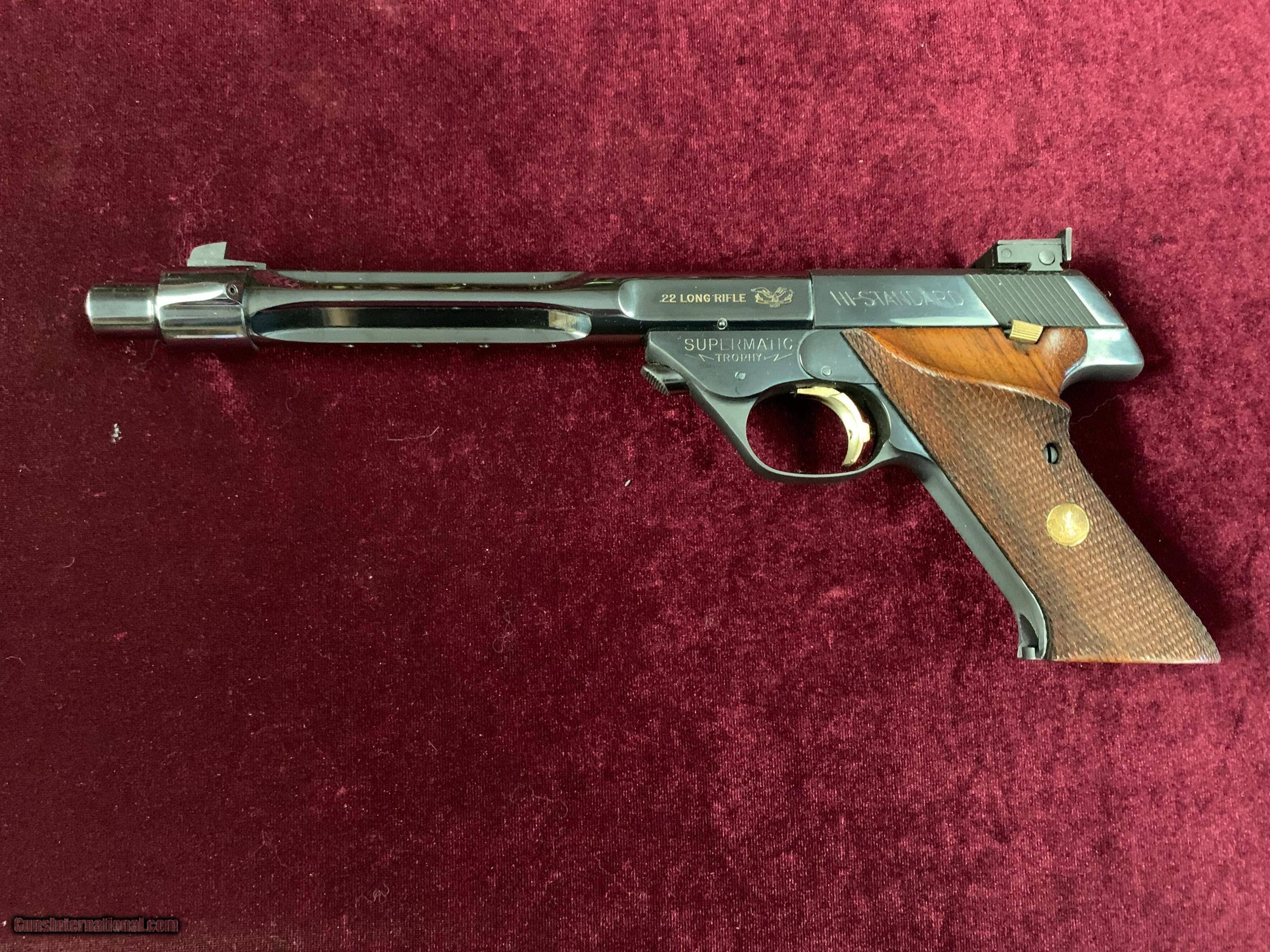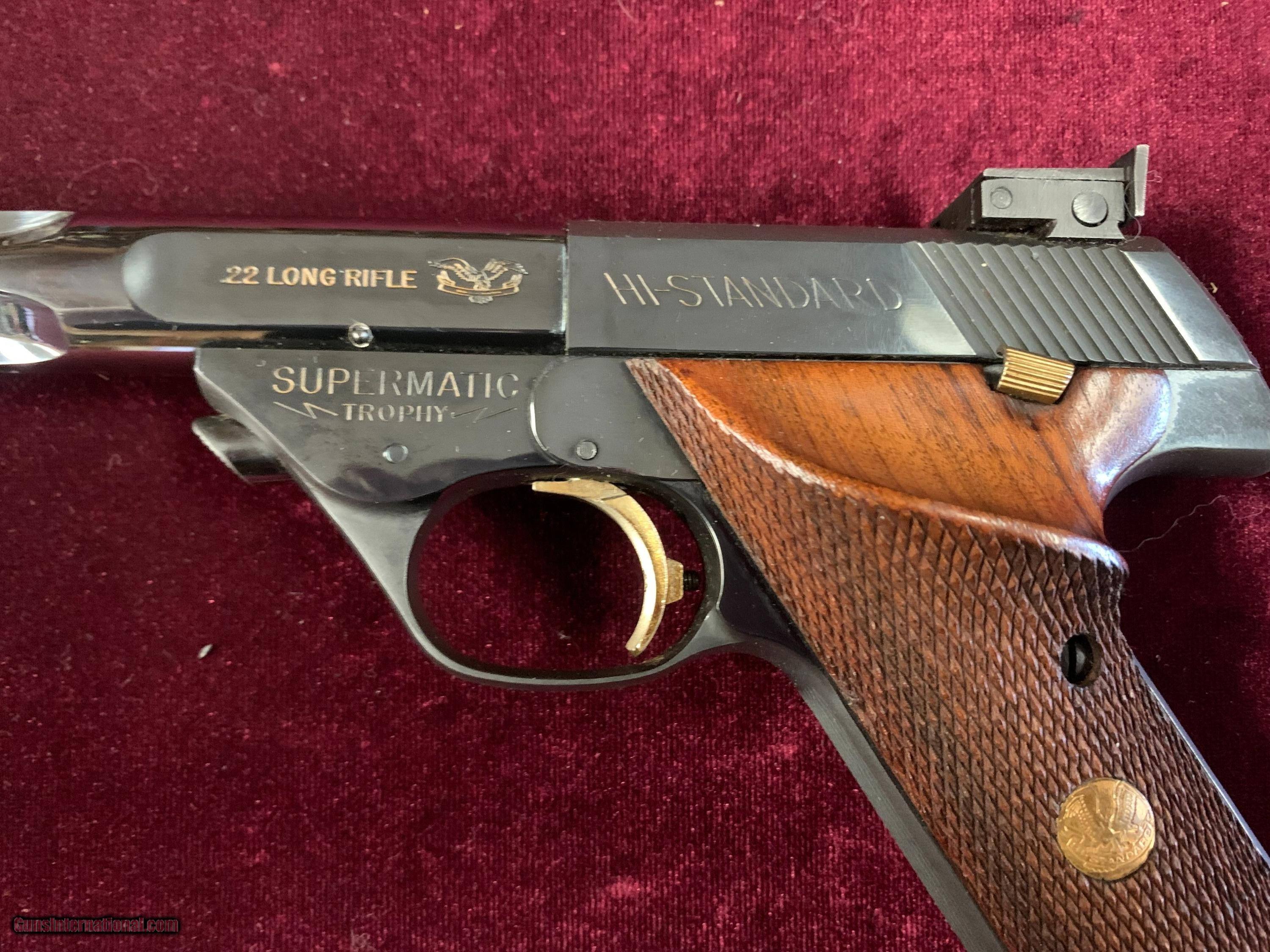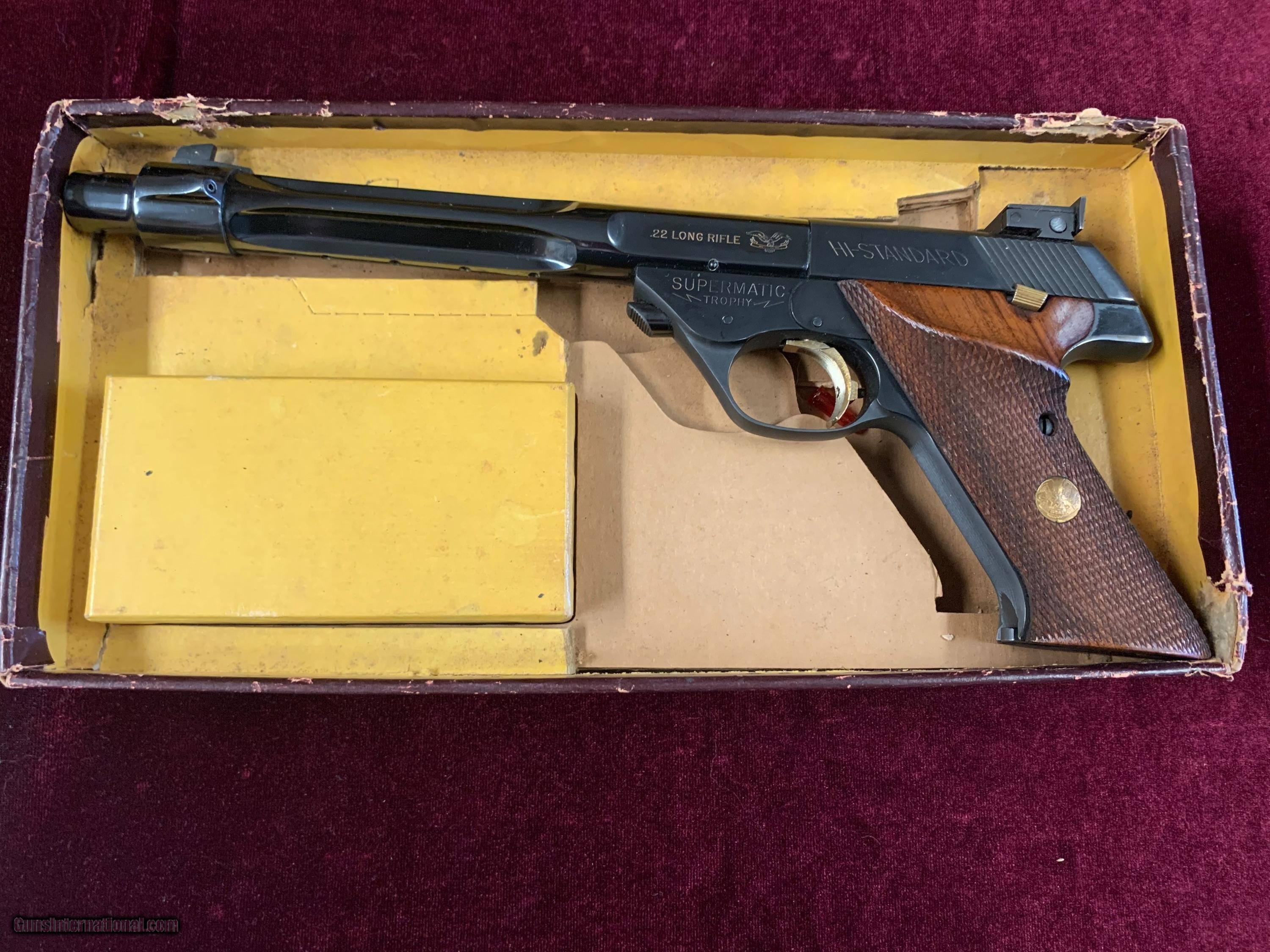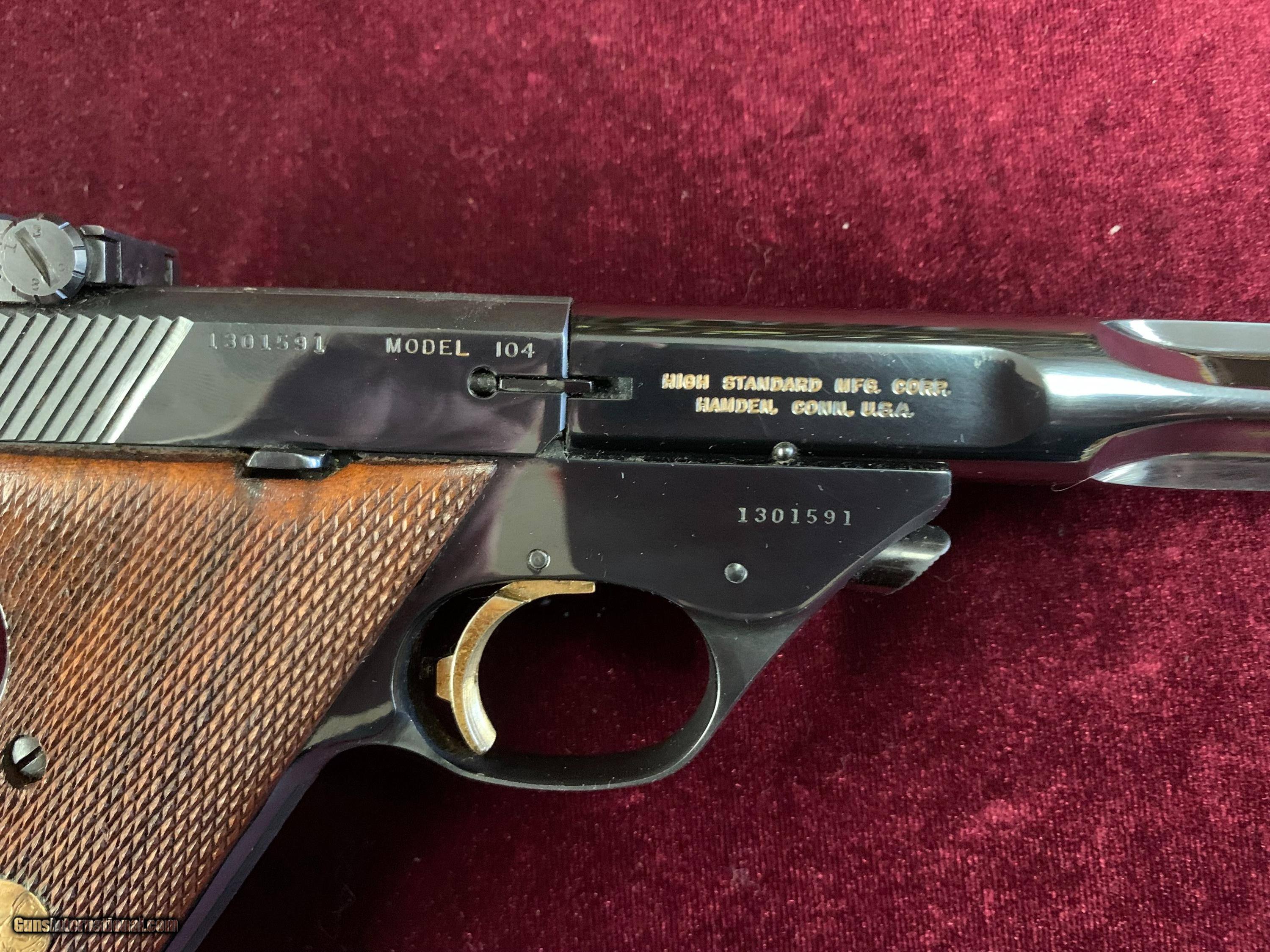 Description: Hello. today we have a High Standard Supermatic Trophy 104. Gun is 100% perfect, appears unfired in box with barrel weights, adjustable trigger, factor comp. $1295. Buyer pays shipping, 3% card fee. SOLD Handgun Caliber: .22 Long Rifle Manufacturer: High Standard Model: 104 |