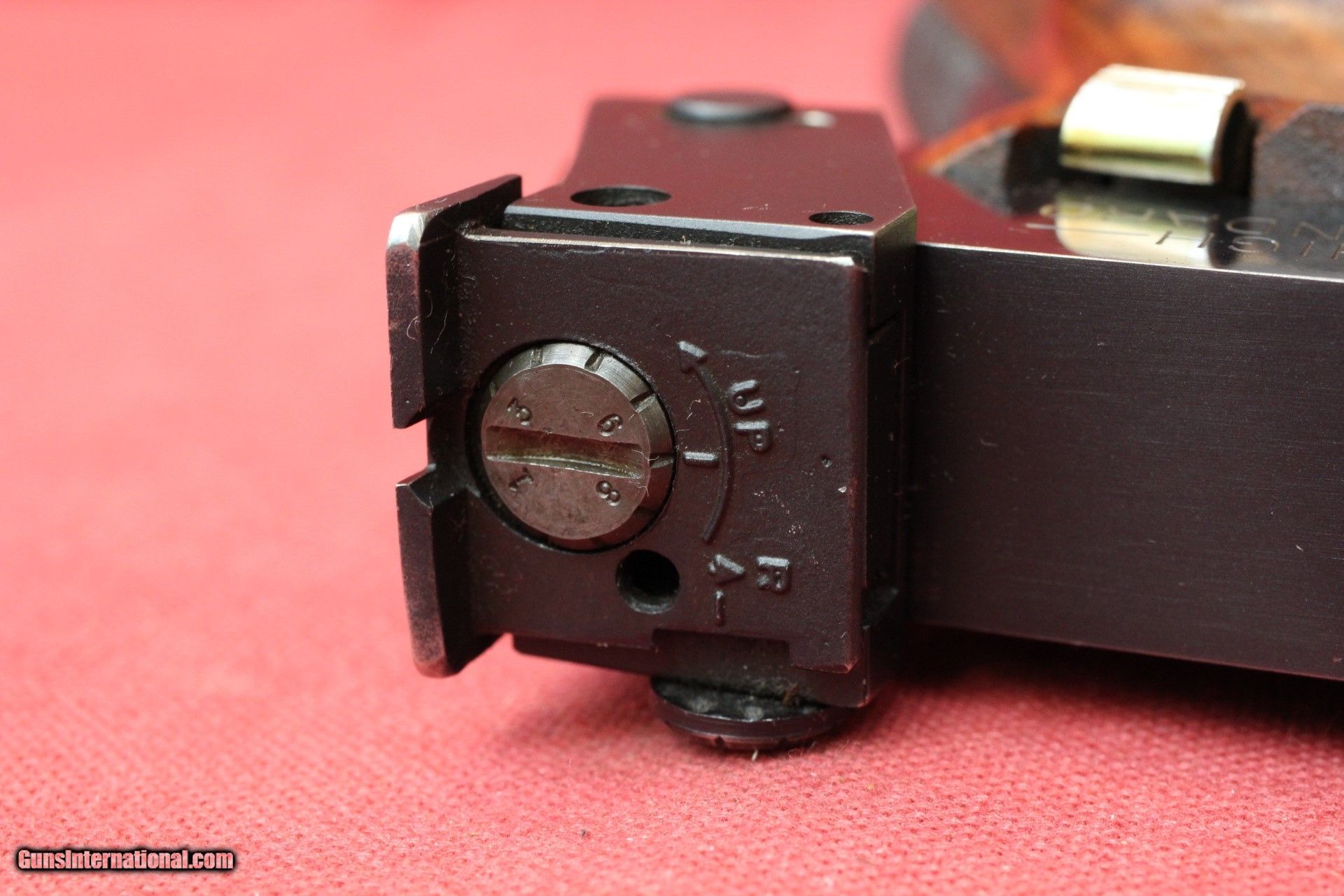 Description: 22lr, serial number 19163XX. Made in Hamden Ct. 5.5" heavy barrel. Overall in good condition, shows normal wear. Metal shows wear, heavier at muzzle. Wear on sharp edges and on top of slide. Bore is excellent. Target grips are in very good condition, light wear on bottom of both panels. Comes with box, paperwork and 2 extra magazines. More photos on request. Please add $40.00 for shipping and insurance. Sold AS-IS, no returns. SOLD Curio/Relic: Yes |