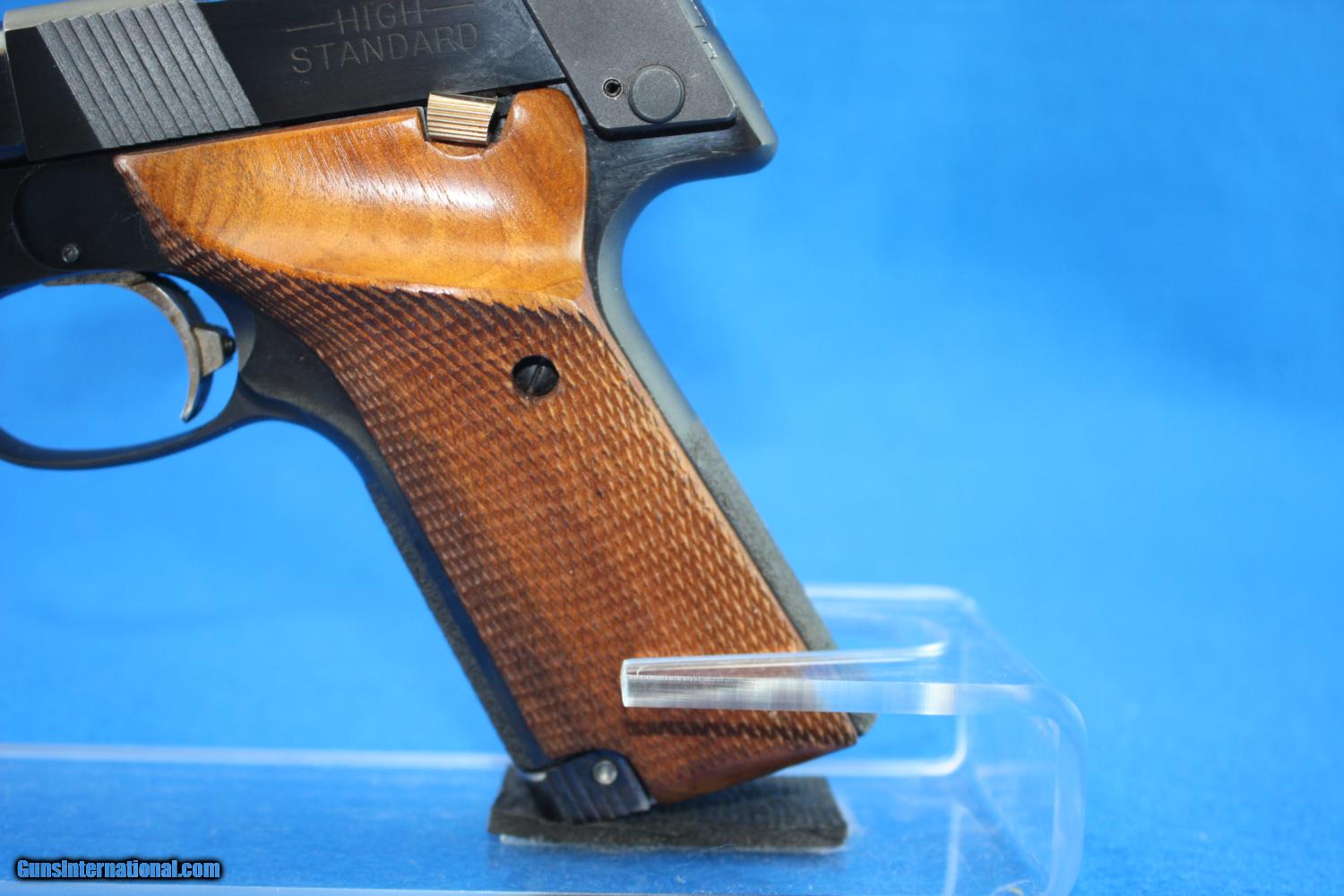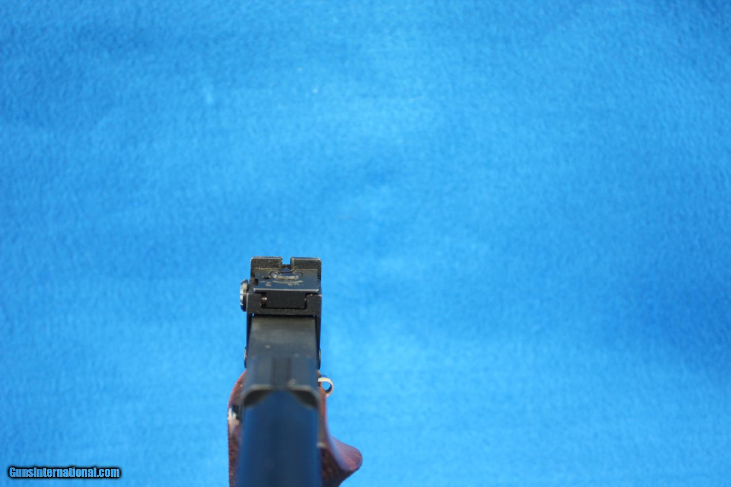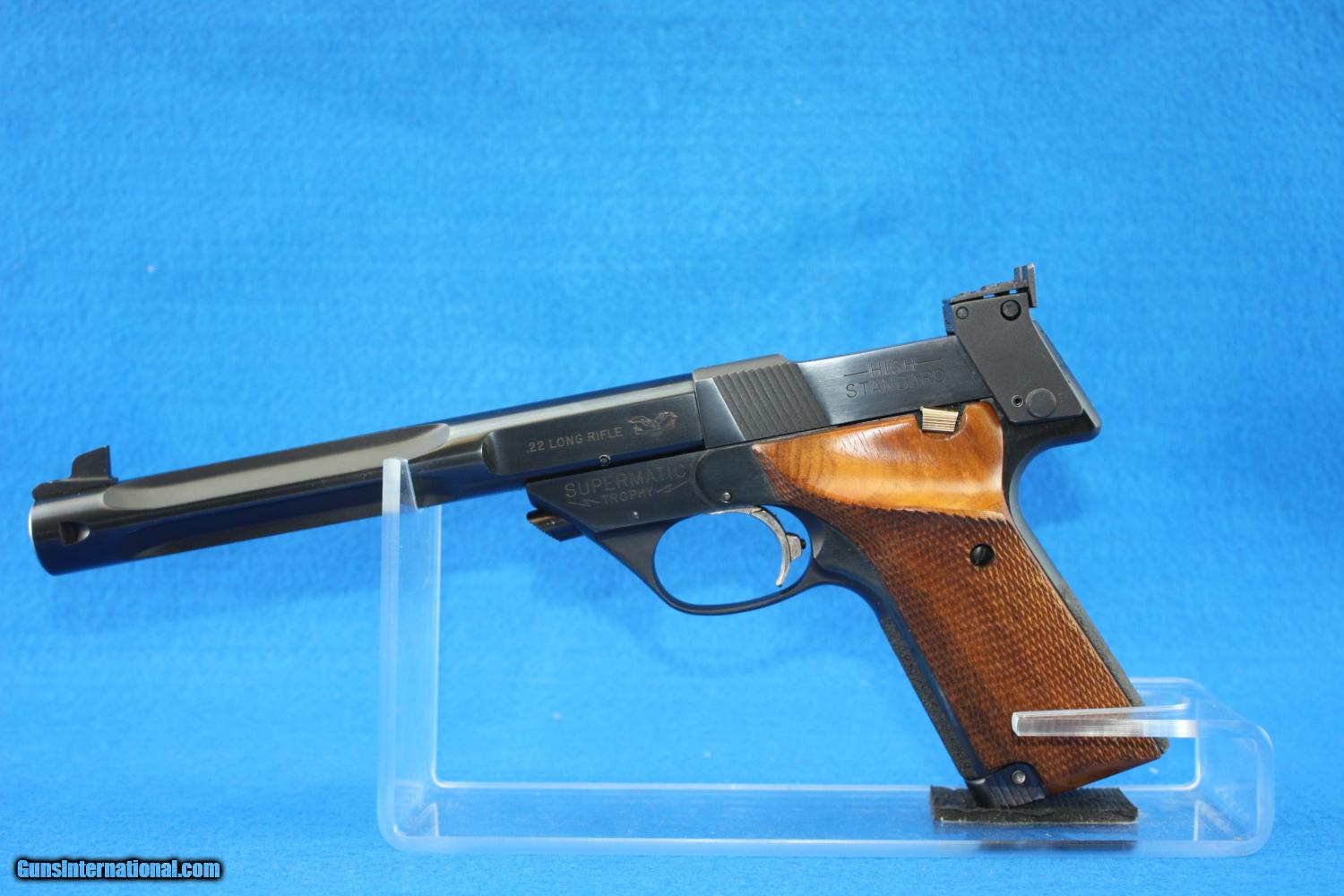 Description: High Standard Supermatic Trophy 106 Military, 22LR, 7.25" fluted bull barrel, muzzle brake, adjustment, bridge type adjustable rear sight, blade type front sight, 2 extra magazines, Checkered walnut grip with thumb rest, Firearm is in excellent condition with sharp checkering on wood grips. Firearm has box, weight and parts list. . ADD 3% FOR CREDIT CARDS SHIPPING $25.00 SOLD |