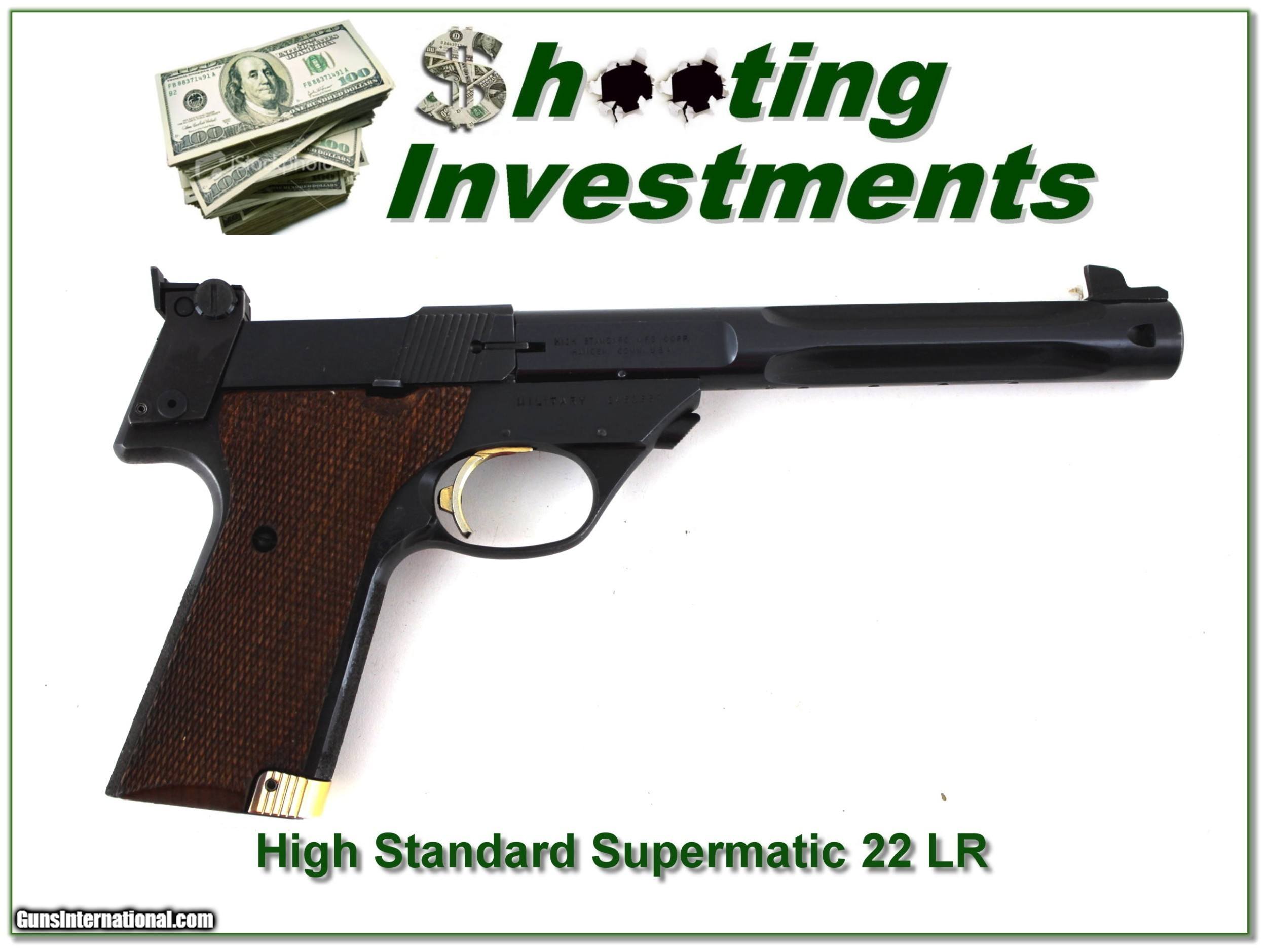 Description: Collectors, this is a top collector condition High Standard Supermatic Trophy in 22 LR. It has a 7.25in Heavy Target Fluted barrel. I find no marks on the metal or grips. I am selling this one on consignment and as such lay-a-way can’t be used. It does of course have the standard 3-day inspection. Shipping and insurance is $39. Please email me with any questions or larger pictures. (Consign your quality firearms with Shooting Investments for only 12%! Let me know if you have any you would like to sell!) 22-1079 Payment: Payment is by Money Order, Cashiers Check or Personal Check. I can now also accept Credit Cards (MasterCard, Visa, Discover & American Express) with a 3% convenience fee. Shipping: The shipping charge will be listed in each description. It is $49 for most long guns. Some heavy guns, over 48in boxes or those insured for over $2000 will be higher. Shipments to Alaska and Hawaii are higher because air shipment is required. Most firearms are shipped on Tuesday and Thursday and usually in 5 days of receipt of payment. We package all shipments carefully and insure them. Optics are shipped Priority Mail and most other non-firearm shipments are shipped First Class. Returns: Our return policy is simple. If for any reason you are not pleased with your purchase, you may return your item for a full refund of purchase price. Ammunition cannot be returned. It is important to us that you are happy. Guns cannot be fired or dissembled before returning them and they must be returned in the same condition as received. Notification of a return must occur with-in 3 days of receipt at your dealer. Shipping, convenience and dealer fees are not refundable and are the responsibility of the buyer. Lay-a-way: If needed, we offer a 60 day lay-a-way option on most firearms. It is 1/3 now, 1/3 in 30 days and 1/3 in 60 days. Lay-a-way firearm sales are final and if not completed the first payment cannot be returned. Consigning your firearms with Shooting Investments: We will help you get top dollar for your firearms. While most local guns shops charge 20% or more, our fee is only 12% with a minimum of $75. At your local gun shop it might take months to sell. Selling on-line provides instant access to thousands of interested buyers. You won’t find any other on-line dealer willing to sell your firearms for only 12% or listing every gun on 3 separate s. Selling through an House typically costs the seller 15% and the buyer an addition 15% (so 30%) and you have to wait several months to sell and longer to receive funds. If properly priced, we will sell your firearms in a few weeks. Send us an email or give us a call and we’ll explain how easy it is for you to get top dollar. Trading: Trading for use is really just buying your gun to re-sell. If you have a gun you want to trade, please email a picture and we will let you know what we can give or it. You will always get more if we sell it for you on consignment. Help for California Buyers: We are happy to ship to California. It is the buyer’s responsibility to make sure any item you buy is legal in your state. We are also happy to help with your purchase of a firearm from someone other than us. If you see a gun you would like to buy but the seller can’t or won’t ship to California they can ship to use and we’ll then ship it to your California dealer. The cost for this service is only $30 + shipping. Let us know if we can help! SOLD |