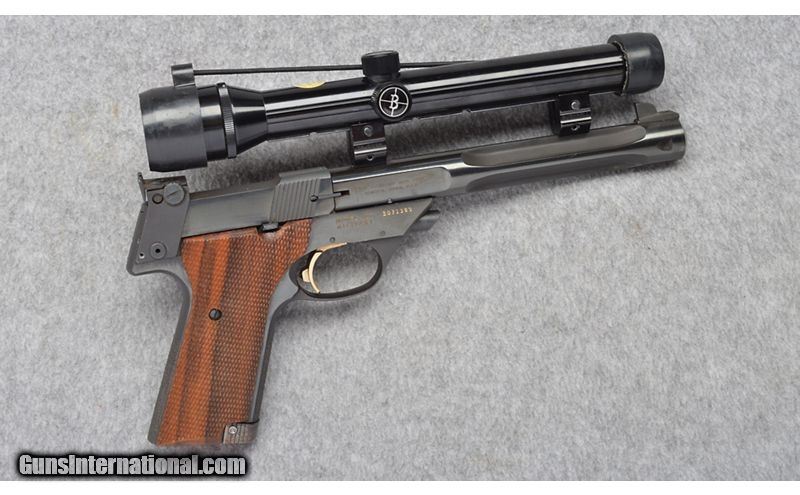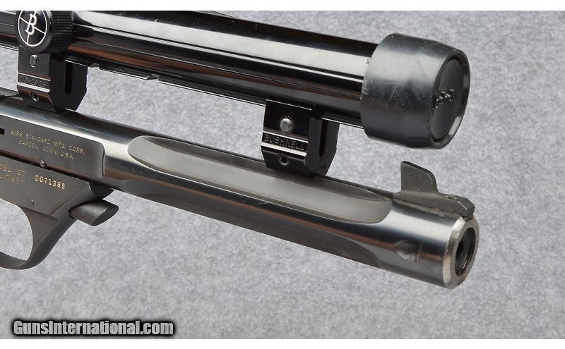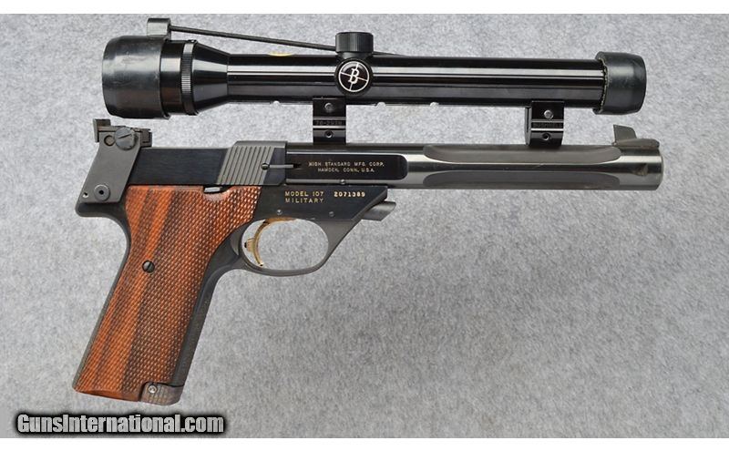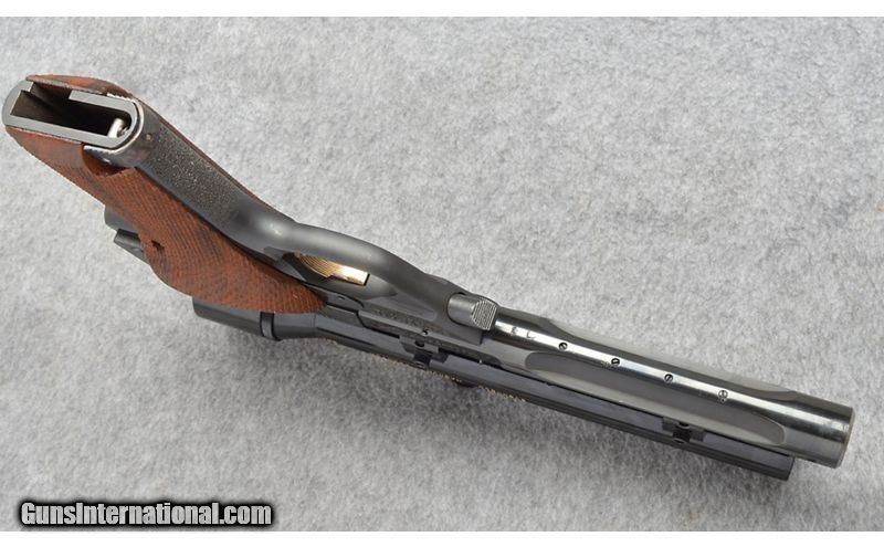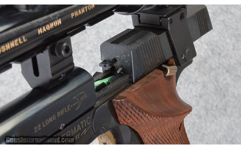 Description: Model 107 Military Supermatic Trophy. Clean pistol shows slight edge wear and few scattered minimal scratches. One 10 rd magazine. .22 Long Rifle SOLD Metal Condition: Blued Wood Condition: Checkered Walnut w/ Thumbrest Bore Condition: Bright Sharp Barrels: 7.25 " Fluted Barrel Triggers: Adjustable Weight: 55 oz Sights: "Adjustable Target Sights, Bushnell Magnum Phantom 2.5X Scope Item Location: Buda, TX |