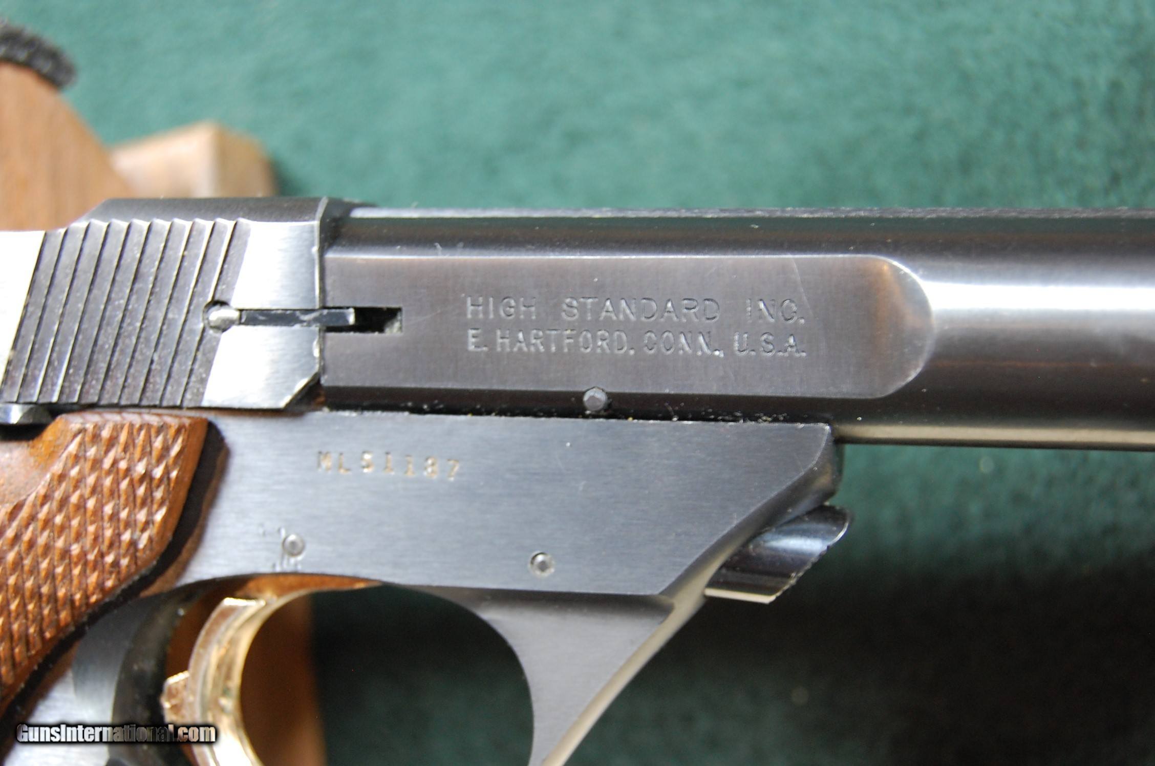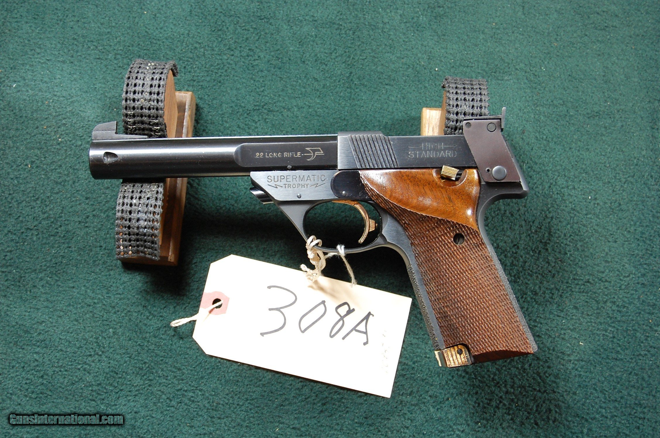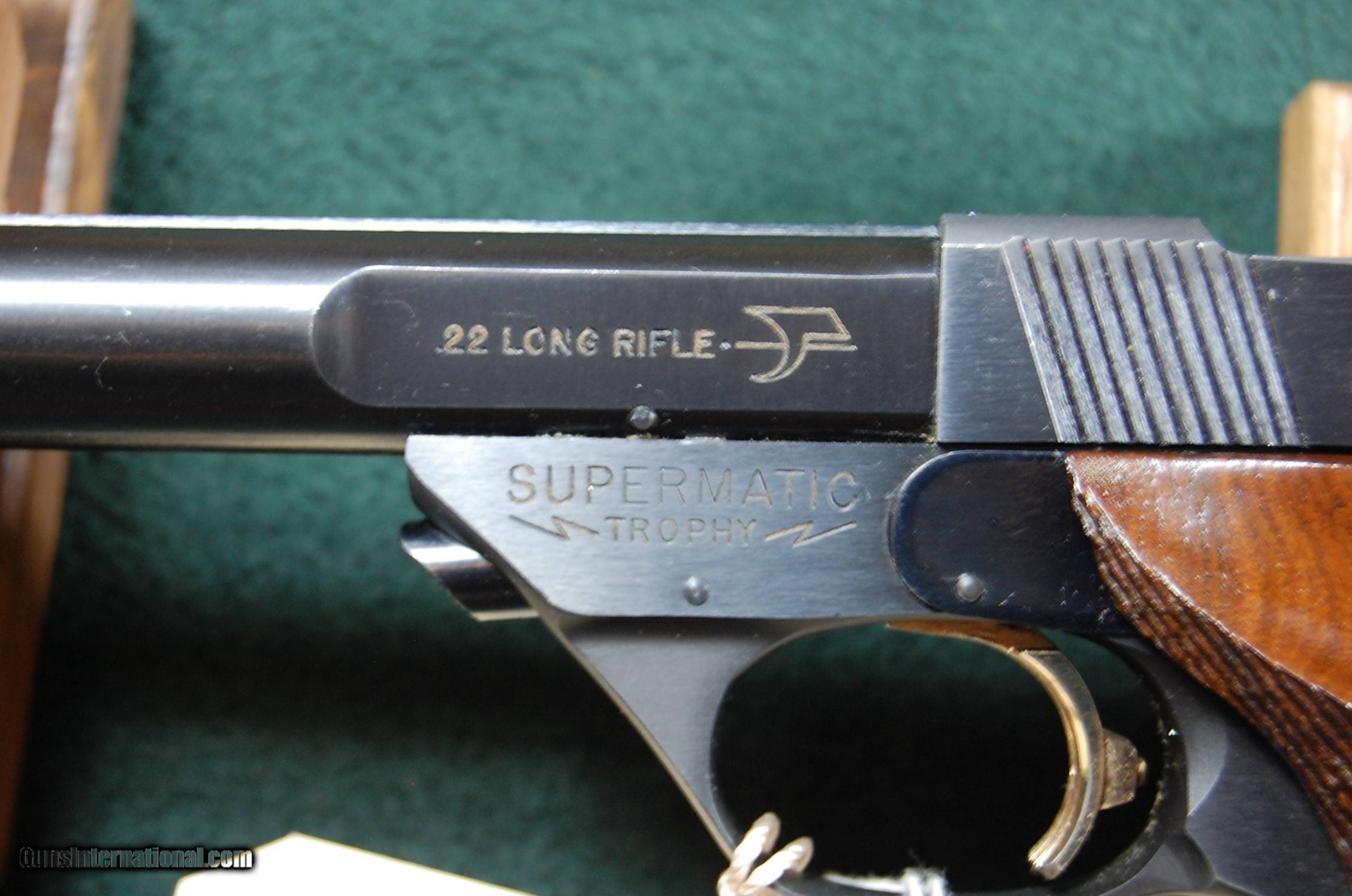 Description: Rare High Standard Supermatic Trophy in mint condition. 5.5" barrel Original box This gun is 99% ( IF it has been fired, it was only a couple of rounds) SOLD Manufacturer: High Standard Model: Supermatic Trophy Serial Number: NL51187 Caliber Info: .22 LR Condition: Mint Metal Condition: Mint Wood Condition: Mint Bore Condition: Mint |