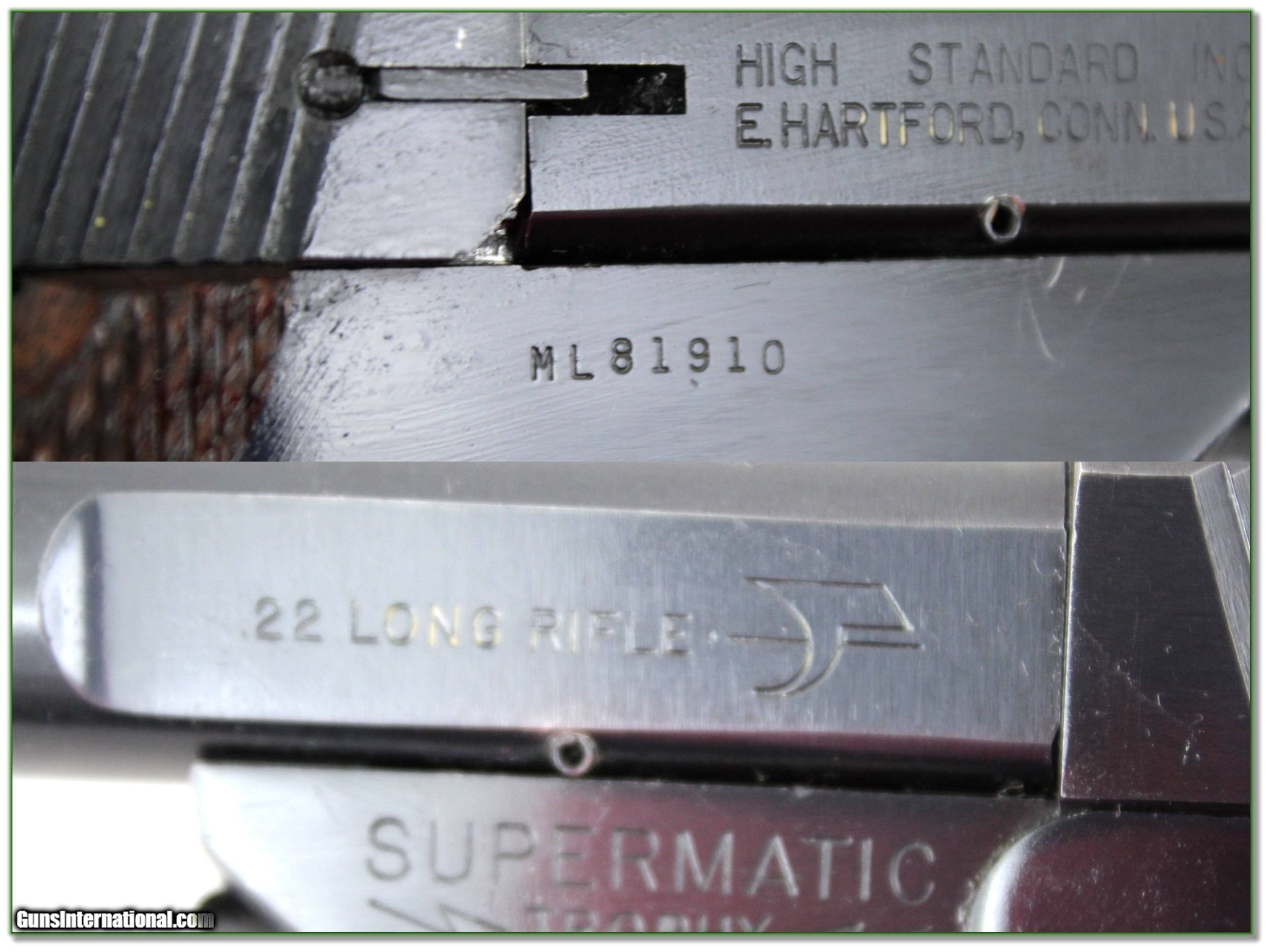 Description: Collectors, this is an excellent collector condition High Standard Supermatic Trophy 22LR. I see no marks. It has a heavy fluted 7.25in barrel. I’m not sure you can find a nicer one! I am selling this one on consignment and as such lay-a-way can’t be used. It does of course have the standard 3-day inspection. Shipping and insurance is $39. Please email me with any questions or larger pictures. (Consign your quality firearms with Shooting Investments for only 12%! Let me know if you have any you would like to sell!) 22-1083 Payment: Payment is by Money Order, Cashiers Check or Personal Check. I can now also accept Credit Cards (MasterCard, Visa, Discover & American Express) with a 3% convenience fee. Shipping: The shipping charge will be listed in each description. It is $49 for most long guns. Some heavy guns, over 48in boxes or those insured for over $2000 will be higher. Shipments to Alaska and Hawaii are higher because air shipment is required. Most firearms are shipped on Tuesday and Thursday and usually in 5 days of receipt of payment. We package all shipments carefully and insure them. Optics are shipped Priority Mail and most other non-firearm shipments are shipped First Class. Returns: Our return policy is simple. If for any reason you are not pleased with your purchase, you may return your item for a full refund of purchase price. Ammunition cannot be returned. It is important to us that you are happy. Guns cannot be fired or dissembled before returning them and they must be returned in the same condition as received. Notification of a return must occur with-in 3 days of receipt at your dealer. Shipping, convenience and dealer fees are not refundable and are the responsibility of the buyer. Lay-a-way: If needed, we offer a 60 day lay-a-way option on most firearms. It is 1/3 now, 1/3 in 30 days and 1/3 in 60 days. Lay-a-way firearm sales are final and if not completed the first payment cannot be returned. Consigning your firearms with Shooting Investments: We will help you get top dollar for your firearms. While most local guns shops charge 20% or more, our fee is only 12% with a minimum of $75. At your local gun shop it might take months to sell. Selling on-line provides instant access to thousands of interested buyers. You won’t find any other on-line dealer willing to sell your firearms for only 12% or listing every gun on 3 separate s. Selling through an House typically costs the seller 15% and the buyer an addition 15% (so 30%) and you have to wait several months to sell and longer to receive funds. If properly priced, we will sell your firearms in a few weeks. Send us an email or give us a call and we’ll explain how easy it is for you to get top dollar. Trading: Trading for use is really just buying your gun to re-sell. If you have a gun you want to trade, please email a picture and we will let you know what we can give or it. You will always get more if we sell it for you on consignment. Help for California Buyers: We are happy to ship to California. It is the buyer’s responsibility to make sure any item you buy is legal in your state. We are also happy to help with your purchase of a firearm from someone other than us. If you see a gun you would like to buy but the seller can’t or won’t ship to California they can ship to use and we’ll then ship it to your California dealer. The cost for this service is only $30 + shipping. Let us know if we can help! SOLD |