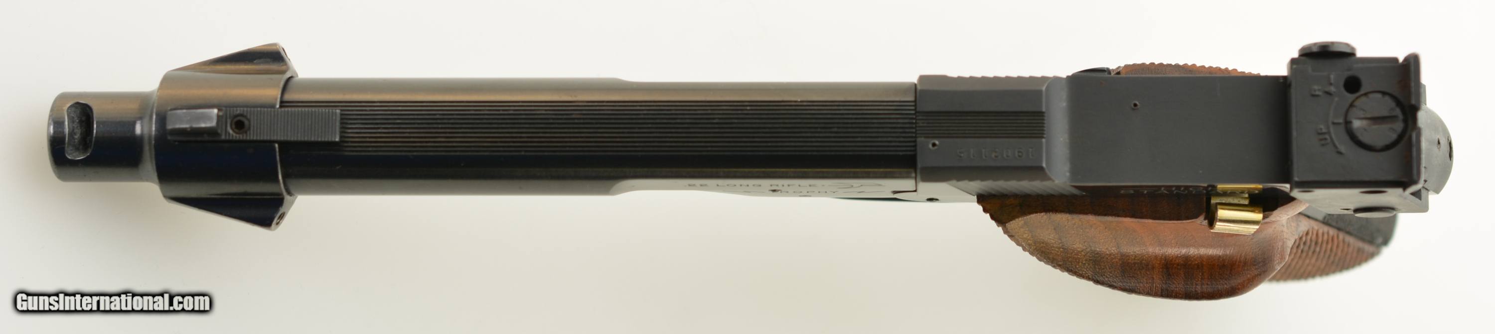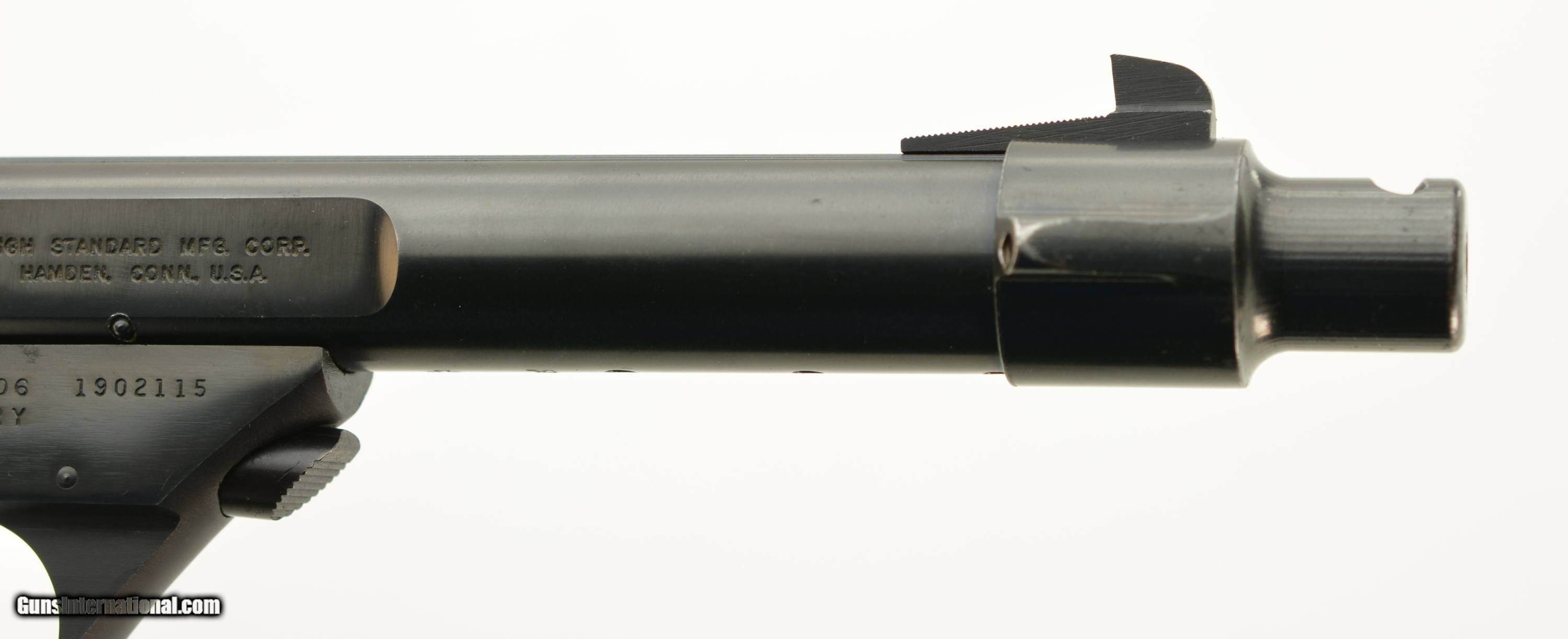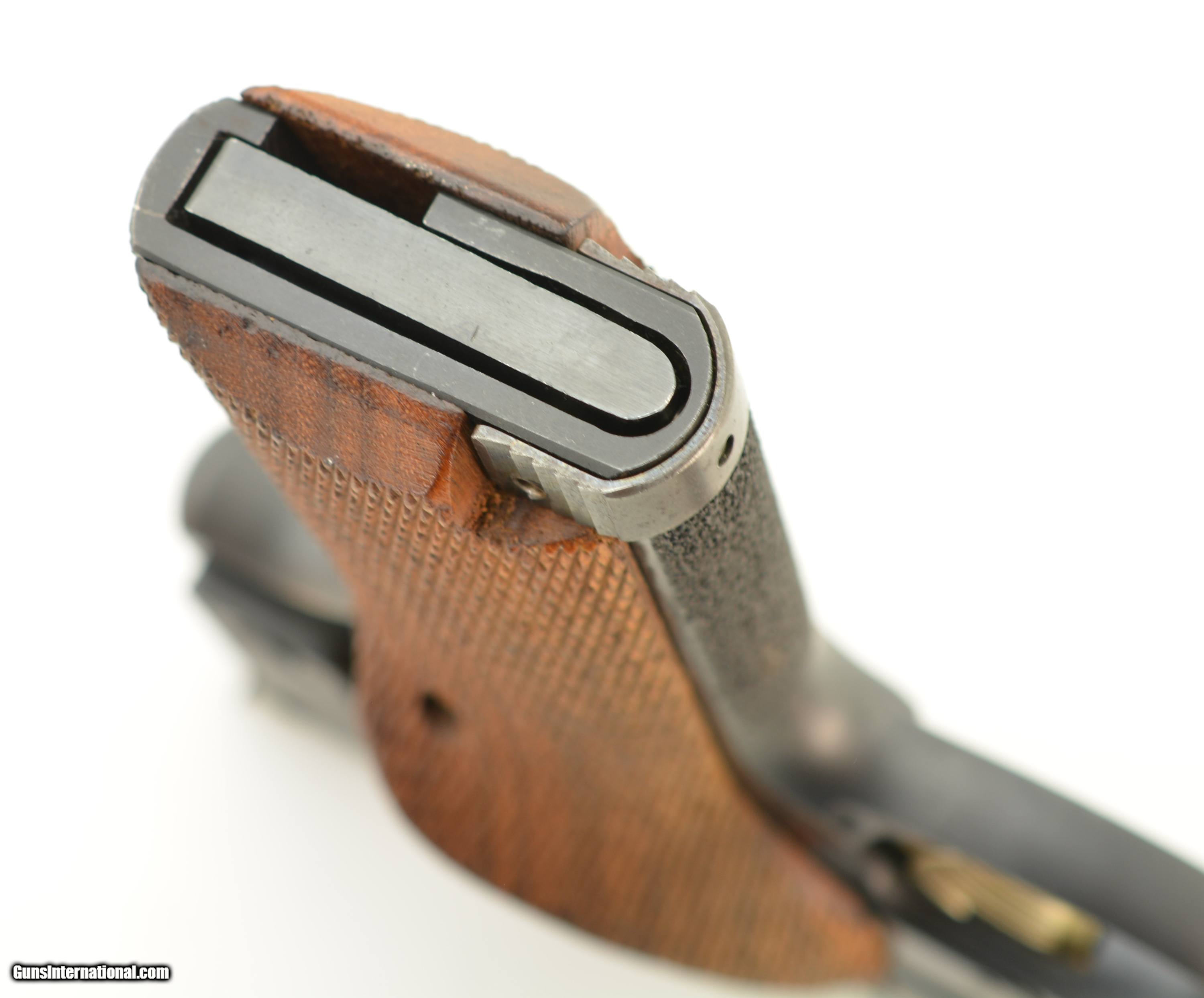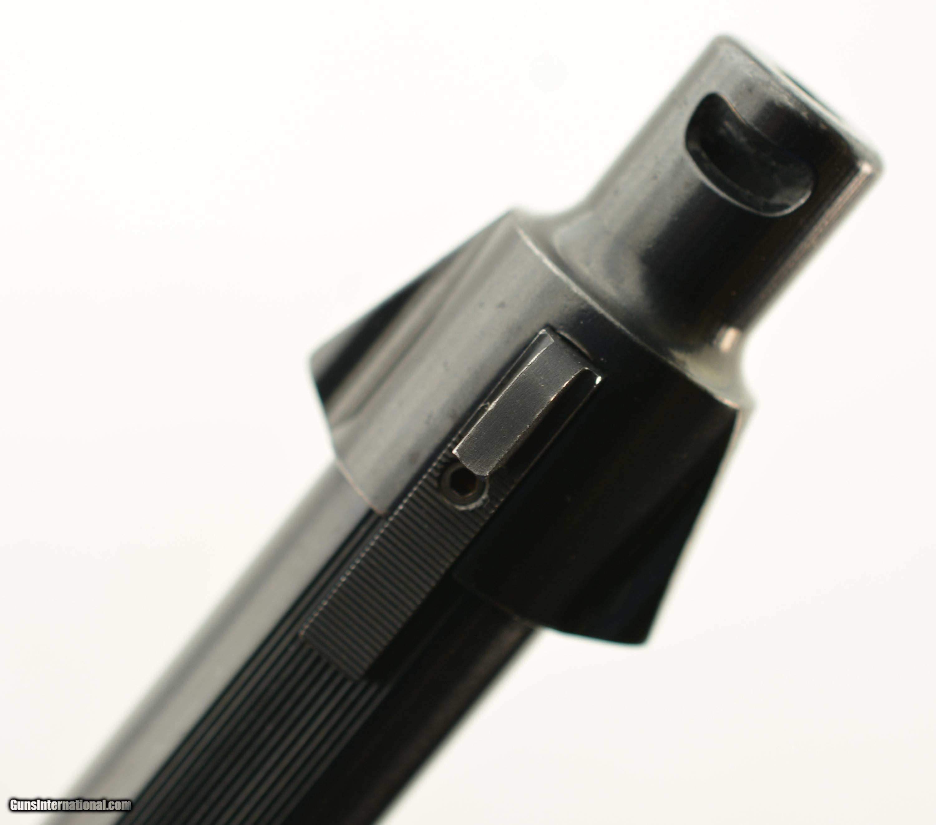 Description: Serial #1902115, .22 LR, 5 1/2" heavy target barrel with an excellent, bright bore. This is a handsome, Model 106 pistol that retains 97-98% of the original blue finish with some very slight silvering along some of the high edges, and on the bearing surfaces. Most of the blue loss occurs on the removable compensator installed on the bull barrel (an unusual combination). The trigger and safety have virtually all of the original gold finish remaining, and the magazine release retains nearly all of the original dark color case-hardening. The checkered walnut grips, with right-handed thumb-rest, are in excellent shape with very little wear and almost no flattening of the points. A single original magazine is also included and the pistol rates excellent condition overall. FFL or C&R SOLD Manufacturer: High Standard Model: Supermatic Serial Number: 1902115 Caliber Info: .22 Gauge Info: .22 |