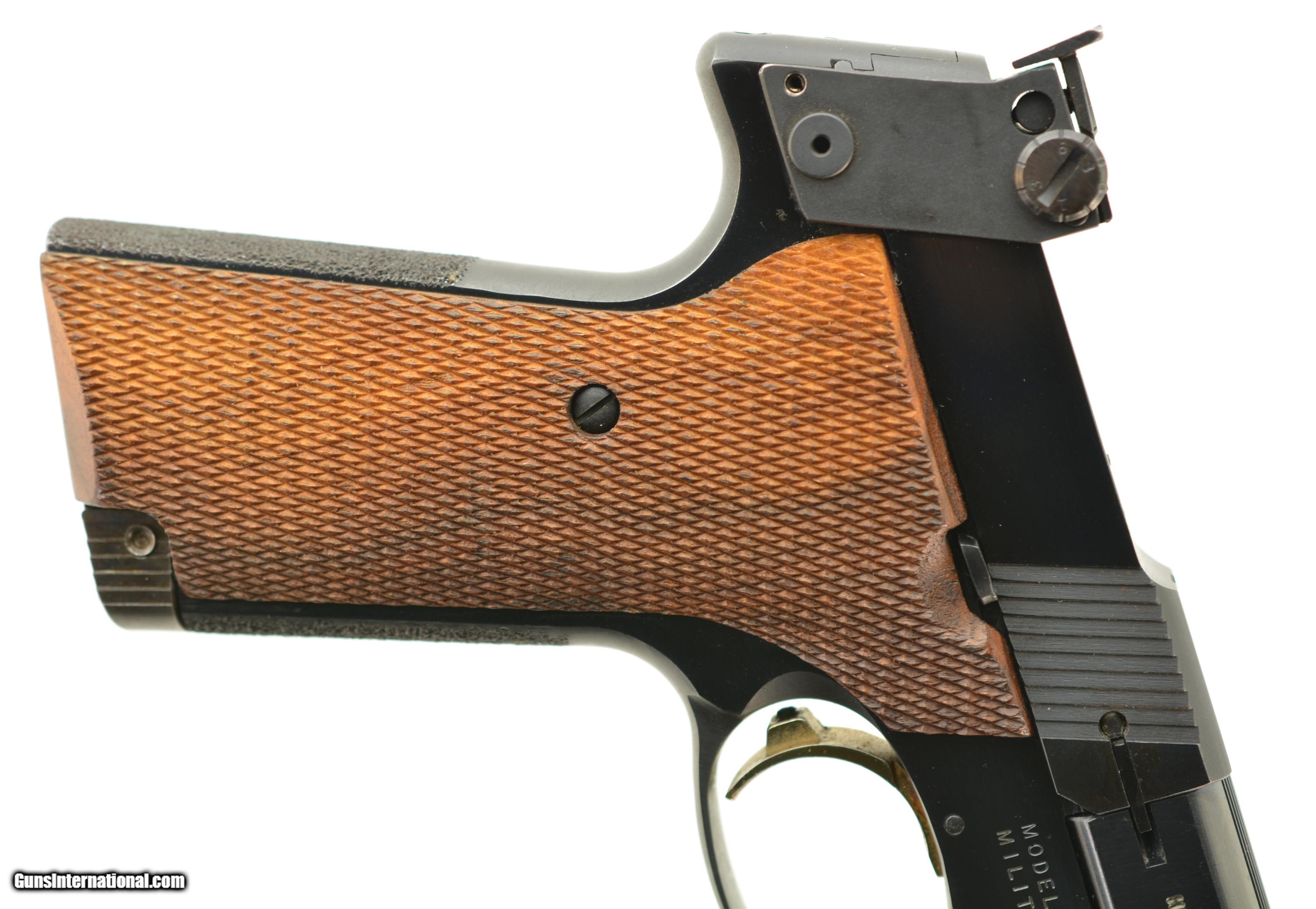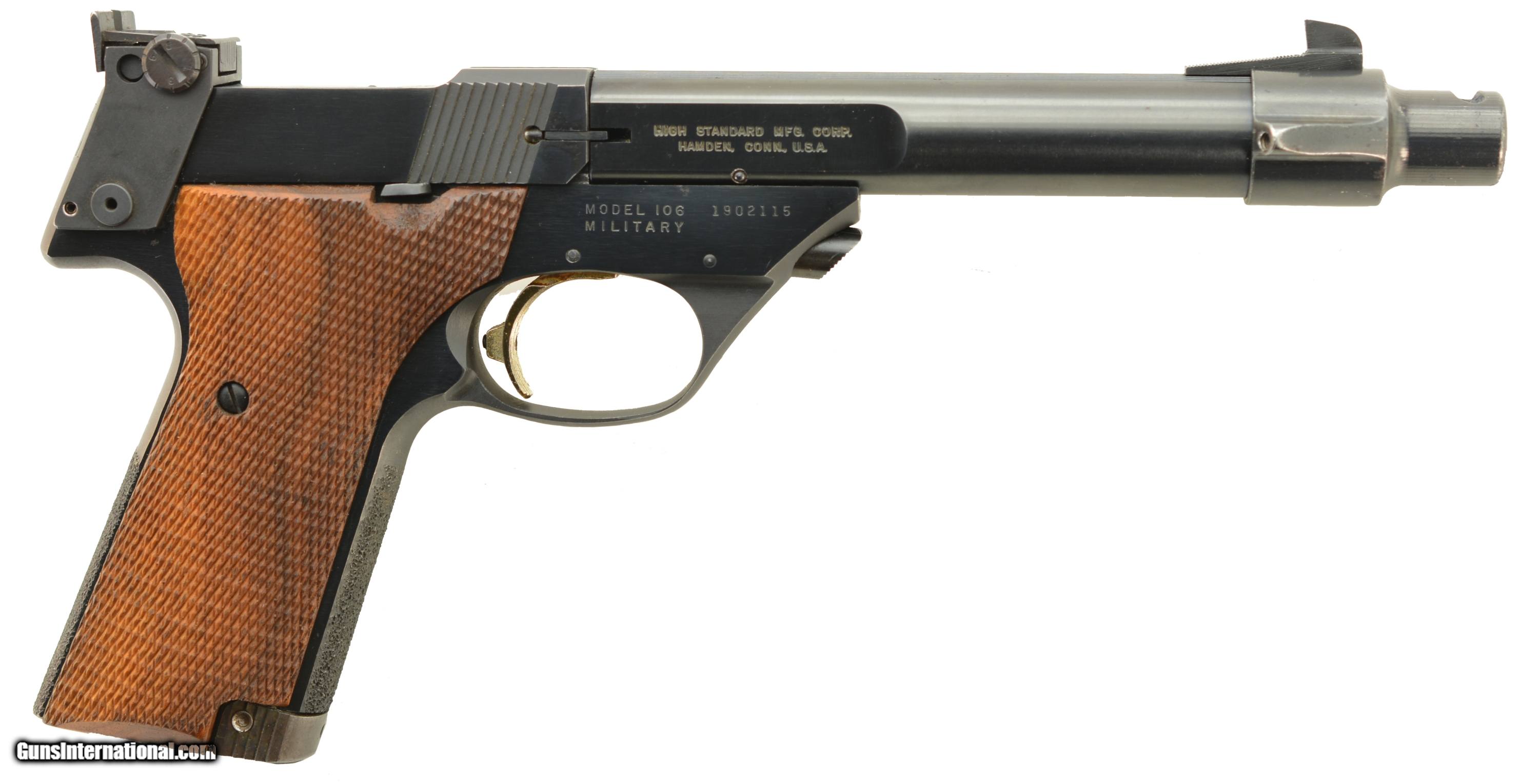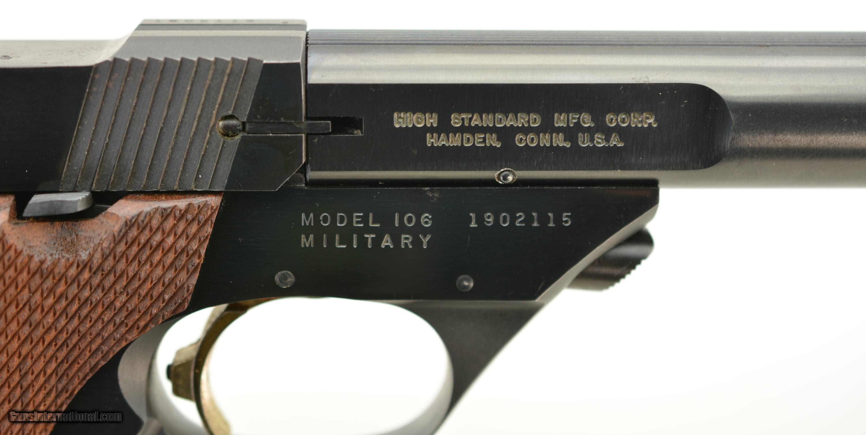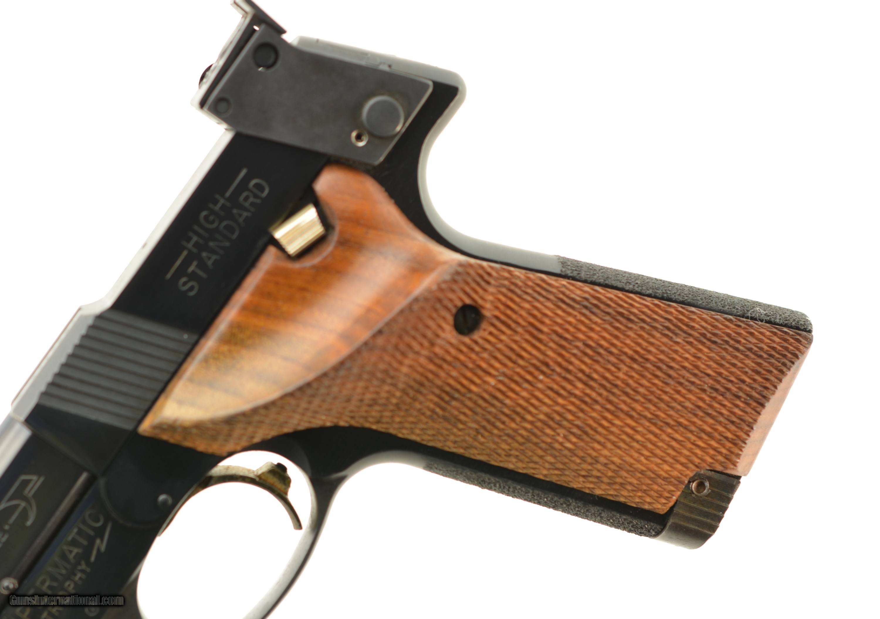 Description: Serial #1902115, .22 LR, 5 1/2" heavy target barrel with an excellent, bright bore. This is a handsome, Model 106 pistol that retains 97-98% of the original blue finish with some very slight silvering along some of the high edges, and on the bearing surfaces. Most of the blue loss occurs on the removable compensator installed on the bull barrel (an unusual combination). The trigger and safety have virtually all of the original gold finish remaining, and the magazine release retains nearly all of the original dark color case-hardening. The checkered walnut grips, with right-handed thumb-rest, are in excellent shape with very little wear and almost no flattening of the points. A single original magazine is also included and the pistol rates excellent condition overall. FFL or C&R SOLD Manufacturer: High Standard Model: Supermatic Serial Number: 1902115 Caliber Info: .22 Gauge Info: .22 |