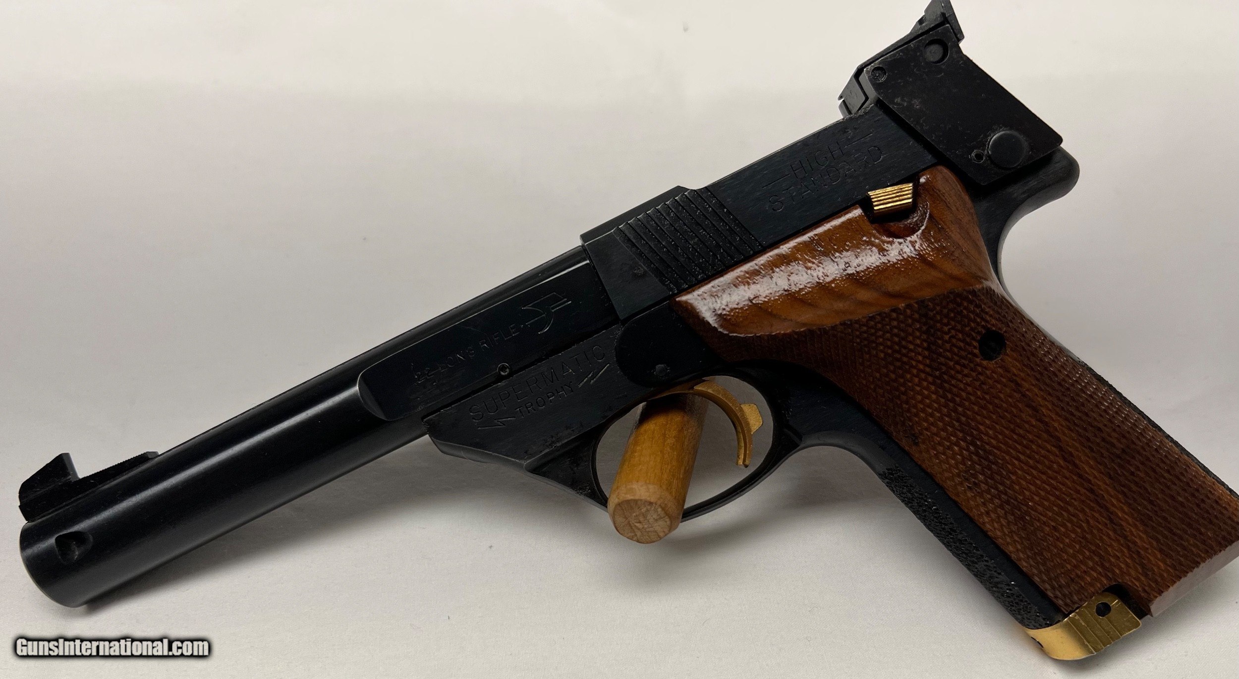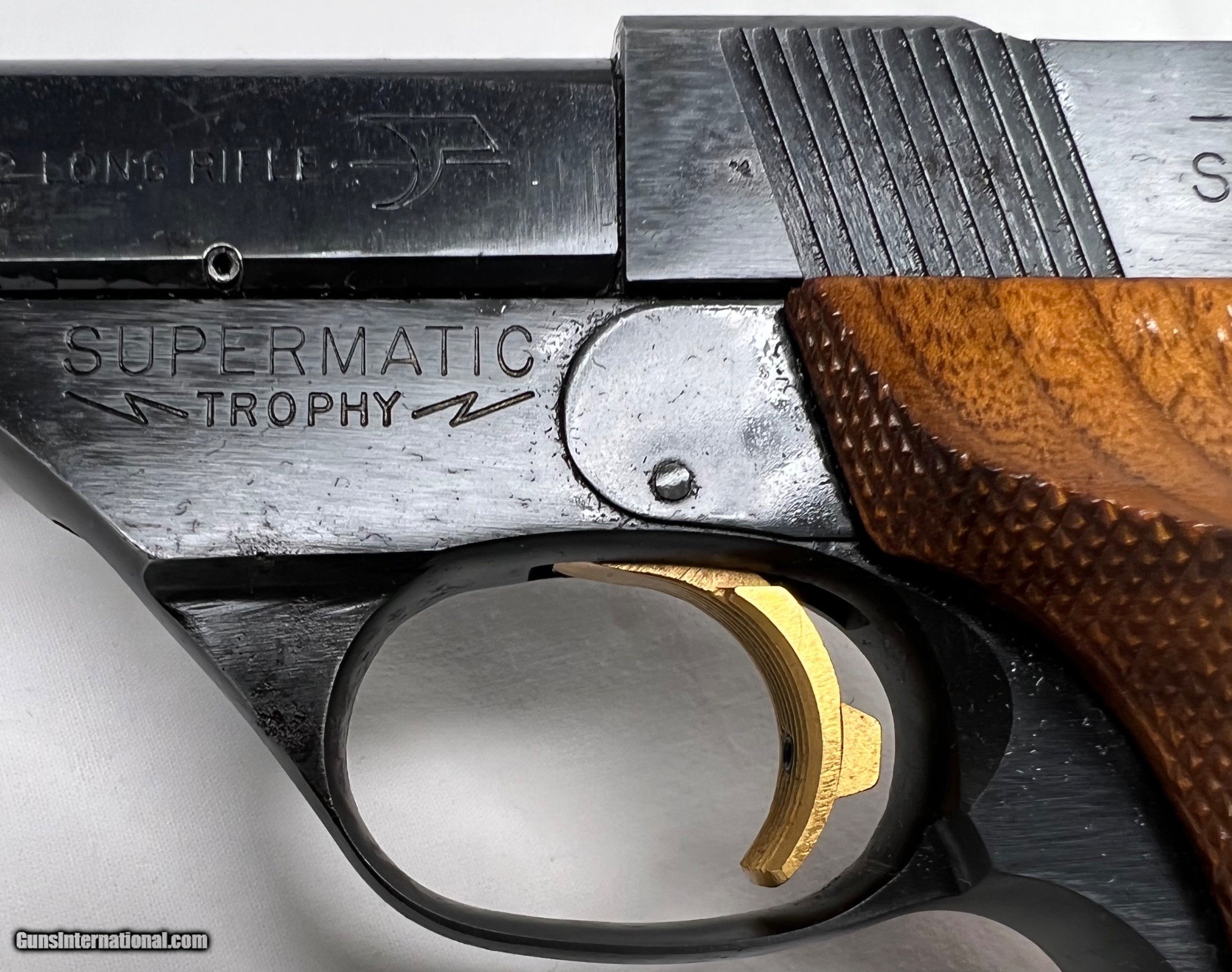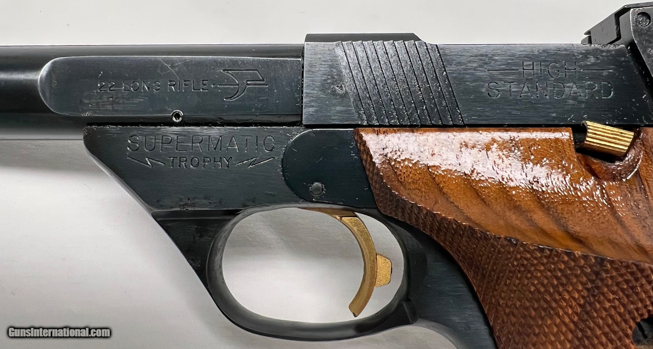 Description: Gentleman, for sale is a High Standard Supermatic Trophy Target semi auto rim fire 22 caliber pistol. This quality piece made was made in the USA in Hartford, Ct. Specifications as follows: item has a 6” barrel, adj. sights ,bright blued finish, bull bbl, gold trigger, and wooden grips . The serial # SH 20595. This piece is in excellent condition. The bore is very good too. Comes with the original High Standard 10 shot clip. The only issues are there are a couple of minor spots on the frame that I tried to show on the last picture. This pistol is an accurate shooter as well as a great collectible item. Great pic's attached. Thanks for looking. Any questions call Greg 315-481-8005 Gentlemen, lowered the price on this great piece by $50. Please act quickly as going to Florida for the winter on 12/22. Thanks Greg SOLD Handgun Caliber: .22 Long Rifle Manufacturer: High Standard Model: Supermatic Trophy Barrel Length: 6 Condition: Very Good Metal Condition: Very Good Wood Condition: Excellent Bore Condition: Excellent Action: Semi Auto |