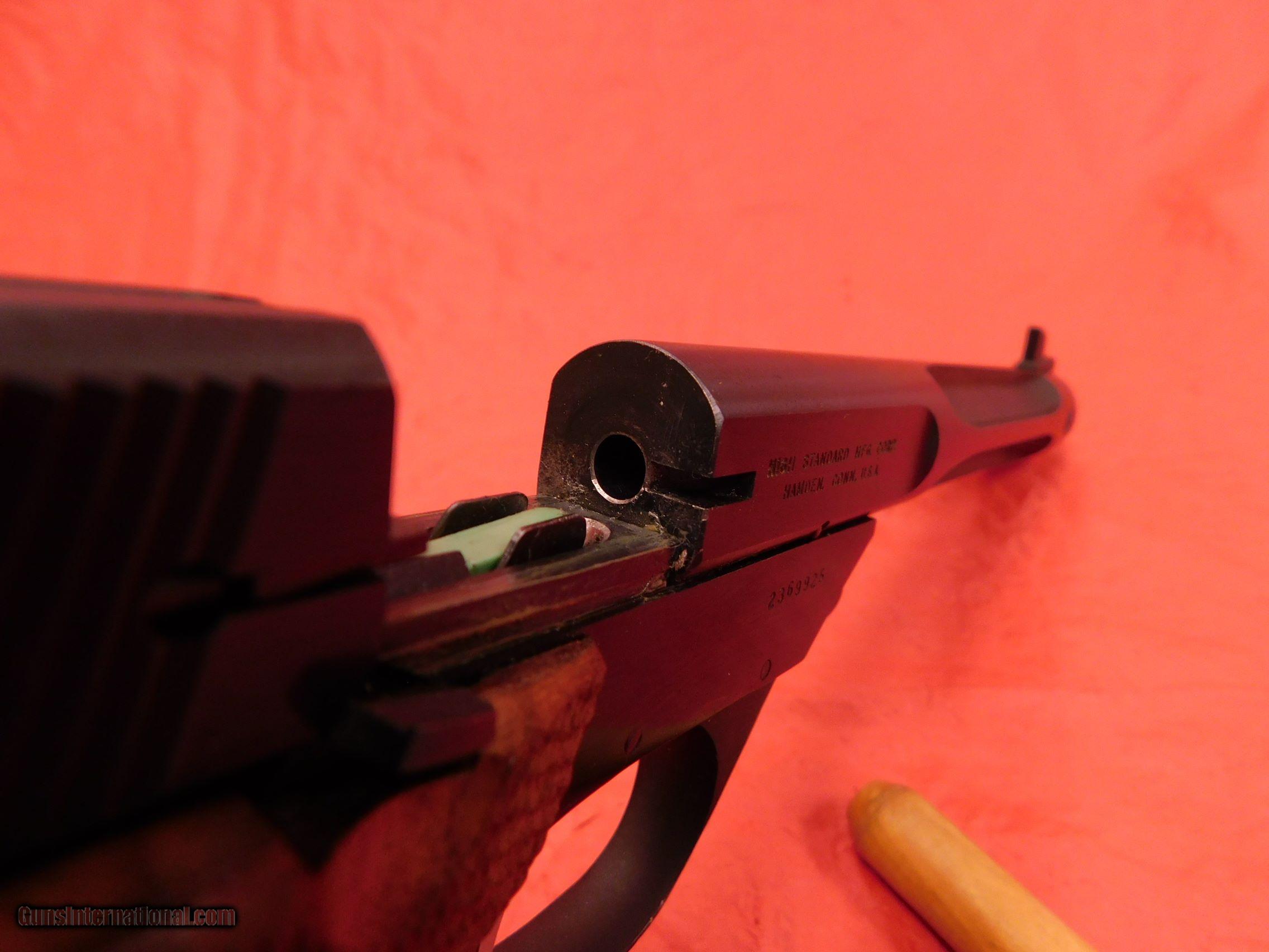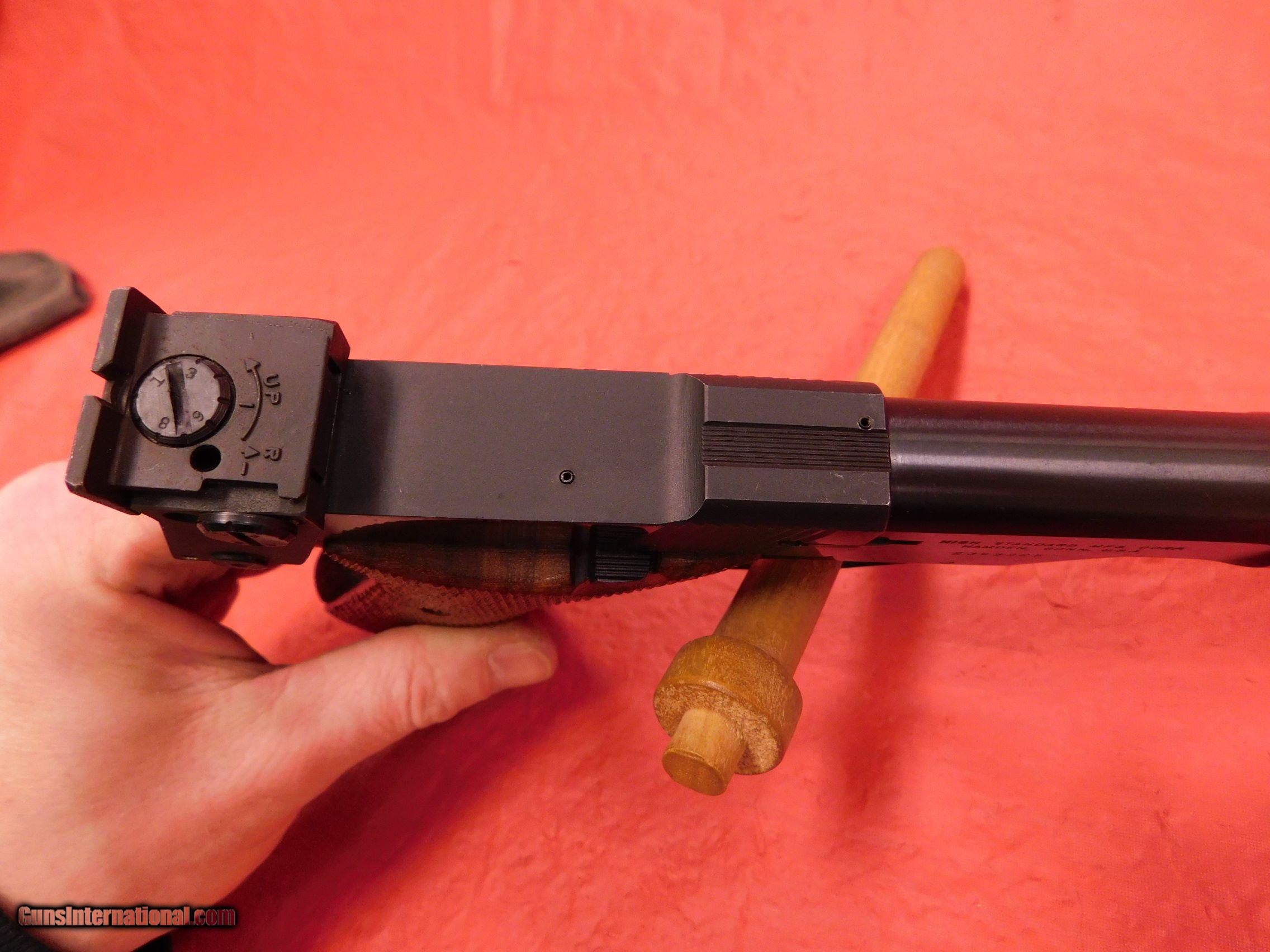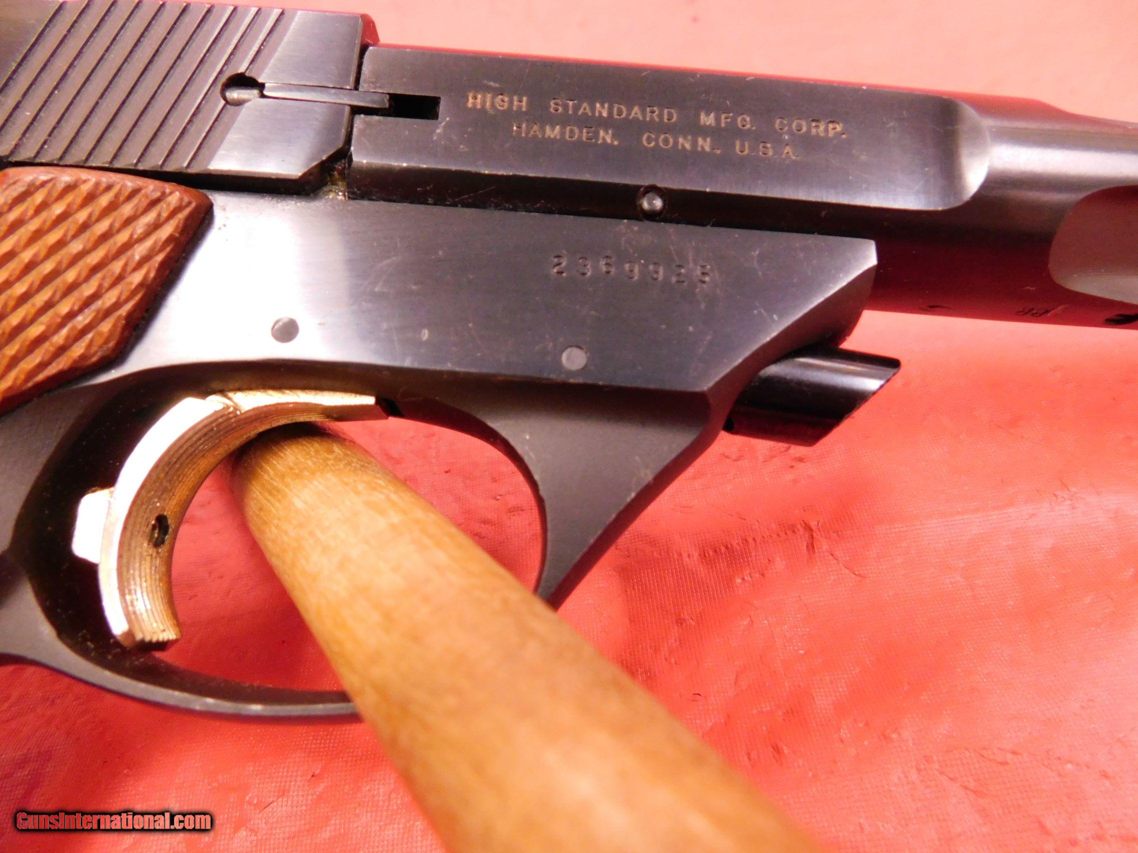Description: High Standard Supermatic Trophy 22lr 7 1/4" bbl, used, great condition, some handling marks, made in Hamden, serial #2369925, excellent bore, no evidence of being dry fired, grips in excellent condition, nice target gun. Only $600 $25 shipping and NO cc fees. Please ask for Steve 716-833-2581. SOLD Manufacturer: High Standard Model: Supermatic Trophy Serial Number: 2369925 Caliber Info: 22lr Condition: used Barrels: 7 1/4 |