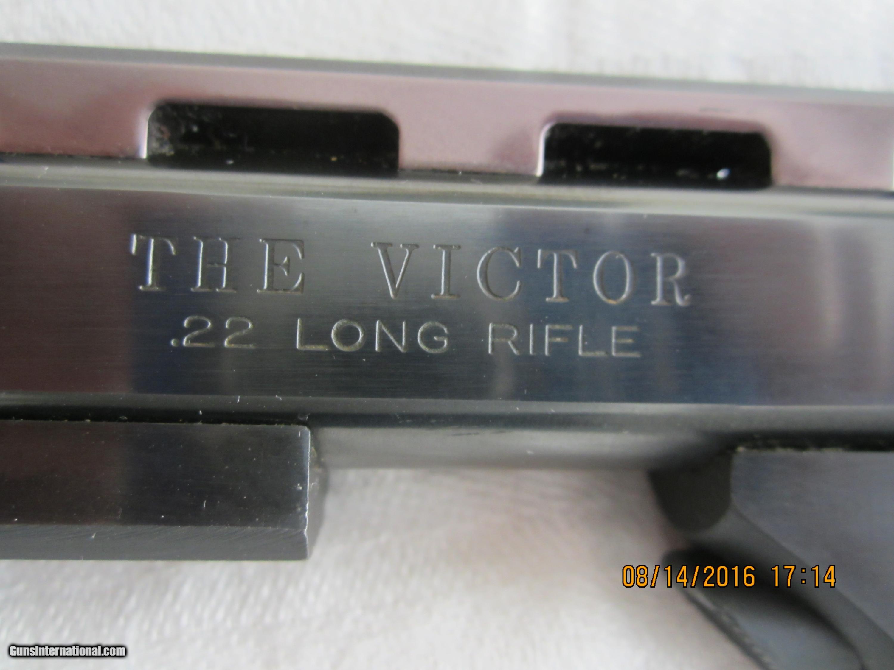 Description: Made in 1976, this was High Standards most expensive production Target Pistol. The metal is in 99% condition and the checkered walnut grips with a thumb rest on the left side are pretty close to 100 % condition. It has a 5 & 1/2" slab sided barrel topped by a grooved ventilated steel rib. ( not aluminum). The front and rear grip straps are stippled to provide a firm grip. It has a push button takedown provision. The rear sight is adjustable. This pistol comes with a second magazine, the original styro-foam container plus the cardboard box cover, a copy of the factory instruction sheet, a zip up case and one weight. SOLD Manufacturer: High Standard Mfg. Corp., Hamden, Conn. USA Model: THE VICTOR Military Model 107 series Serial Number: ML 22734 Caliber Info: .22 LR Bore: rifled Condition: 99 %+ Metal Condition: 99% Wood Condition: close to 100% Bore Condition: bright/shiney Barrels: one Barrel Type: slab sided 5 & 1/2 Action: semi-automatic Triggers: target type Stock: checkered walnut grips Finish: blued Sights: front & rear Manufacture Date: 1976 Engraving: none Extras: 2nd mag.,box,wt.,inst. sheet Case: zip up case Item Location: California |