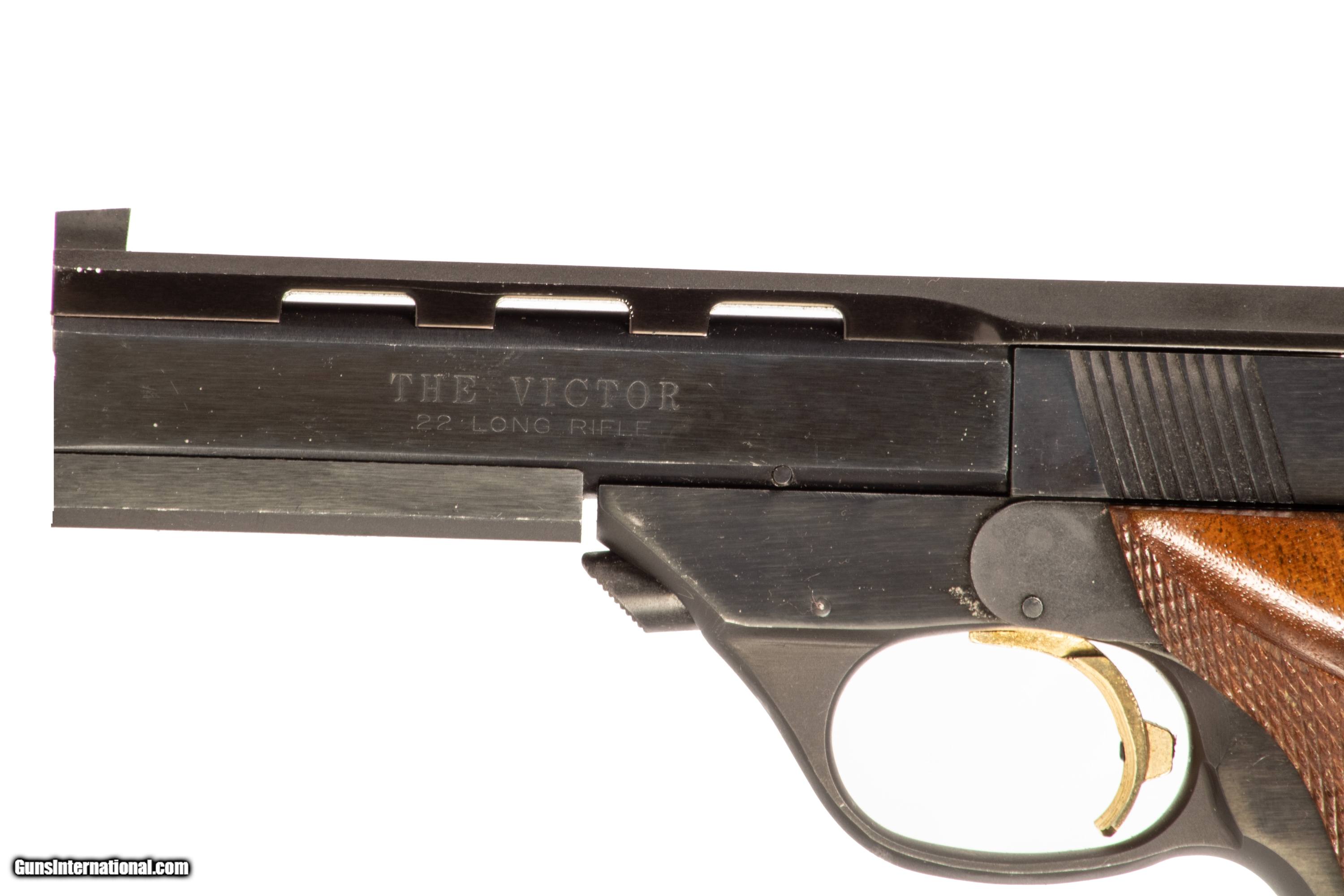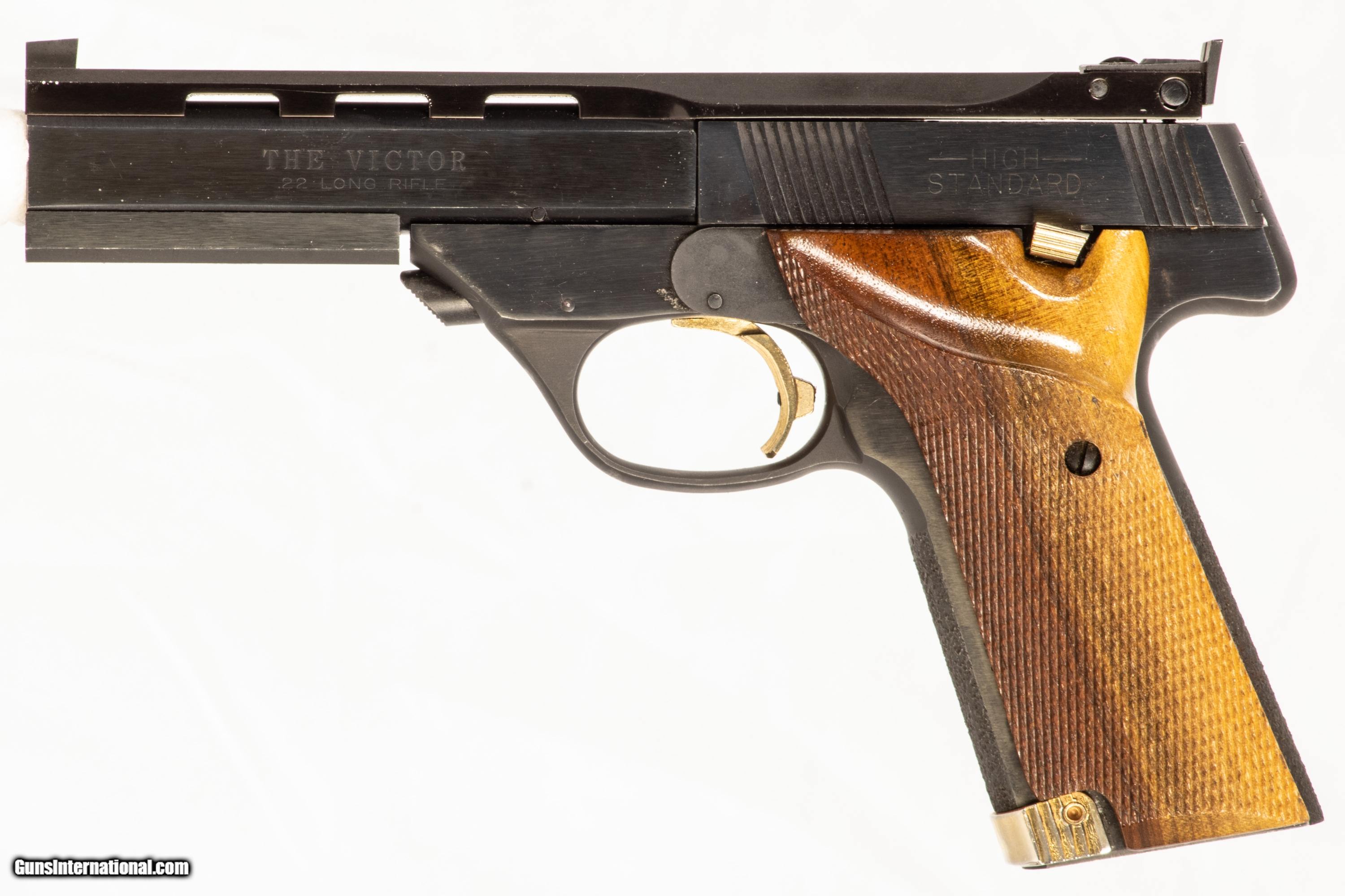 High Standard The Victor chambered in 22 LR with a 4 1/2 inch barrel and a bright & shiny bore. This firearm comes with 2 extra magazines. This firearm is in excellent condition and is covered by Dury's Lifetime Warranty.