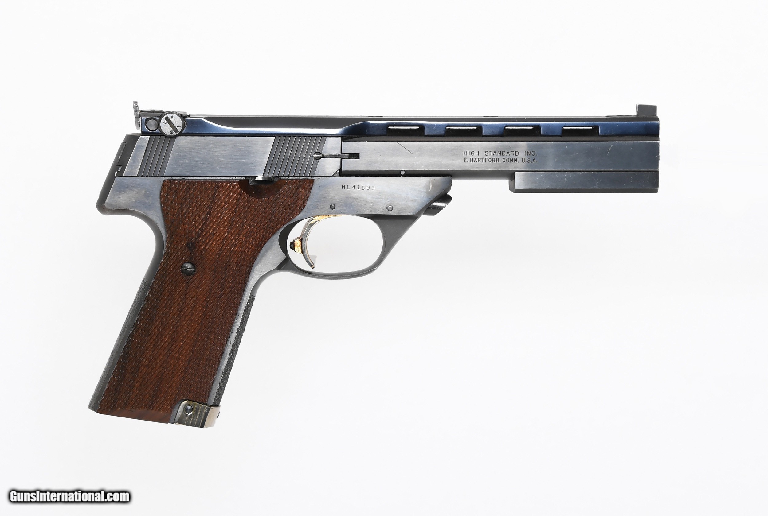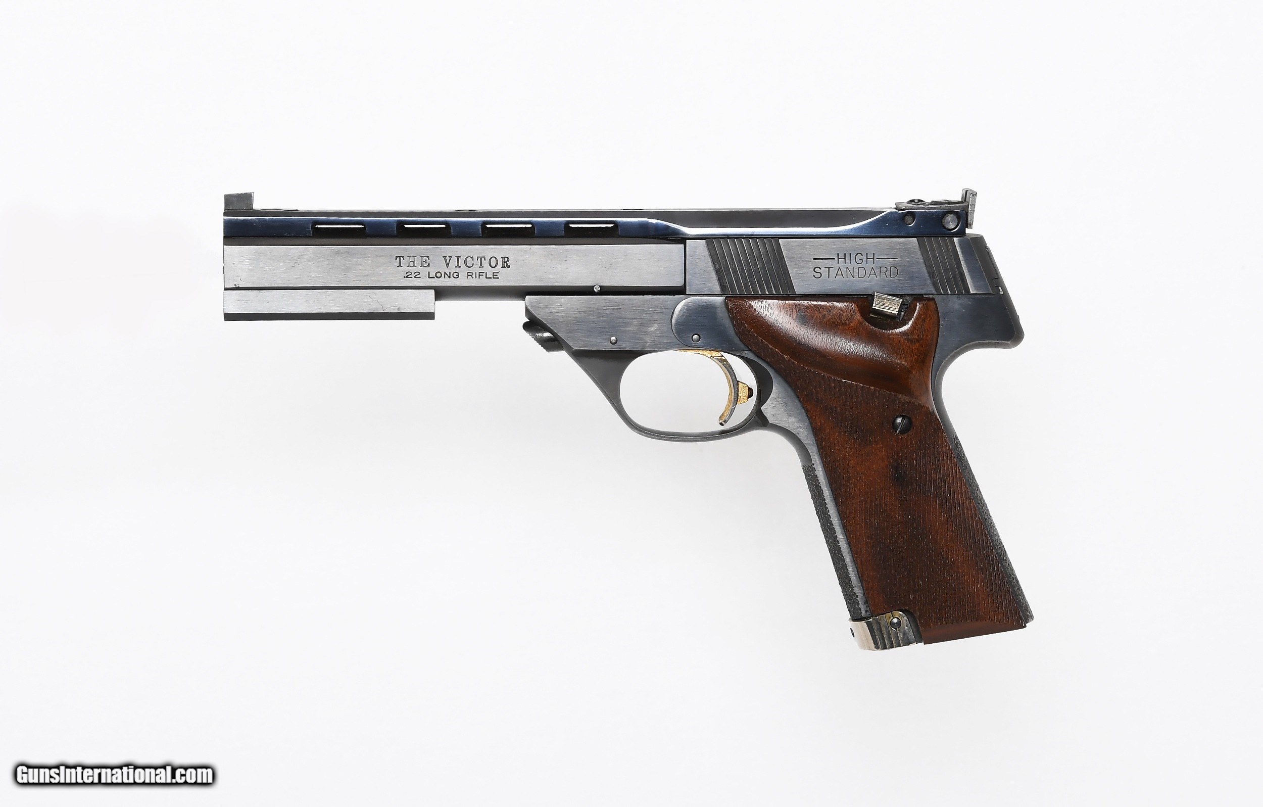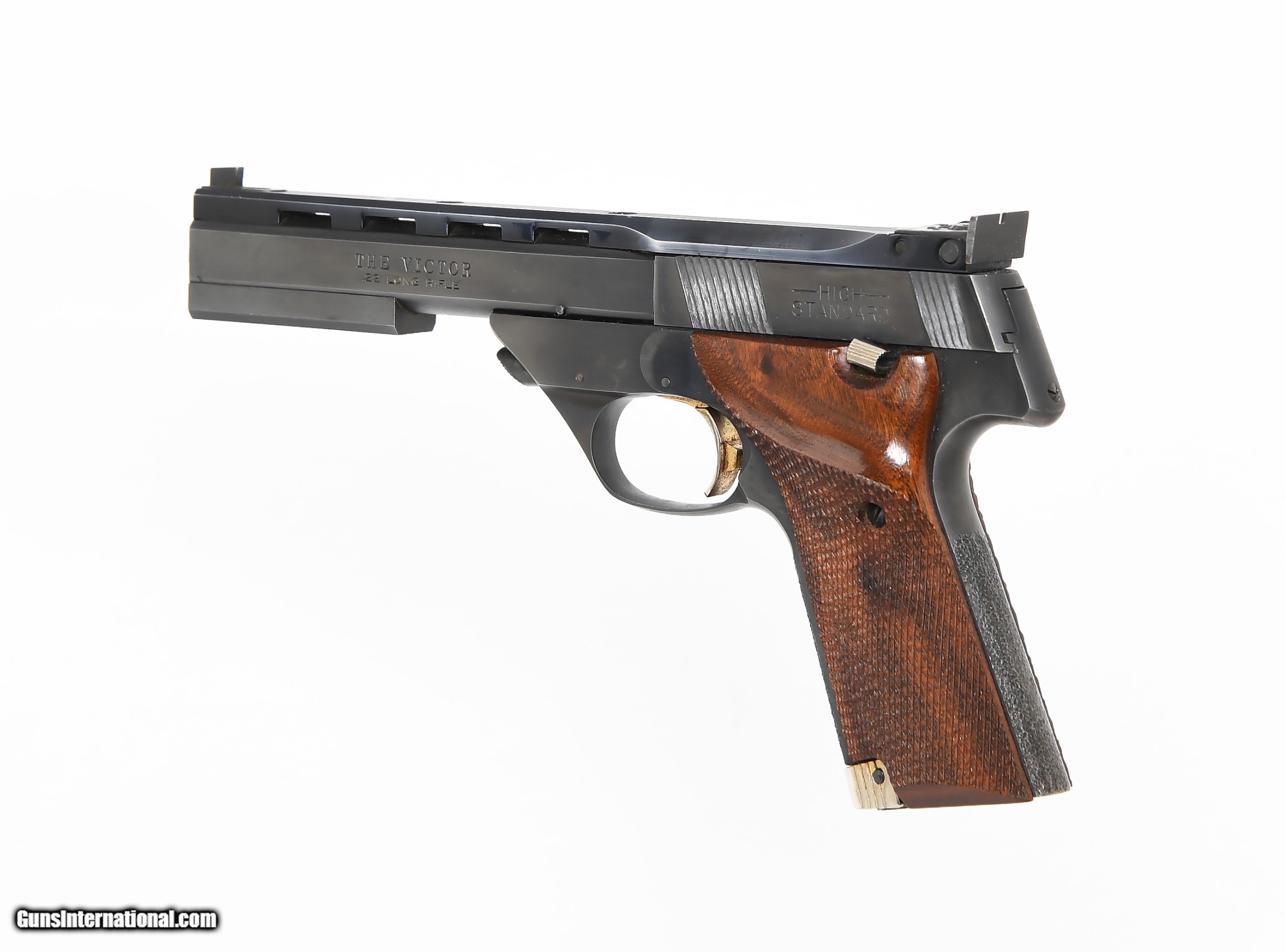 Description: SALE PENDING High Standard Victor model .22 lr target pistol. Always regarded as a very, very accurate pistol the HS Victor was one of the most widely used pistols in competitive shooting events. Mechanically excellent with a touch of wear and handling marks in places but still retaining 96% original finishes. Perfect bore $800.00 SN: ML41509 SOLD |