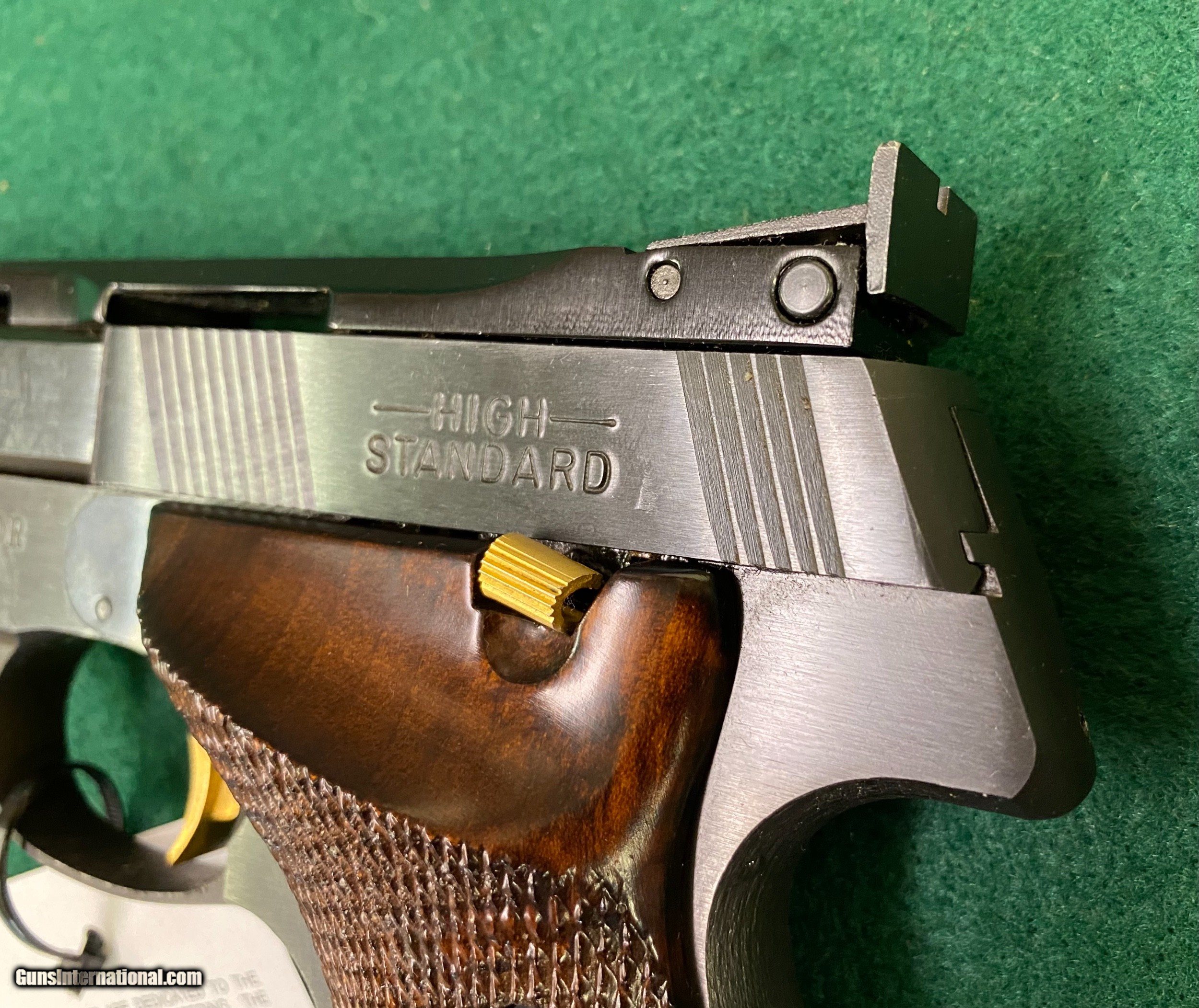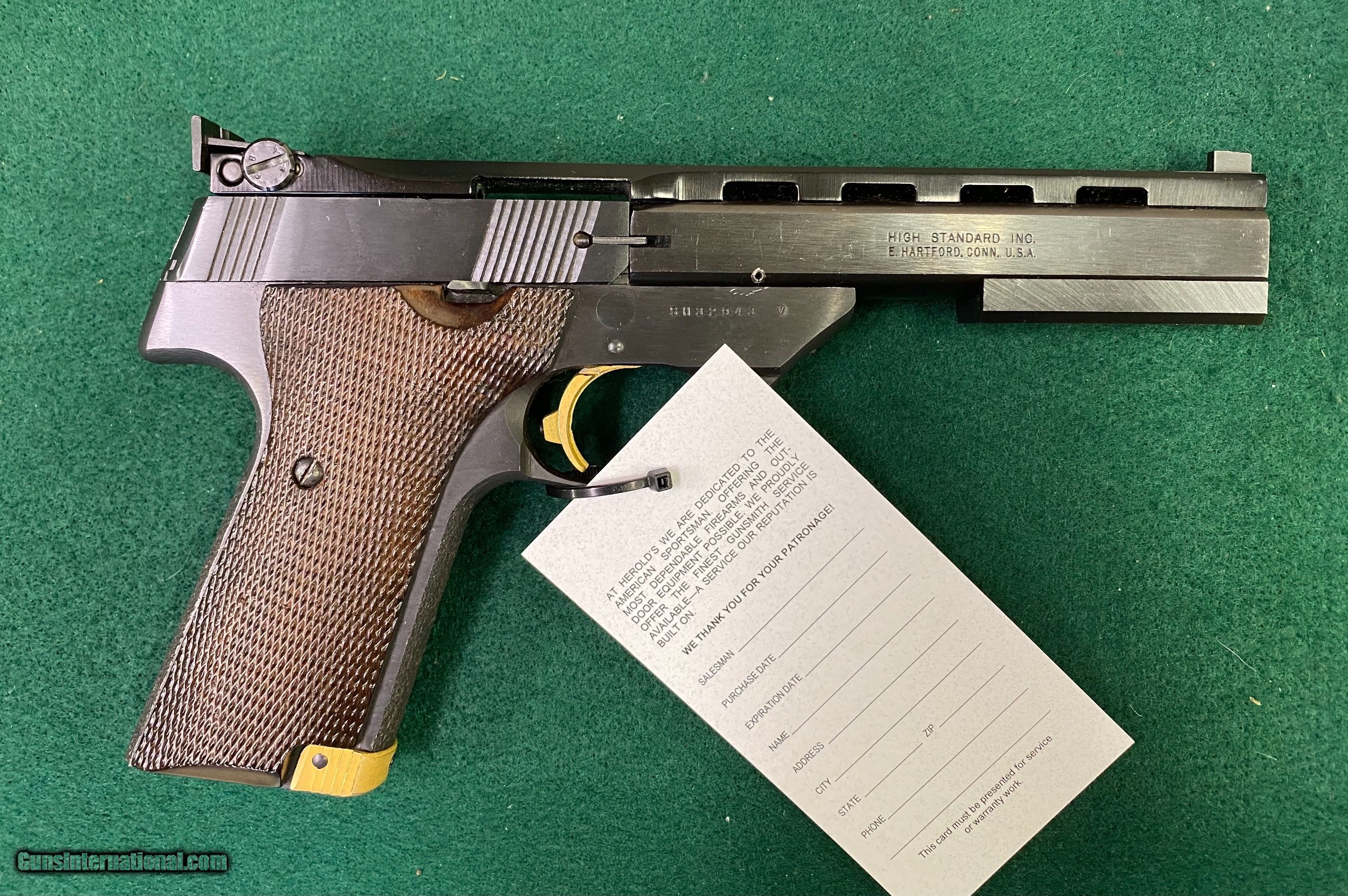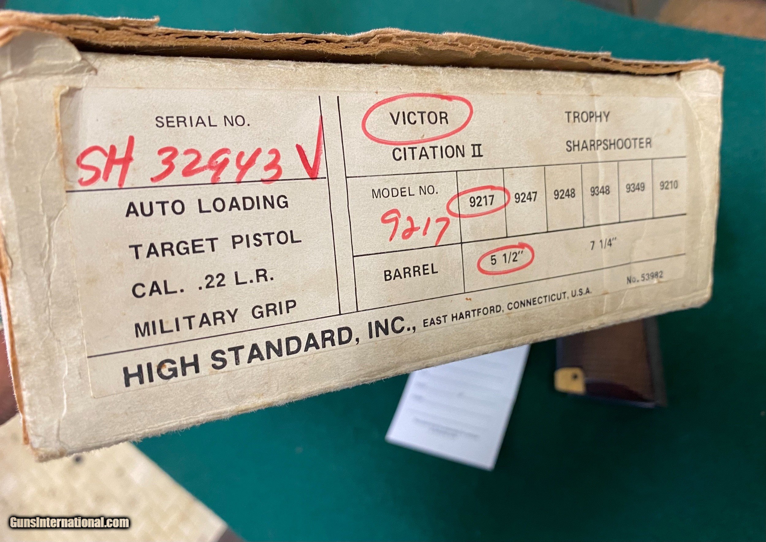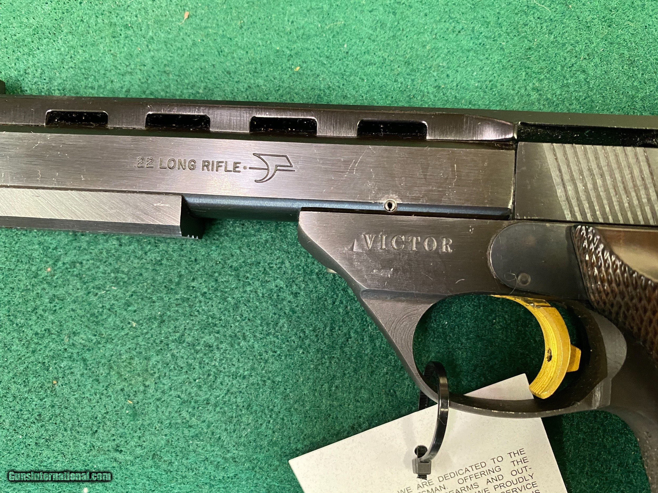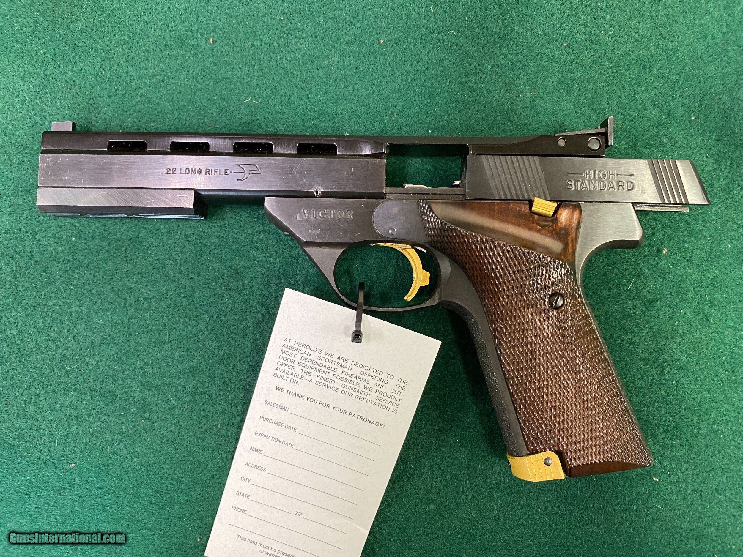 Description: This is a High Standard Victor in .22 LR in very good to excellent condition and comes with a box. Please see the pics, judge for yourself. We reserve the right to sell this item at our retail location until an offer is placed on Guns International. Once an offer is made, we pull this item from the display case. We accept major credit cards with a 4% surcharge. We will also take your personal check, however we do not ship the item until your check clears our bank. This may result in a slight delay in shipment. We have been extremely busy as of late with walk-in sales, please allow us three business days to respond to emails. We are open Tuesday through Saturday, 9 AM to 5 PM. Closed on Sundays and Mondays. We would like to thank you for your continuing patronage and support of our store during these trying and troubled times! SOLD Handgun Caliber: .22 Long Rifle Manufacturer: High Standard Model: Victor Serial Number: SH3294xx Barrel Length: 5 1/2 inches Condition: VG/EXC |