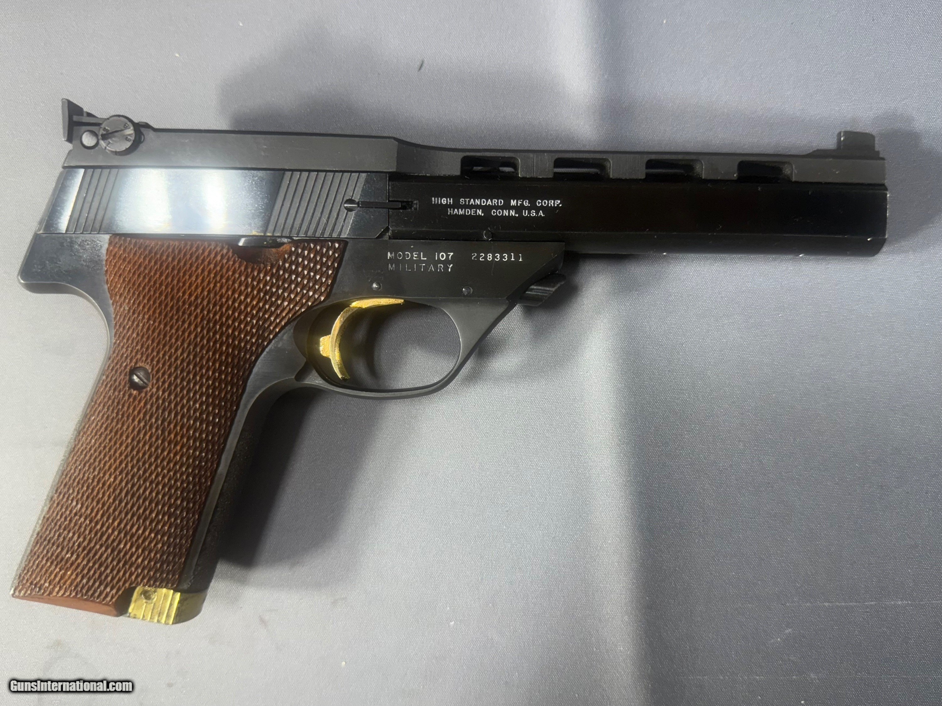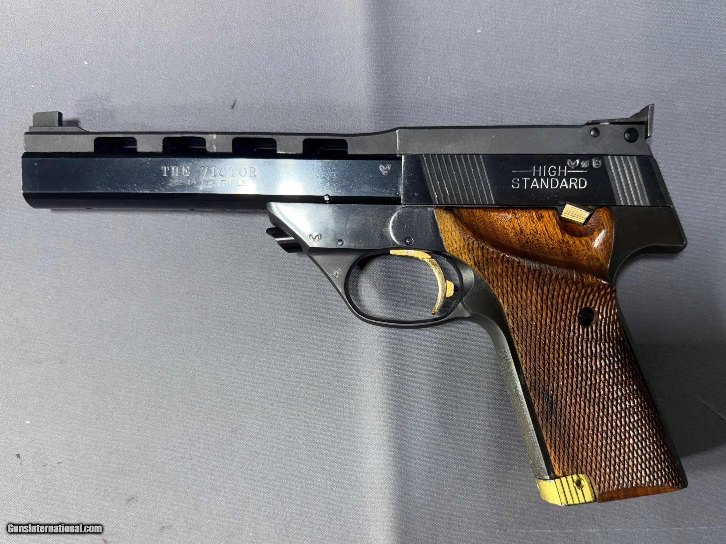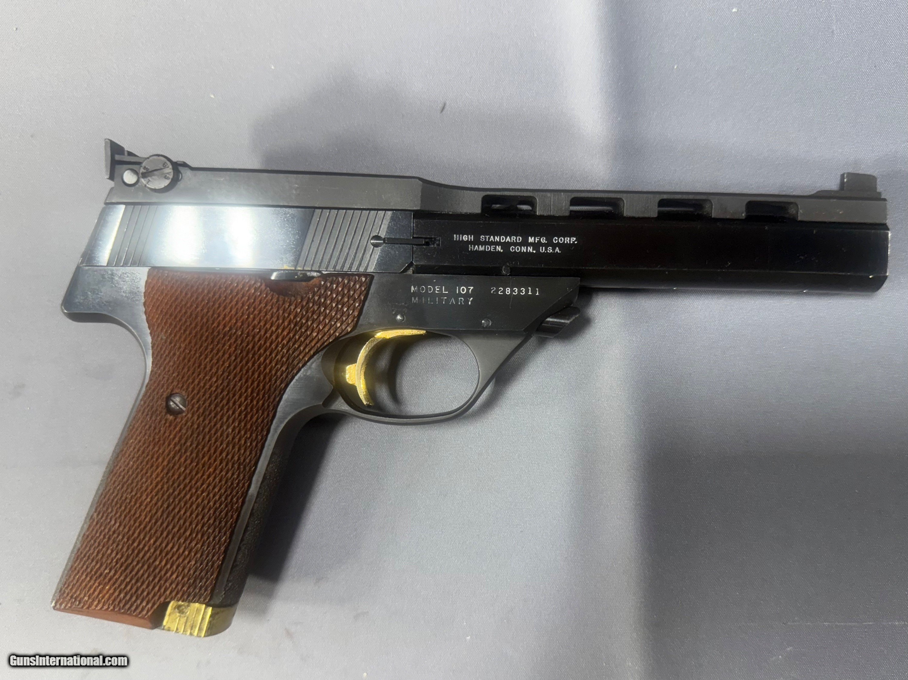 Description: High Standard Victor Military Model 107 22LR. Has German Proof Markings. Hamden CT manufactured. Includes 1 magazine and shipped in a plastic case. Gun in good condition with little use. This is a rare edition of the Model 107 with the German Proof Markings. It has a few very light scratches. See photos. SOLD Handgun Caliber: .22 Long Rifle Manufacturer: High Standard Model: 107 Serial Number: 2283311 Bore: Good Chambers: Good Condition: Good Metal Condition: Good Wood Condition: Good Bore Condition: Good Barrels: Good Action: Semi Automatic Finish: Blued Extras: German Proof Markings Case: Plastic Item Location: Mount Juliet TN |