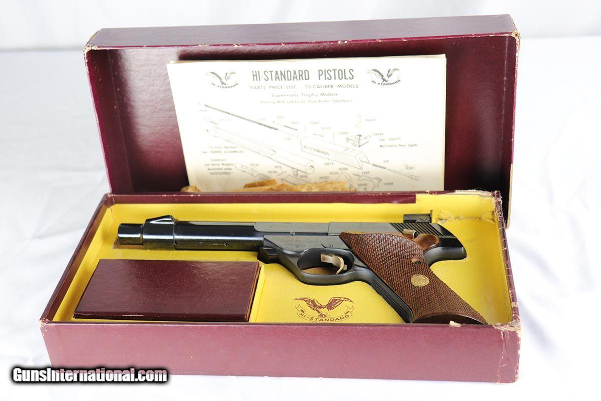 Description: This is a perfect example of an ANIB Hi-Standard Supermatic Trophy 104, made in the early 60s. The "Trophy" line of target pistols were the "Cadillacs" of High Standard production. Finished in high gloss blue with gold filled lettering and strawed small parts, these pistols had been used in competition but also offered the owner an opportunity to own a piece of art. The slanted grip and a "space" design earned them the nickname of "space guns", that became highly prized by collectors. This set is complete with an original numbered box, both weights in it original wrapper, a muzzle break and all the original paperwork. Also comes with a second magazine. A great example of the American-made target pistol of the bygone years that cannot be upgraded. SOLD Curio/Relic: Yes Manufacturer: Hi Standard Model: Trophy 104 Serial Number: 1302417 Caliber Info: .22LR Bore: 9/10 Condition: 99% Manufacture Date: 1960s |