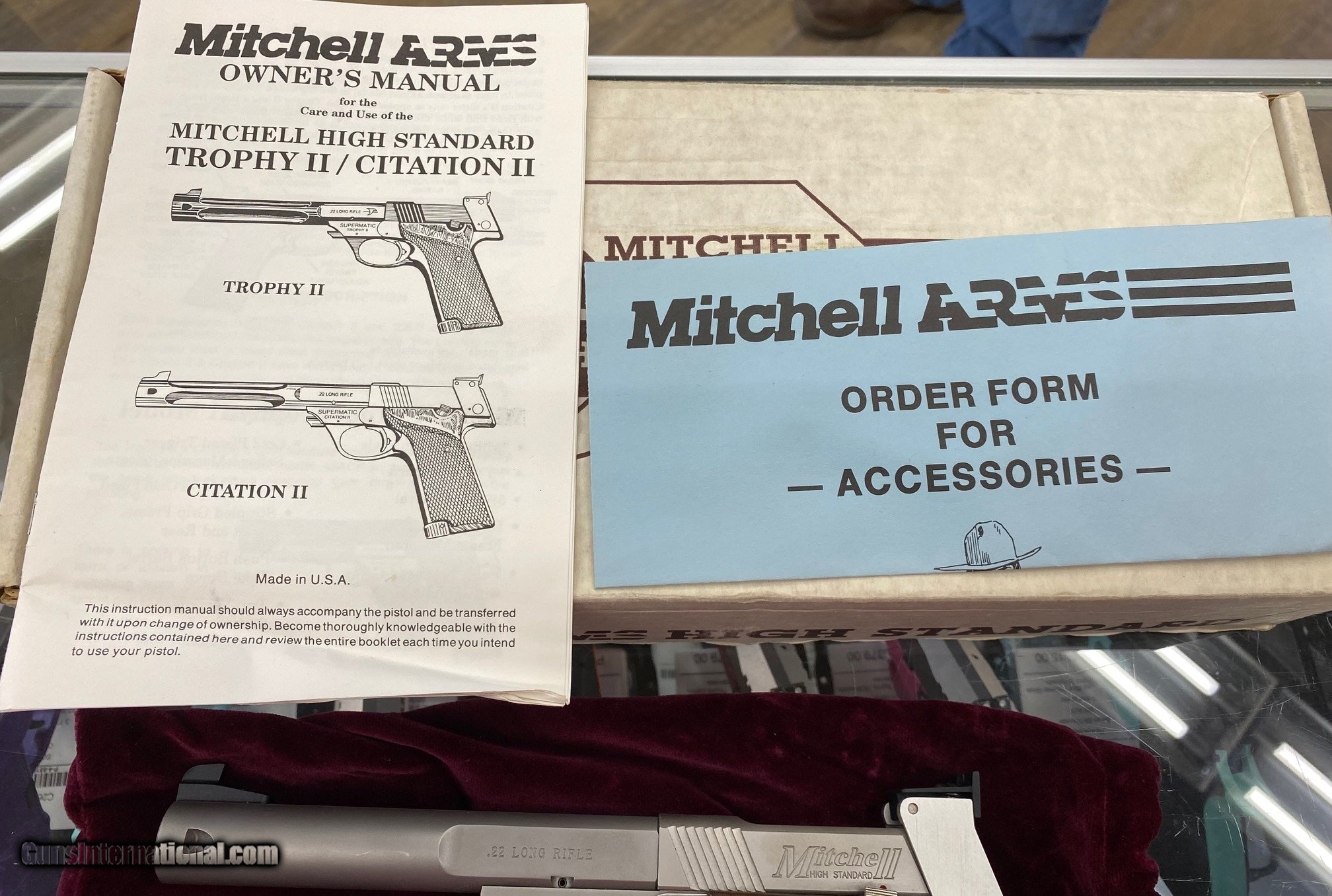 Description: Guns Listing ID: 470248 Mint condition Mitchell Arms Citation II, has original box, paperwork. Has been fired, but in mint condition. SOLD Manufacturer: MITCHELL ARMS Model: CITATION II Caliber Info: .22 LR Condition: Used - Non-Certified Barrels: 5.5 BARREL Finish: STAINLESS/WOOD GRIPS |