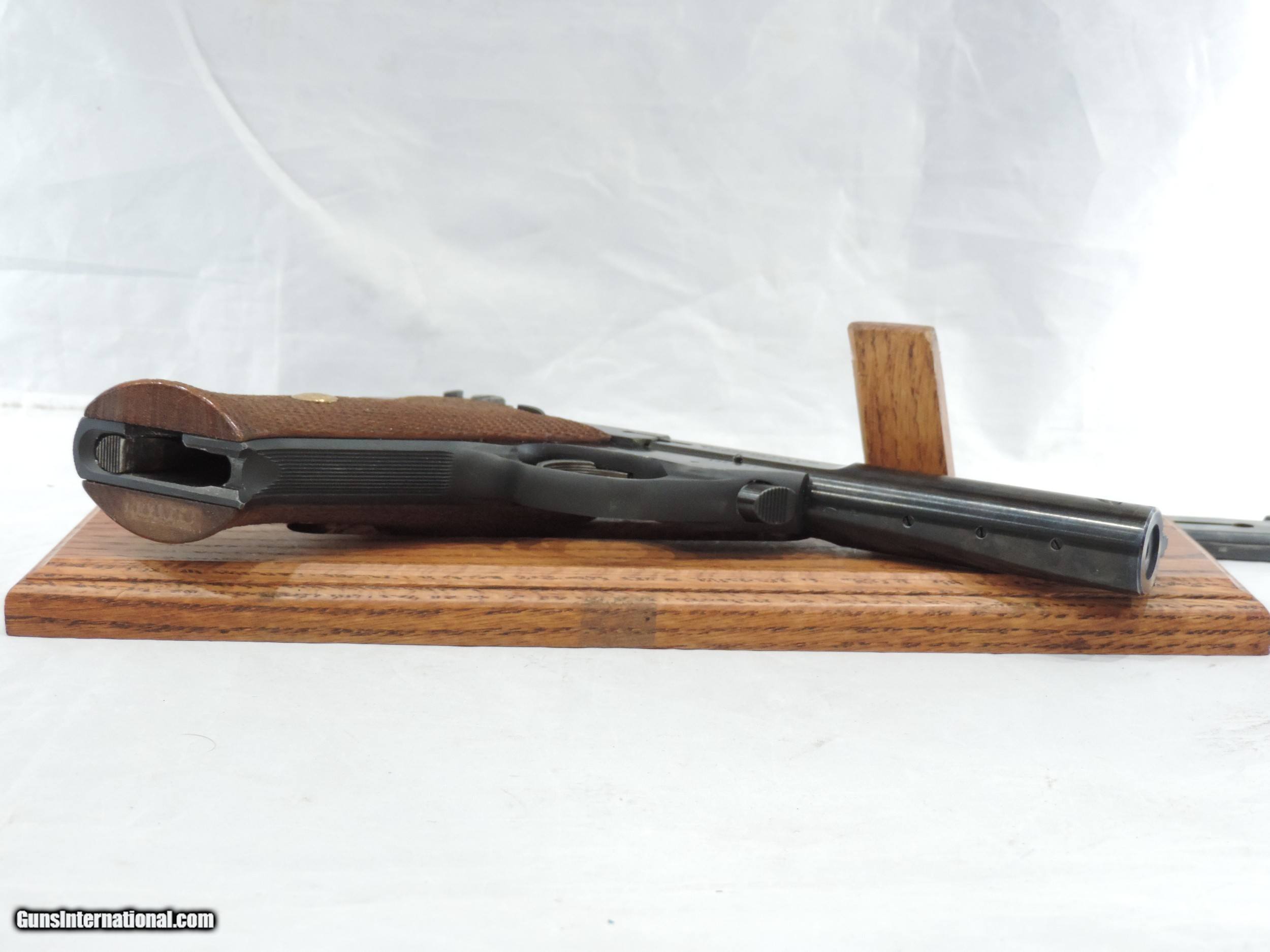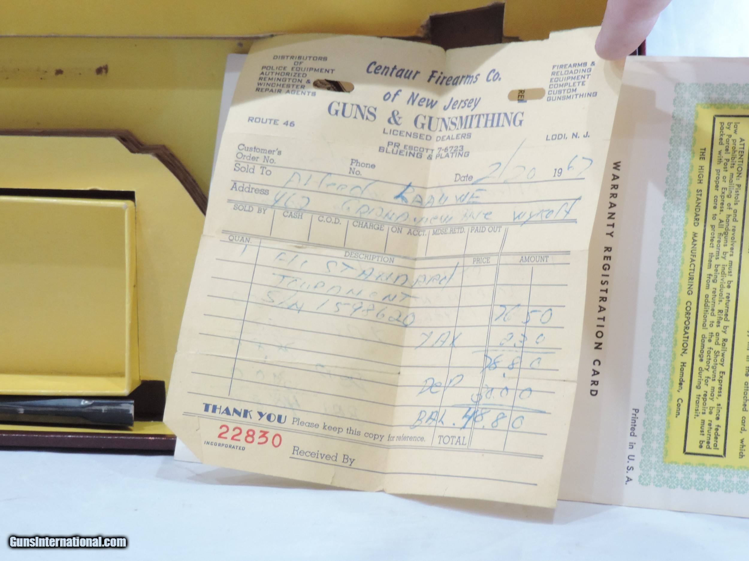 Description: INV. 9974 PRISTINE, HIGH STANDARD MDL. 104, CAL. .22LR., SER. 1361428. MFG. HAMDEN,CT. PRISTINE IS THE ONLY WAY TO DESCRIBE THIS "ATTIC QUEEN'. IT HAS RETAINED 100% OF THE ORIGINAL FACTORY FINISH. THERE ARE NO BLEMISHES ANYWHERE. THE WALNUT CHECKERED GRIPS ARE LIKEWISE, RETAINING 100% OF THE ORIGINAL LACQUER FINISH. NOT A CHIP, SPLIT OR EVEN A FLATTENED POINT. THE GRIP STRAPS HAVE SHOW NO SIGN OF GRAYING. THE SLIDE RAILS, FEED RAMP AND BOLT FACE SHOW LITTLE IF ANY USE. THE BORE IS PRISTINE LIKE THE REST OF THE GUN. MIRROR BRIGHT WITH RAZOR SHARP RIFLING, NOT A WHISP OF FROST ANYWHERE. THIS "ATTIC QUEEN" COMES WITH THE TWO PROPER MAGAZINES, THE ORIGINAL BOX IN GREAT SHAPE, THE ORIGINAL PARTS BROCHURE AND THE ORIGINAL FACTORY WARRANTEE. FOR THE COLLECTOR, OR SHOOTER IT DOESN'T GET ANY BETTER THAN THIS. MODESTLY PRICED AT .....$1195.*** ***100% OF THE GUN'S PURCHASE PRICE SATISFACTION GUARANTEED. To purchase this firearm or if you want to request more information contact us at: Email ckguns[at]ymail[dot]com Phone 201-512-0002 Cell 201-575-6838 FAX 201-215-4759 We accept most major credit cards. Prices shown are Discounted 3% for Cash or Check. The buyer must be familiar with all the laws governing the purchase and the ownership of firearms in their own city and state. The Yankee Armorer, Inc is not responsible for any failure to comply with or observe these laws. The Yankee Armorer, Inc will only ship after full payment and receipt of all required documents. Shipping: Add $35.00 for handguns, $45.00 for long guns. New Jersey buyers are subject to a 7% sales tax. The Yankee Armorer, Inc offers a 3 day inspection period with full refund upon return of intact firearm and in the original condition. The Yankee Armorer, Inc offers a no interest lay away program - 25% down; 25% in 30 days; 25% in 60 days; and full payment in 90 days. Any violation of this policy is subject to restocking and forfeiture of all payments. Any variation from this policy must be agreed to in advance. Unshipped Cancelled sales are subject to a 20% restocking fee. Be advised that all firearms sold by The Yankee Armorer, Inc. or the Gun Exchange, LLC (SELLER) are sold as collector’s items. They have not been fired or tested for safety and must be examined by a license gunsmith prior to use. By purchasing any item from the (SELLER), you are agreeing to hold the (SELLER) free from any damages or lawsuits of any nature. Any item left for transfer or storage will be charged to $25.00 per month, per item from the day of its receipt. Any variation from this policy must be agreed to in advance. Store hours 10:00 am to 5:00 pm Tuesday -Saturday. It's always best to call for appointment. Store 201-512-0002, cell 201-575-6838. SOLD |