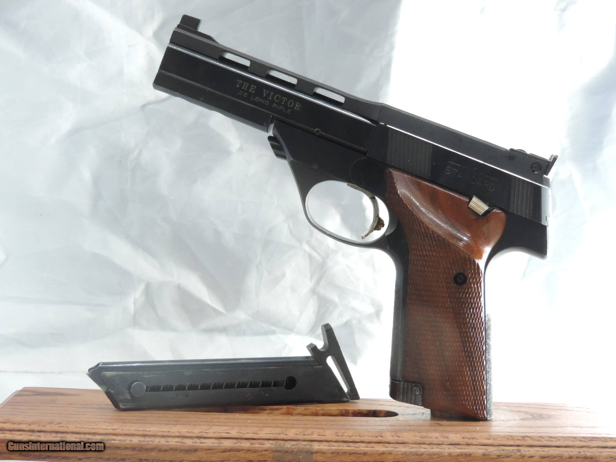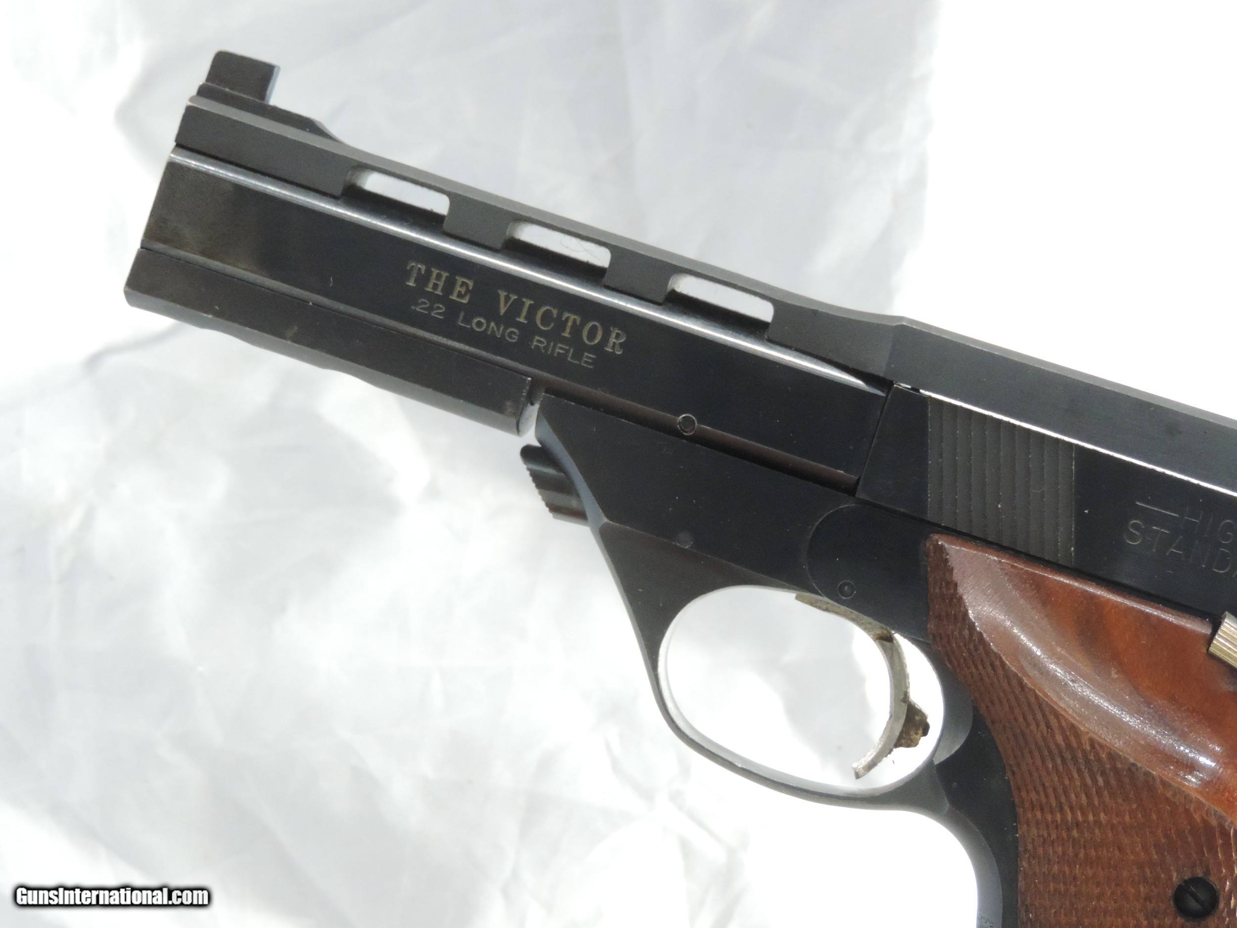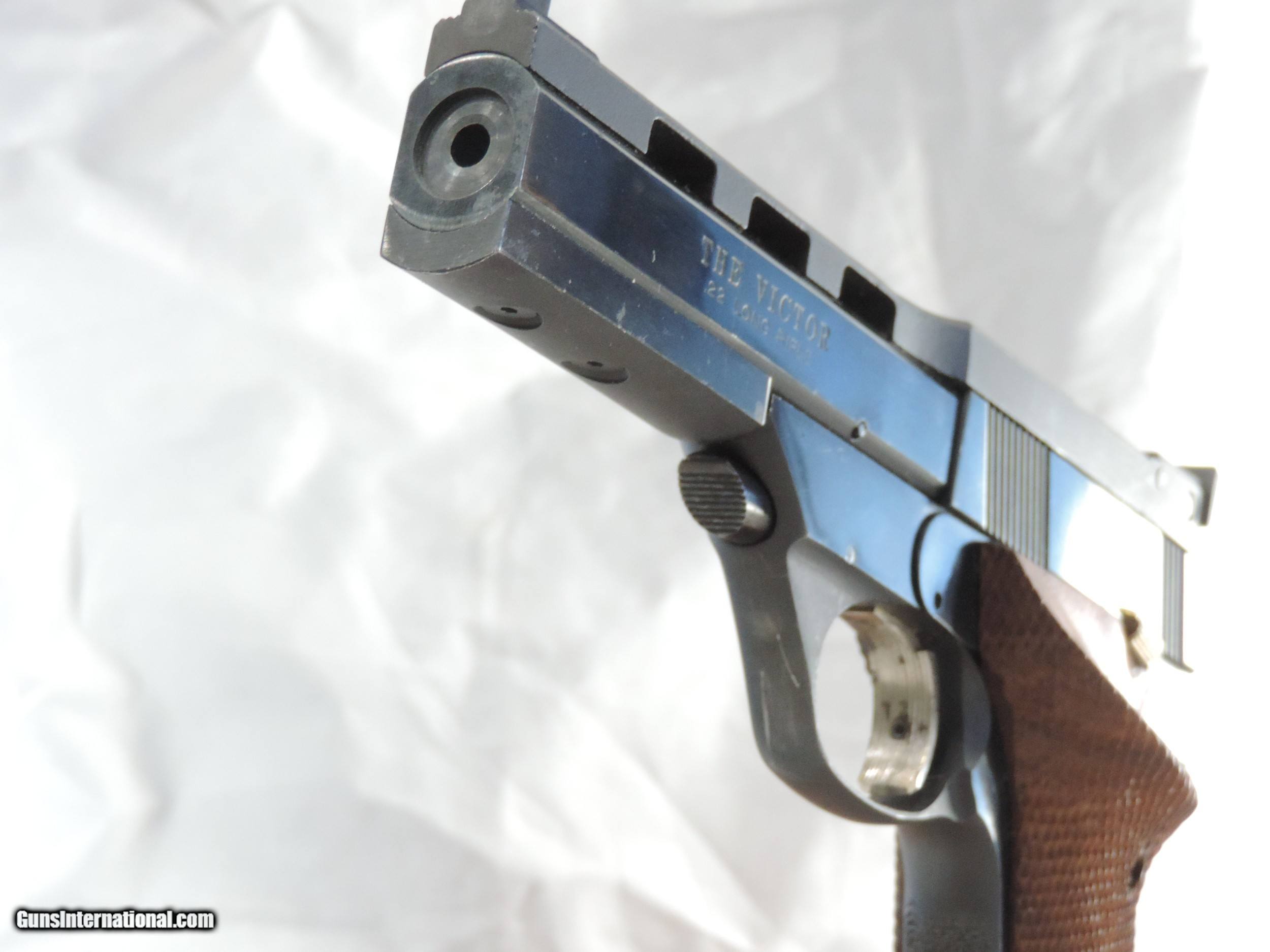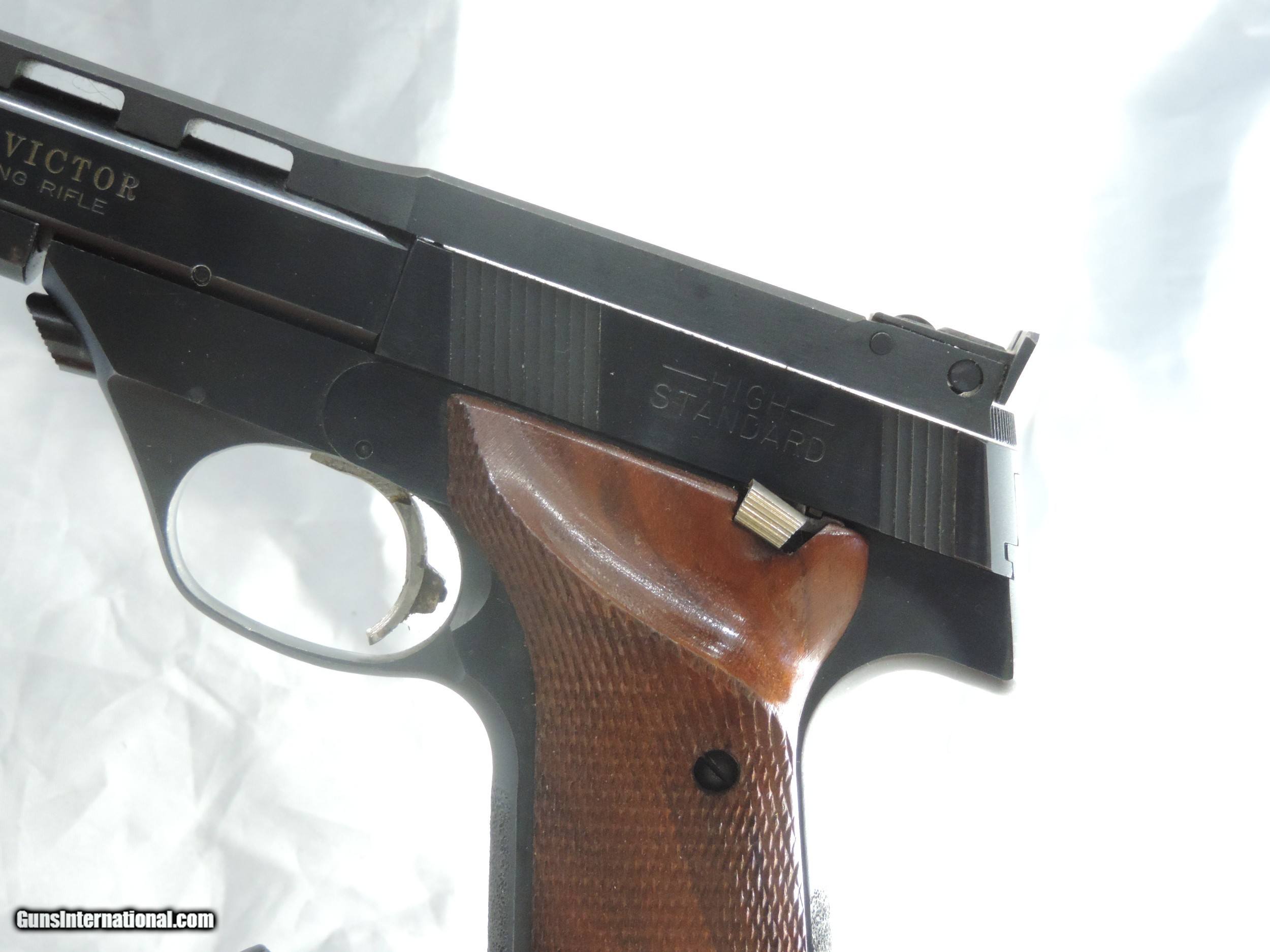 Description: INV. 10079 PRISTINE HIGH STANDARD VICTOR, MDL. 107 MILITARY, CAL. .22LR SER. 2312949. MFG. HAMDEN, CT. PRISTINE IS PRECISELY THE WORD FOR THIS VERY TOP OF THE HIGH STANDARD LINE. IT IS THE LAST VICTOR MODEL FEATURING SOME GOLD TRIM AND A MATTE FINISH VENTILATED RIB. THE GUN HAS RETAINED AT THE VERY LEAST 99.99% OF THE ORIGINAL HIGH POLISH FINISH. THE GOLD TRIGGER AND SLIDE HOLD BACK, ALSO AT 99.99%. THE LITTLE LOSS THERE IS, IS DUE TO SOME VERY SLIGHT SHARP EDGE SILVERING AND A TINY HAIRLINE SCRATCH. THE WALNUT CHECKERED THUMB REST GRIPS ARE ALSO PRISTINE. NOT CHIP, DING OR EVEN A FLATTENED POINT. THE SLIDE RAILS AND BOLT FACE SHOW LITTLE IF ANY USE. THE BORE LIKE THE GUN IS ALSO PRISTINE, MIRROR BRIGHT WITH RAZOR SHARP RIFLING. NOT WHISP OF FROST ANYWHERE. ALL PARTS ARE ORIGINAL AND IT AND APPEARS TO FUNCTION PROPERLY. THIS "CABINET QUEEN" COMES WITH ONE ORIGINAL BARREL WEIGHT AND ONE ORIGINAL MAGAZINE. FOR THE VERY CRITICAL COLLECTOR IT IS A FANTASTIC EXAMPLE. FOR THE SHOOTER, IT'S A REAL "X" RING BLASTER. MODESTLY PRICED AT.... $1295.*** *** 100% OF THE GUNS PRICE IS SATIFACTIOOON GUARRANTEED To purchase this firearm or if you want to request more information contact us at: Email ckguns[at]ymail[dot]com Phone 201-512-0002 Cell 201-575-6838 FAX 201-215-4759 We accept most major credit cards. Prices shown are Discounted 3% for Cash or Check. The buyer must be familiar with all the laws governing the purchase and the ownership of firearms in their own city and state. The Yankee Armorer, Inc is not responsible for any failure to comply with or observe these laws. The Yankee Armorer, Inc will only ship after full payment and receipt of all required documents. Shipping: Add $35.00 for handguns, $45.00 for long guns. New Jersey buyers are subject to a 7% sales tax. The Yankee Armorer, Inc offers a 3 day inspection period with full refund upon return of intact firearm and in the original condition. The Yankee Armorer, Inc offers a no interest lay away program - 25% down; 25% in 30 days; 25% in 60 days; and full payment in 90 days. Any violation of this policy is subject to restocking and forfeiture of all payments. Any variation from this policy must be agreed to in advance. Unshipped Cancelled sales are subject to a 20% restocking fee. Be advised that all firearms sold by The Yankee Armorer, Inc. or the Gun Exchange, LLC (SELLER) are sold as collector’s items. They have not been fired or tested for safety and must be examined by a license gunsmith prior to use. By purchasing any item from the (SELLER), you are agreeing to hold the (SELLER) free from any damages or lawsuits of any nature. Any item left for transfer or storage will be charged to $25.00 per month, per item from the day of its receipt. Any variation from this policy must be agreed to in advance. Store hours 10:00 am to 5:00 pm Tuesday -Saturday. It's always best to call for appointment. Store 201-512-0002, cell 201-575-6838. SOLD |