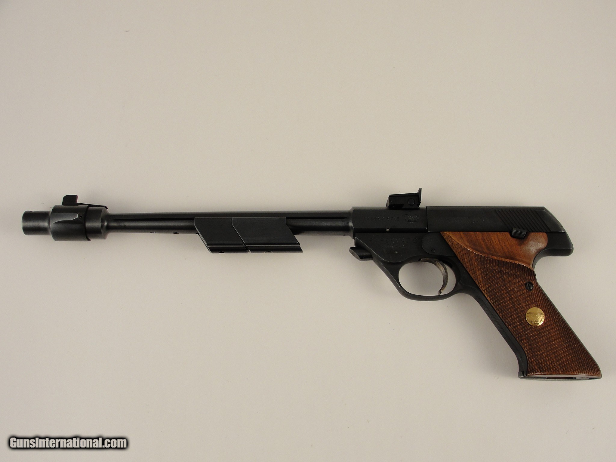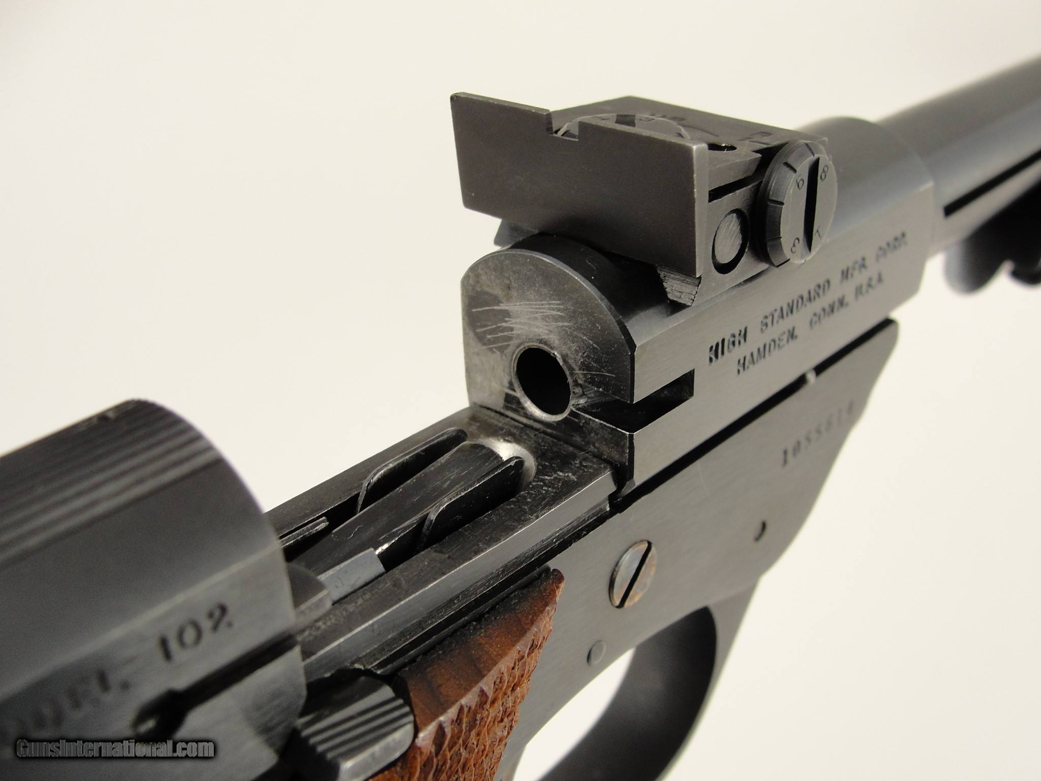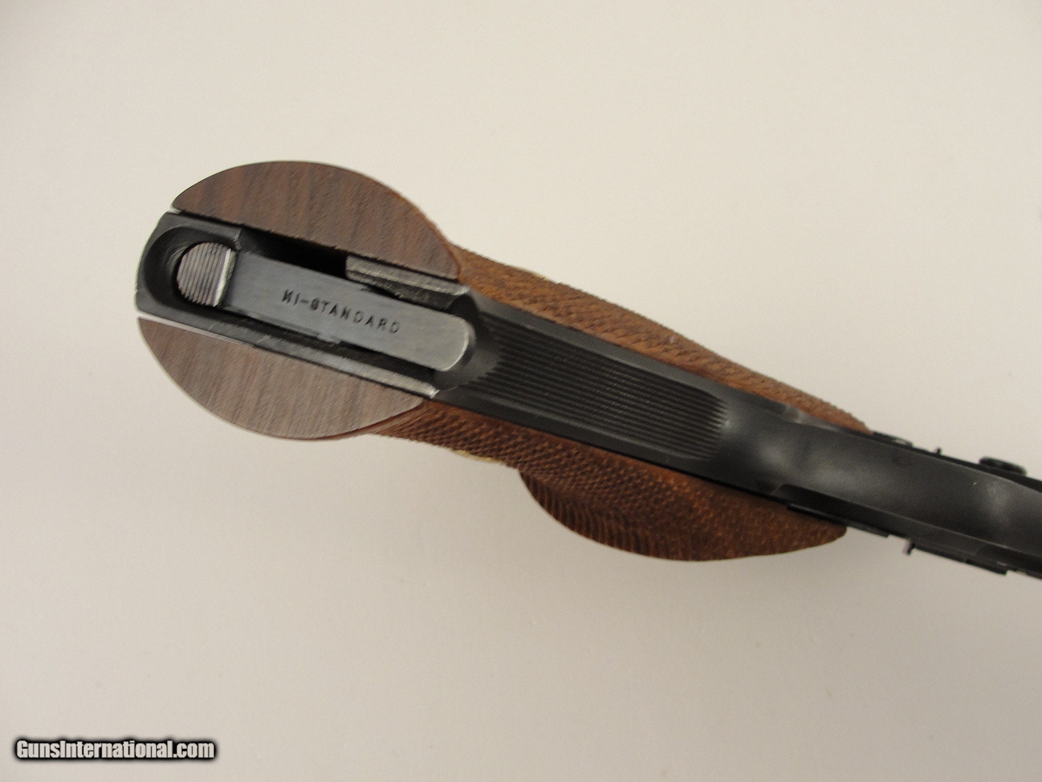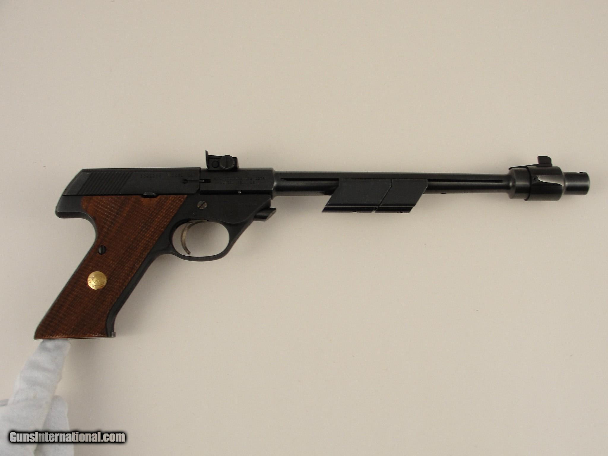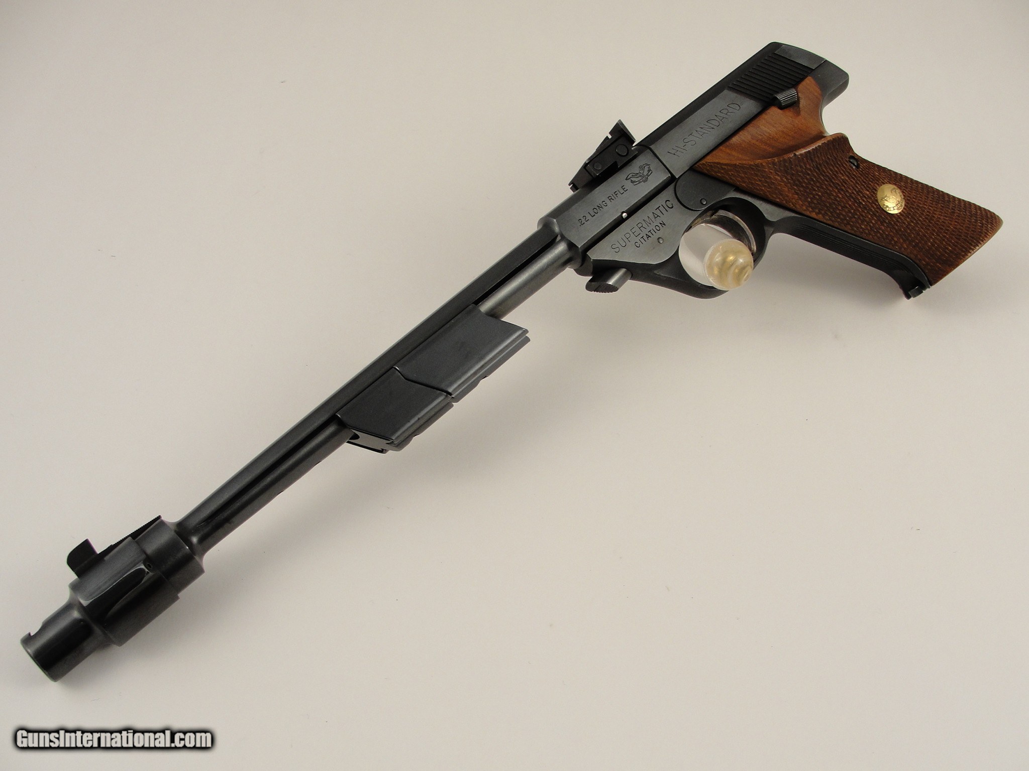 Description: Sold Pending Funds—When was the last time you saw a 102 Supermatic in 10" with the full complement of barrel weights? Introduced as part of the 102 Series pistols, the Citation was a high grade target pistol destined to become one of the most important pistols in the Hi-Standard line. The rakish lines of the 102 Series guns along with some of the very unusual barrel profiles were unconventional in their day and remain so today. This unusual, odd-looking barrel features a tapered round/thin profile with a large diameter muzzle atop which sat the front sight. This fat muzzle section acted as a vibration damper and also had slots which served as anchor points for a detachable muzzle brake. The length of the barrel was also grooved for the attachment of barrel weights, both of which are included. The rear sight was mounted on the rear of the barrel, above the chamber. Pistols shipped with the standard shorter barrels had the rear sight mounted in a dovetail on the slide. Since this pistol has no slide dovetail it is safe to assume it shipped with the long space gun barrel. The frame and slide have matching serial numbers. Overall condition is excellent with some normal collector type, and light usage wear but no rust or pitting. It wears the optional checkered wood grips and they are in excellent condition, free of chips or cracks. The mechanics appear to be in perfect working order and the bore is mirror bright with sharp rifling. It comes with one factory 10-shot magazine. According to the serial number, this pistol was production in the first part of 1960. Please view the photos here for the purpose of evaluating the condition for yourself. This item qualifies as a C&R. No International or California sales. Shipping & insurance by FedEx is $45 to eligible lower 47 states. Buyer is responsible for knowing their own local and state laws and whether or not you are prohibited from taking possession of, or owning this firearm. By purchasing, you are attesting to being of at least 21 years of age. ***The purchaser assumes all risks and should have a qualified Gunsmith evaluate the firearm before they shoot it. *** Payment must be by bank certified (cashiers) check or Postal Money Order. Shipping to AK or HI will have additional costs for which buyer is responsible. I will need a copy of an FFL dealer license to ship the gun. There is a 3 day, no-shoot, no disassembly inspection period and the buyer is responsible for cost of shipping both ways if returned. If your FFL dealer will not accept shipment from an individual, I will need an additional $40 to ship through my FFL. SOLD Curio/Relic: Yes Manufacturer: High Standard - Hi Standard Model: 102 Supermatic Citation Caliber Info: .22 LR Manufacture Date: 1960 |
