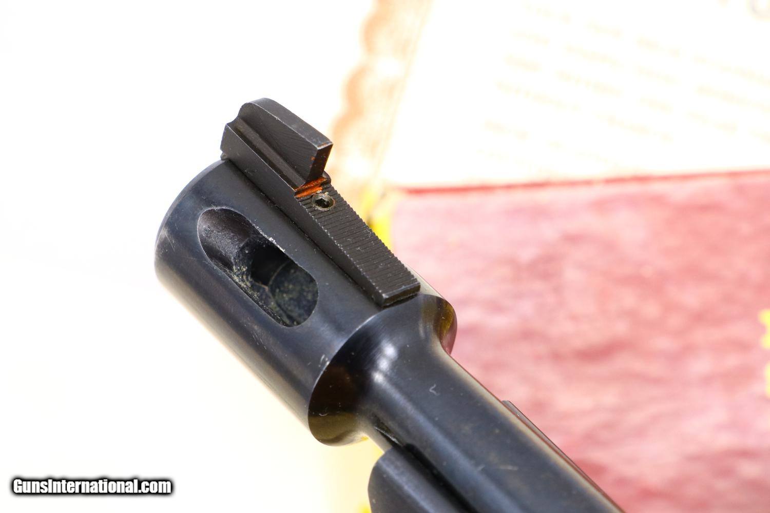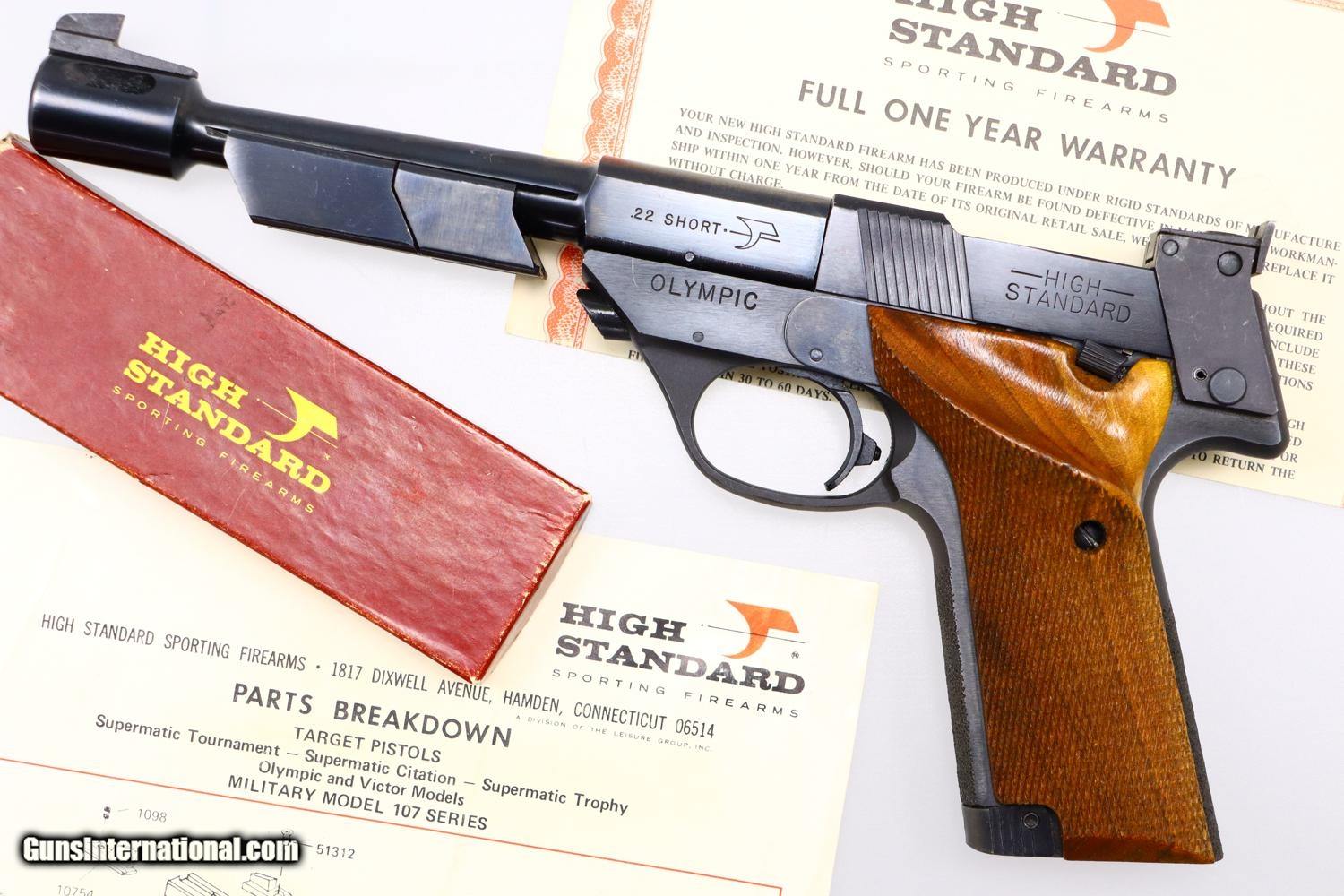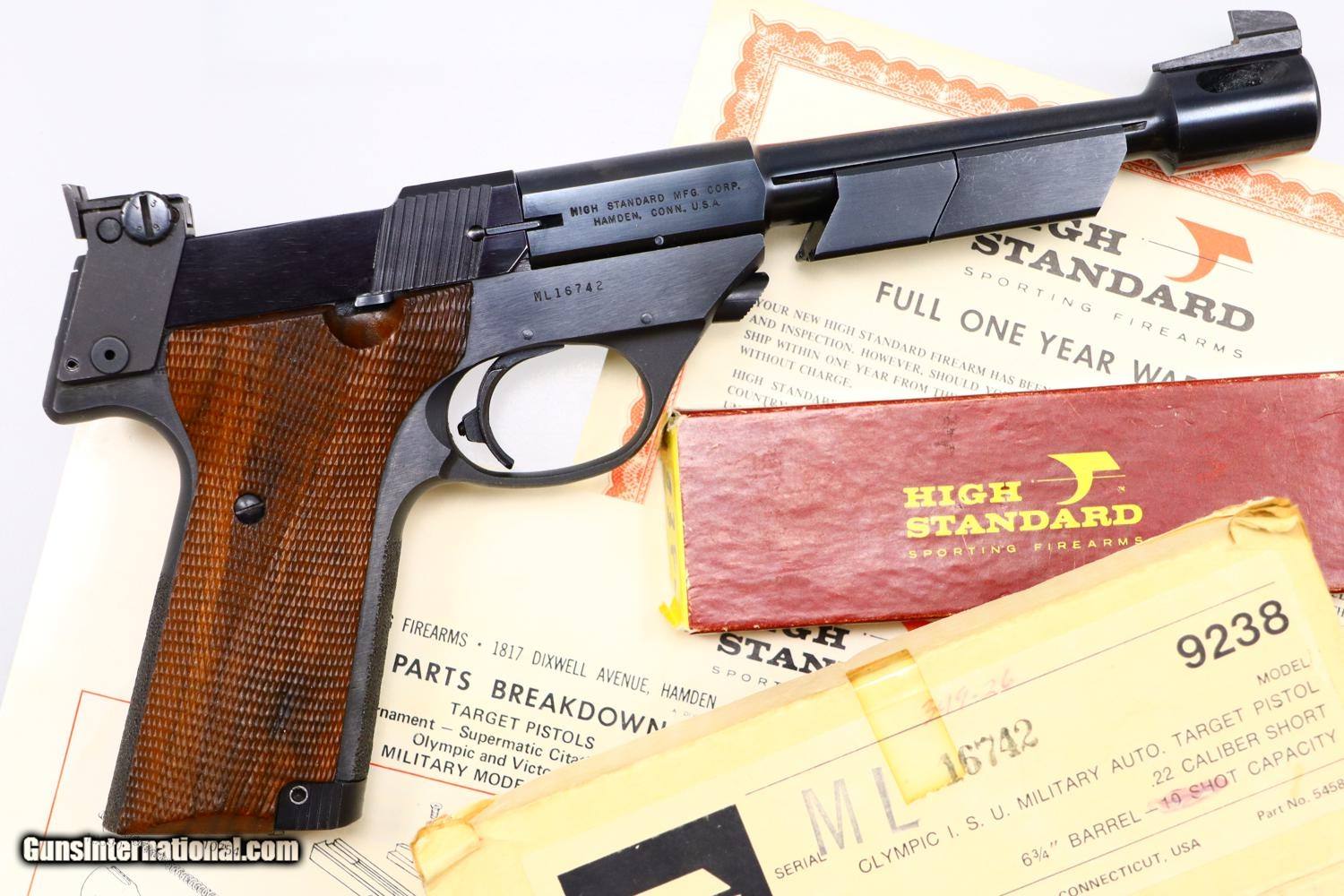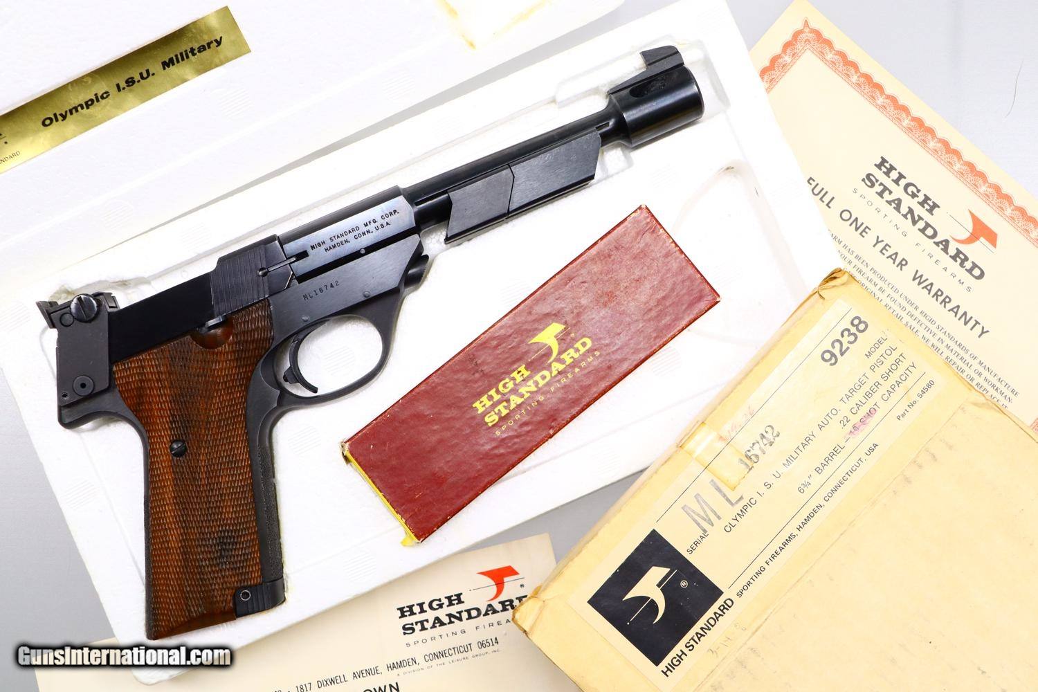 Description: Synopsis: Very Scarce High Standard, Military Olympic, Boxed, ML16742, FB01079, Description: This is one of the last Olympic variations made by High Standard between 1975-1980, one of only 298 guns, numbered in the military frame ML16644-ML25000 serial range, just before Hi-Standard did its final parts cleanup that morphed into the 1980 Olympic commemoratives. Very unusual to find one of these pistols, with its special thin counterweights and flat bases, complete in its original matching shipping box with styrofoam inserts, parts schematic and original warranty card that was never completed. Even better is that the shipping box was one of the early elongated versions that allowed space for an accessory Hi-Standard box, this example containing a spare .22 Short magazine with an unmarked metal floorplate. Condition: EXC with the front lower right edge of the alloy slide having been neatly deburred. Minor handling marks as one might expect from a high quality target pistol that has seen careful use. Mirror bore. Perfect manual mechanics. Associated shipping components in the same condition, though the base of the accessory box, holding the spare magazine, has begun to separate. A wonderful and complete ensemble reflecting one of the scarcest Olympic variations that should appeal to any High Standard collector and connoisseur of fine target pistols. ~~Insured shipping fee of $55; most packages shipped using FedEx 2nd Day.~~ SOLD Manufacturer: Hi-Standard Serial Number: ML16742 Caliber Info: .22 Short |