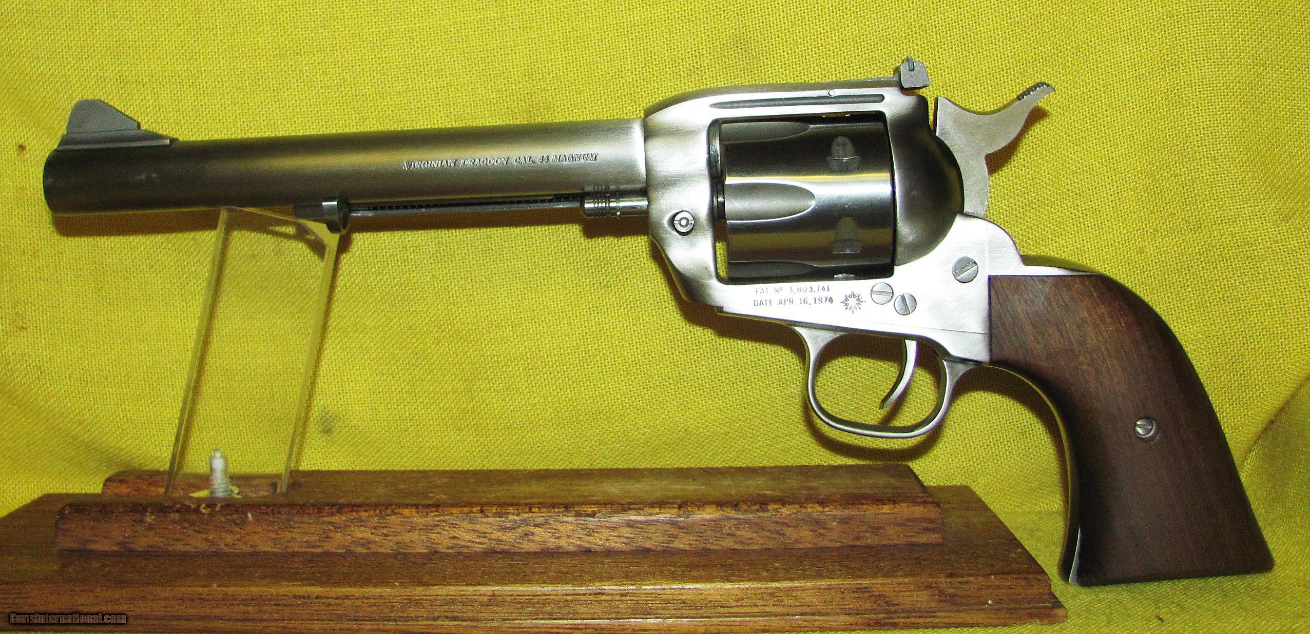 Description: INTERARMS VIRGINIAN DRAGOON IN .44 MAGNUM CAL., WITH 7 1/2" BARREL. COLOR STAINLESS STEEL. CONDITION 98%+ LIKE NEW. SERIAL NUMBER S3082. INTERARMS MODEL VIRGINIAN DRAGOON, MIRROR BORE WITH EXCELLENT GRIPS, 98%+ FACTORY FINISH, ORIGINAL BOX WITH FACTORY MANUAL, LIKE NEW. OUR NEW STOCK # D32489. SOLD |