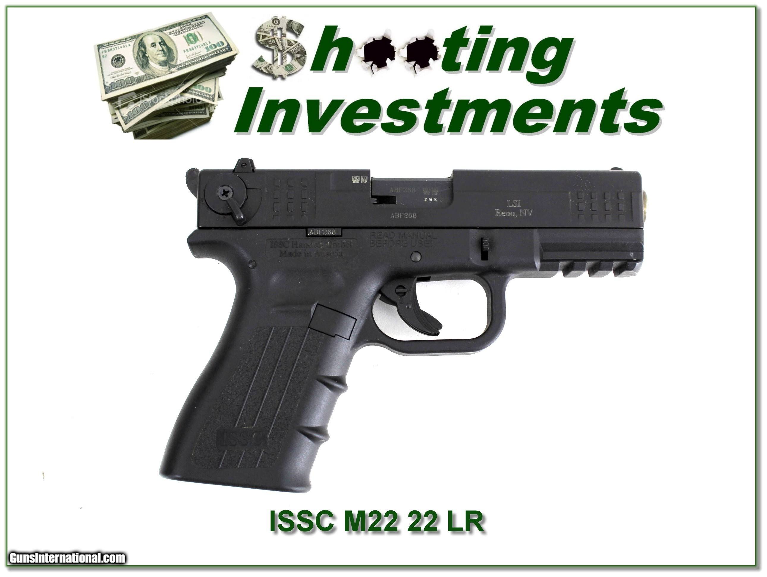 Description: This is an excellent condition Austrian made ISSC M22 22LR. I only have the gun as pictured. I am selling this one on consignment and as such lay-a-way can’t be used. It does of course have the standard 3-day inspection. Shipping and insurance is $39. Please email me with any questions or larger pictures. (Consign your quality firearms with Shooting Investments for only 12%! Let me know if you have any you would like to sell!) 23-0465 Payment: Payment is by Money Order, Cashier’s Check or Personal Check. I can now also accept Credit Cards (MasterCard, Visa, Discover & American Express) with a 3% convenience fee. Shipping: The shipping charge will be listed in each description. It is $49 for most firearms. Some heavy guns or those insured for over $2000 will be higher. Shipments to Alaska and Hawaii are higher because air shipment is required. Most firearms are shipped on Tuesday and Thursday and usually in 5 days of receipt of payment. We package all shipments carefully and insure them. Optics are shipped Priority Mail and most other non-firearm shipments are shipped First Class. Returns: Our return policy is simple. If for any reason you are not pleased with your purchase, you may return your item for a full refund of purchase price. Ammunition cannot be returned. It is important to us that you are happy. Guns cannot be fired or dissembled before returning them and they must be returned in the same condition as received. Notification of a return must occur within 3 days of receipt at your dealer. Shipping, convenience and dealer fees are not refundable and are the responsibility of the buyer. Lay-a-way: If needed, we offer a 60 day lay-a-way option on most firearms. It is 1/3 now, 1/3 in 30 days and 1/3 in 60 days. Lay-a-way firearm sales are final and cannot be returned. If a lay-a-way is not completed the first payment cannot be refunded. Consigning your firearms with Shooting Investments: We will help you get top dollar for your firearms. While most local guns shops charge 20% or more, our fee is only 12% with a minimum of $75. At your local gun shop it might take months to sell. Selling on-line provides instant access to thousands of interested buyers. You won’t find any other on-line dealer willing to sell your firearms for only 12% or listing every gun on 3 separate s. Selling through an House typically costs the seller 15% and the buyer an addition 15% (so 30%) and you have to wait several months to sell and longer to receive funds. If properly priced, we will sell your firearms within a few weeks. Send us an email or give us a call and we’ll explain how easy it is for you to get top dollar. Trading: Trading for us is really just buying your gun to re-sell. If you have a gun you want to trade, please email a picture and we will let you know what we can give for it. You will always get more if we sell it for you on consignment. SOLD |