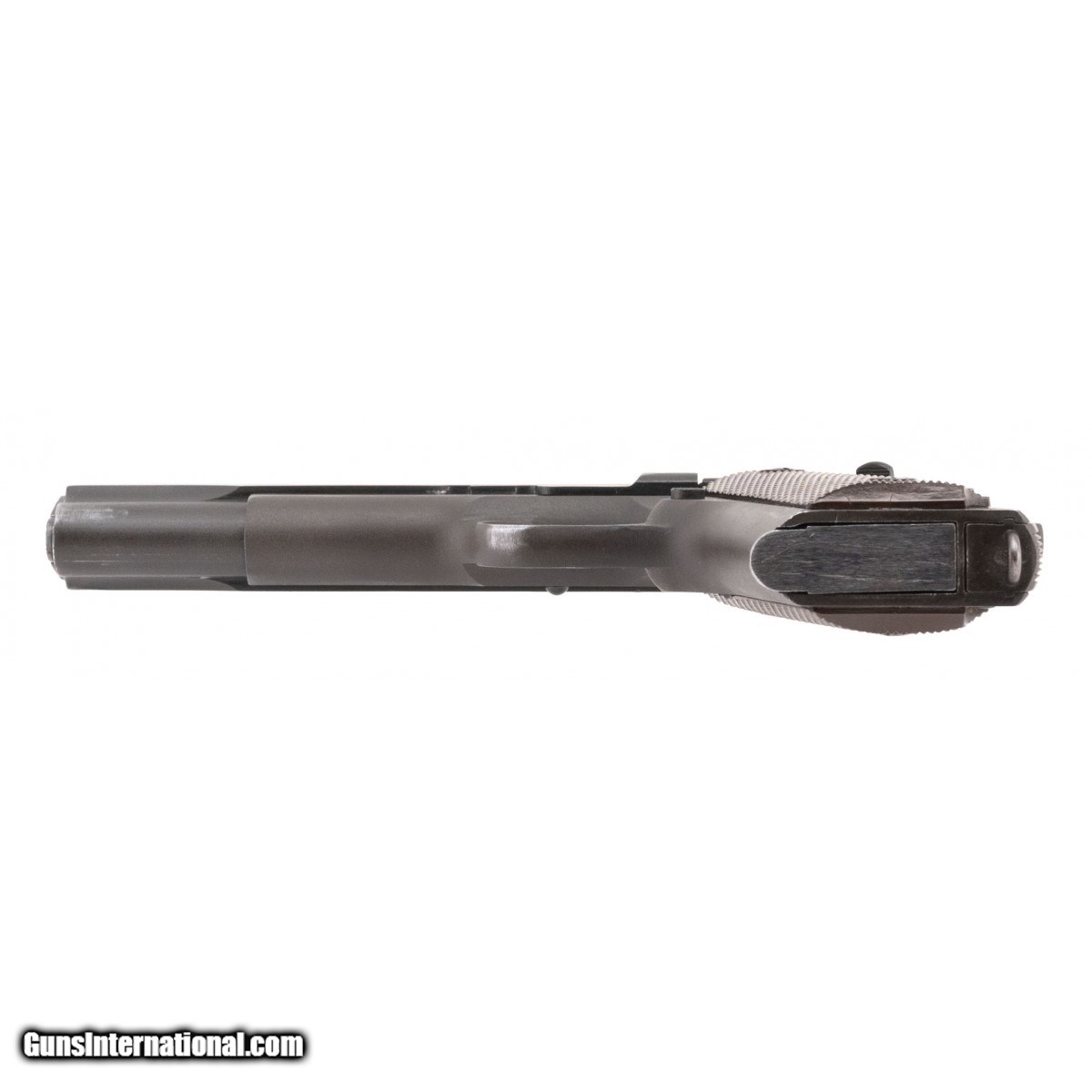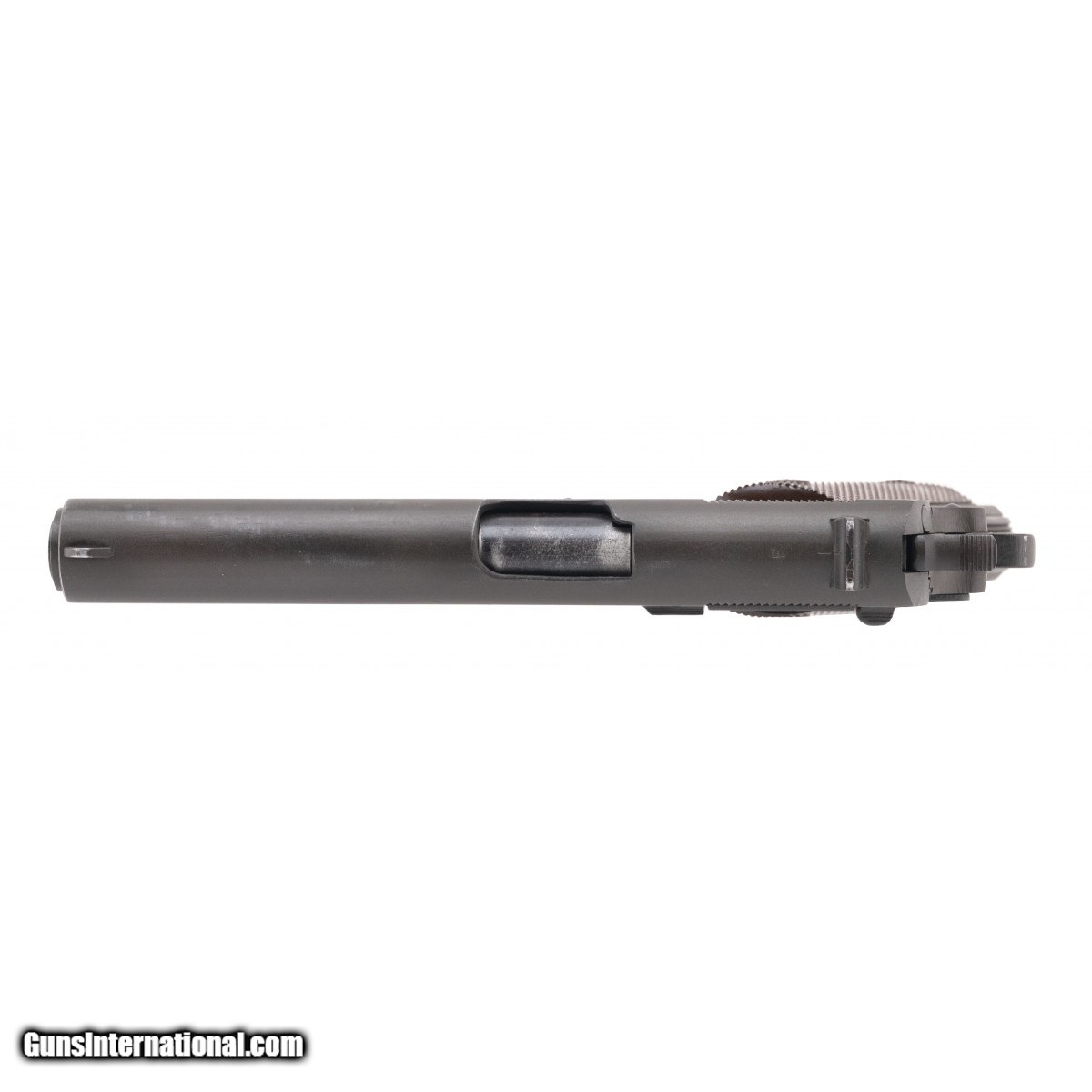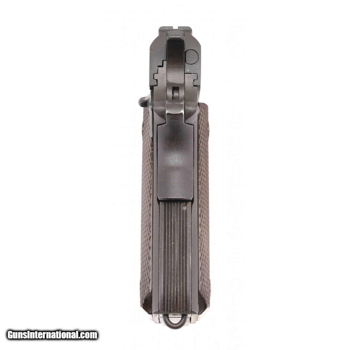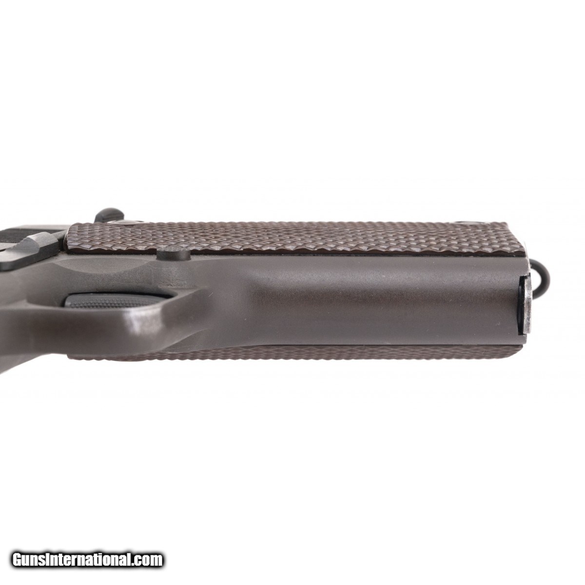 Description: " This excellent Ithaca U.S. Model 0f 1911 A1 45ACP pistol was delivered as part of the 3rd Ithaca contract on May 10, 1944, to Benicia Ordnance Depot, Benica, CA. It is correct throughout with the slide being marked on the left ITHACA GUN CO., INC. over ITHACA N.Y. The right side of the frame is marked UNITED STATES PROPERTY over No 1451602 with M1911 A1 U..S. ARMY forward. The left side of the frame is correctly inspected FJA and the left side of the trigger guard has the Ithaca two headed arrow inspection stamp. The top of the slide has the expected P. The mainspring housing, hammer, and slide stop are correctly serrated. The expected High Standard barrel has a fine bore with frosting in the grooves. The brown plastic grips are excellent. The parkerized finish rates at 98% plus. The L marked magazine was made by the M.S. Little Manufacturing Co. of Hartford, CT. The action functions correctly. This gun is tight as new. It's a great example of the hard to find correct Ithaca M1911 A1. It's ready for your WWII collection. SOLD Curio/Relic: Yes |