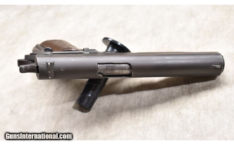 Description: Nice piece. We rarely see them where the frame and slide are both Ithaca manufacture. It has pretty nice finish, grips look good, and the barrel is in good shape, especially for a pistol dated 1943. .45 Auto SOLD Chambers: 8 Metal Condition: Very good. There is some wear in the finish and around the take-down pin. Most of the wear is on the high points and edges. Wood Condition: Very good. Bore Condition: "Good. It is clean with good rifling, but there is a bit of roughness in the grooves. Barrels: 5-inch Triggers: Factory single action only. Butt Pad: Checkered brown synthetic. Weight: 39 oz Sights: Low profile military post and notch Item Location: Rogers |
