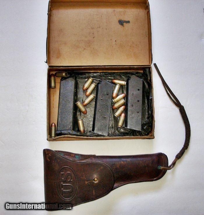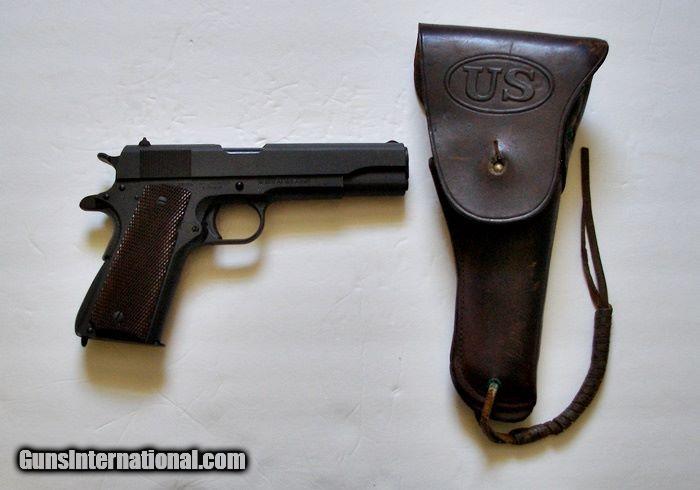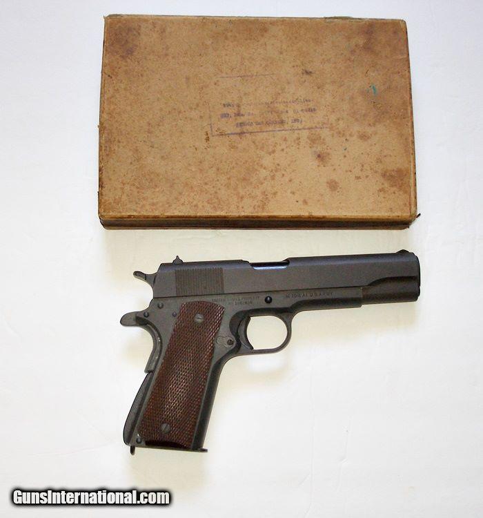 Description: ITHACA 1911-A1 45 CAL PISTOL, 1944 MFG DATE, PARKERIZED FJA MARKED US ARMY, 5" BBL, EJECTORS, STANDARD TRIGGER, BROWN PLASTIC GRIPS, 40OZ, ORIGINAL BOX WITH 4 CLIPS & HOLSTER, 99%, MINT BORE, VERY LITTLE USE! SOLD Manufacturer: ITHACA Model: 1911-A1 Caliber Info: 45 CAL Ejectors: YES Condition: 99%, VERY LITTLE USE! Barrels: 5" BBL Triggers: STANDARD Stock: BROWN PLASTIC GRIPS Weight: 40OZ Sights: FX Manufacture Date: 1944 MFG DATE Case: ORIGINAL BOX WITH 4 CLIPS & HOLSTER Item Location: SAFARI OUTFITTERS LTD, SALT POINT, NY 12578 |