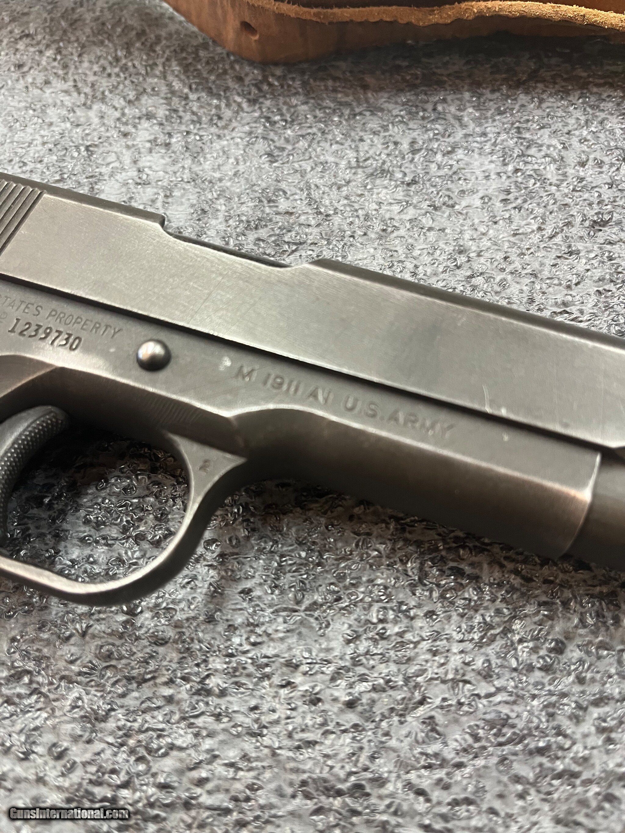 Description: Guns Listing ID: 1081793 Up for sale is a Ithaca pistol model M1911 A1 Army 1911 frame .45 acp with United States Property stamped above the serial number comes with one mag and a leather side shoulder holster has somewhere on the slide in the body but minimal SOLD Manufacturer: ITHACA GUN COMPANY Model: M1911 A1 U.S. ARMY Caliber Info: .45 ACP Condition: Used - Non-Certified Barrels: 5 BARREL Finish: BLUED |