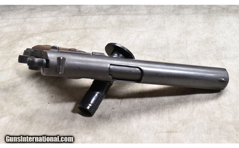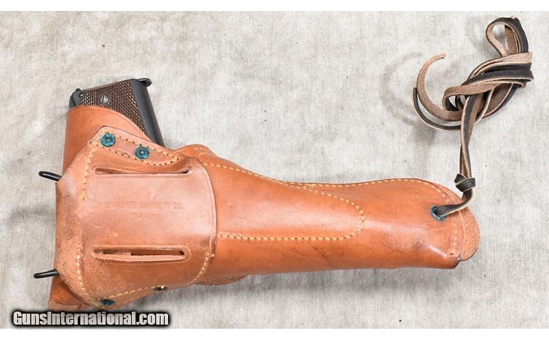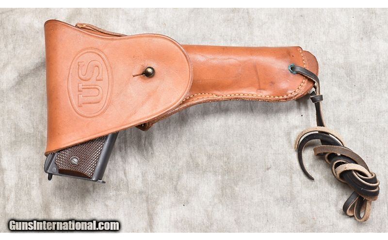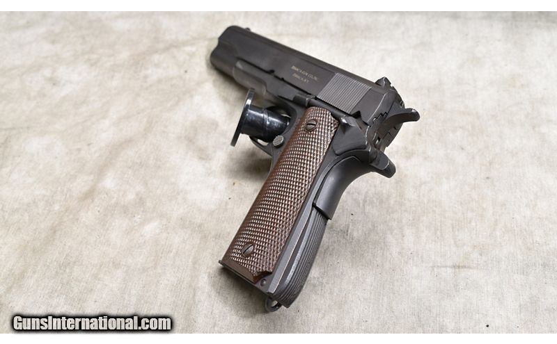 Description: Nice sample of the Ithaca version of the 1911A1 with sharp and clear stamps, checkering and backstrap grooves. There are a few light scratches on the slide but no rust or pitting. .45 ACP SOLD Chambers: 8 Metal Condition: Very good. Some wear on the sharp and exposed edges. All stamps are sharp and clear. Wood Condition: Excellent. Checkering sharp. Bore Condition: Shiny and bright with good rifling. Barrels: 5-inch Triggers: Factory single action. Butt Pad: Checkered brown synthetic. Weight: 39 OZ. Sights: Low profile post and notch. Item Location: Rogers |