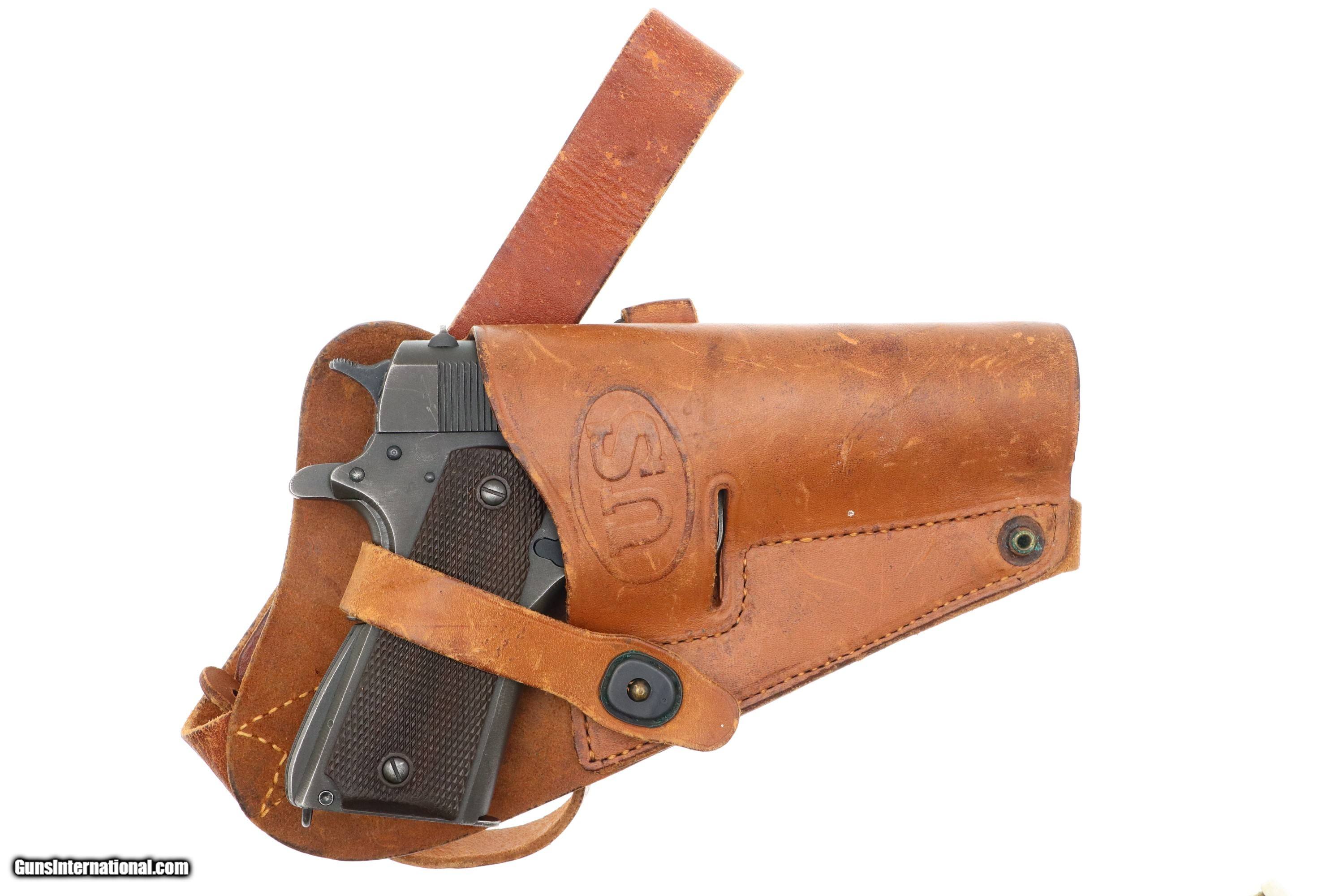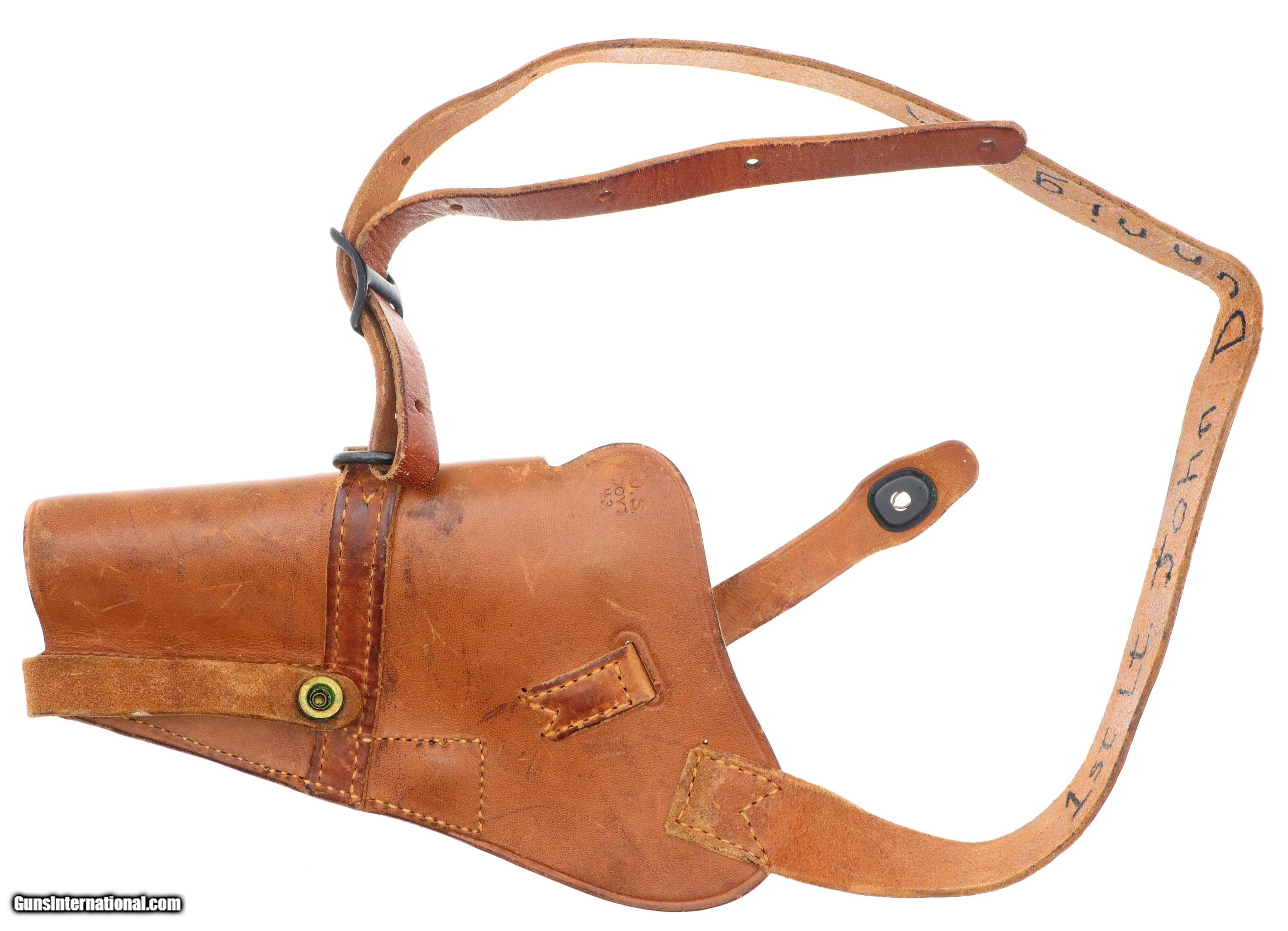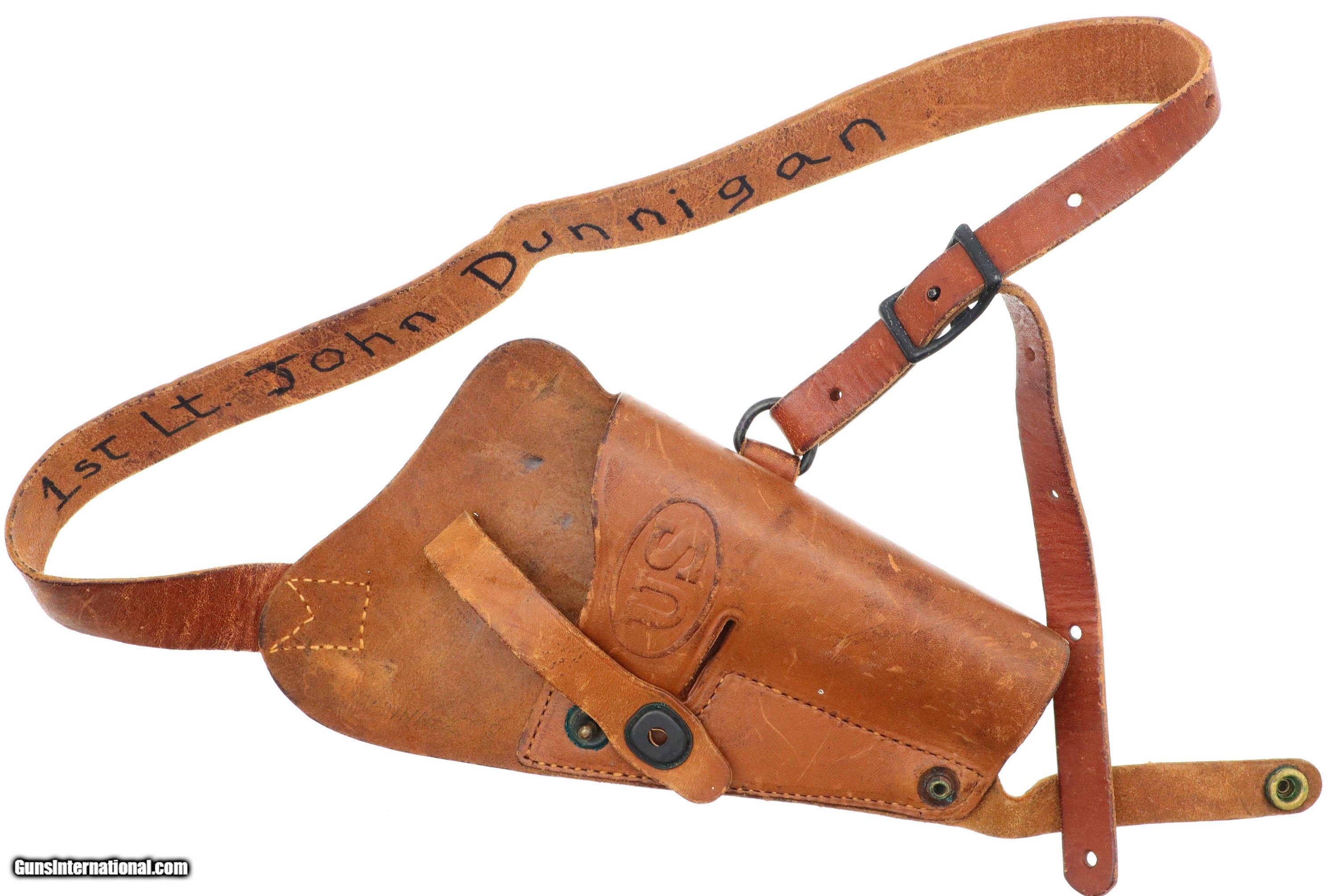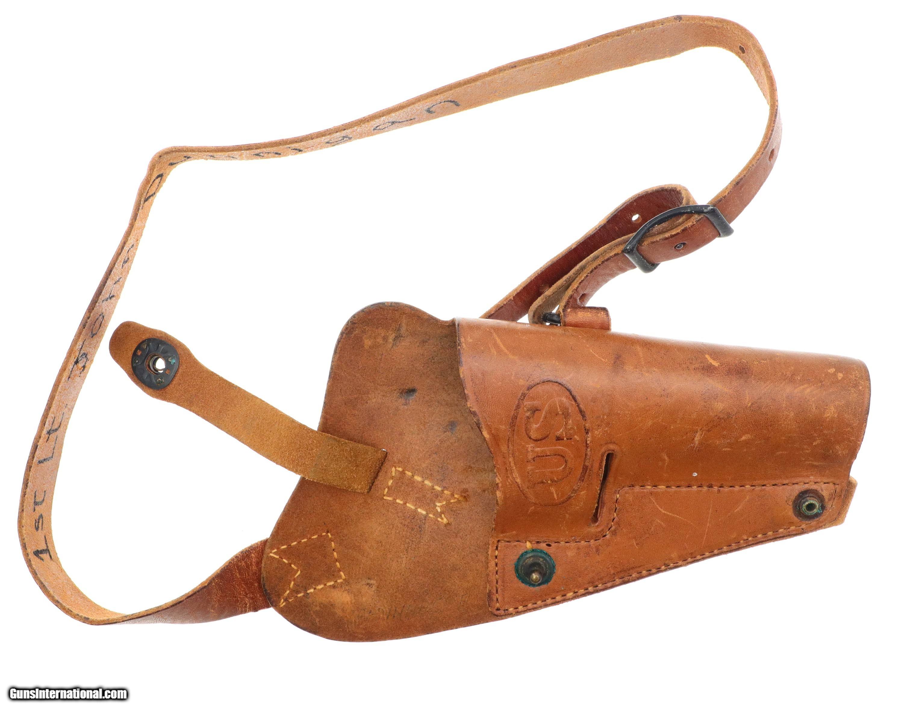 Very good original parkerized finish with sharp edge, holster, and handling wear consistent with a service pistol having seen moderate use. Comparable grips and magazine. Bright bore. Perfect manual mechanics. Comparable condition shoulder holster. A very attractive and all original U.S. military classic rig that would fit any collection!