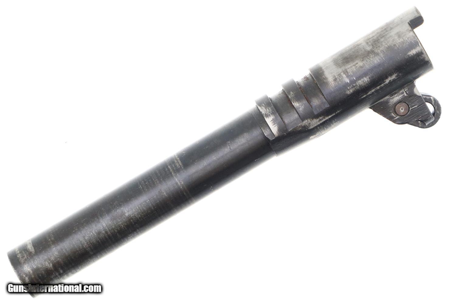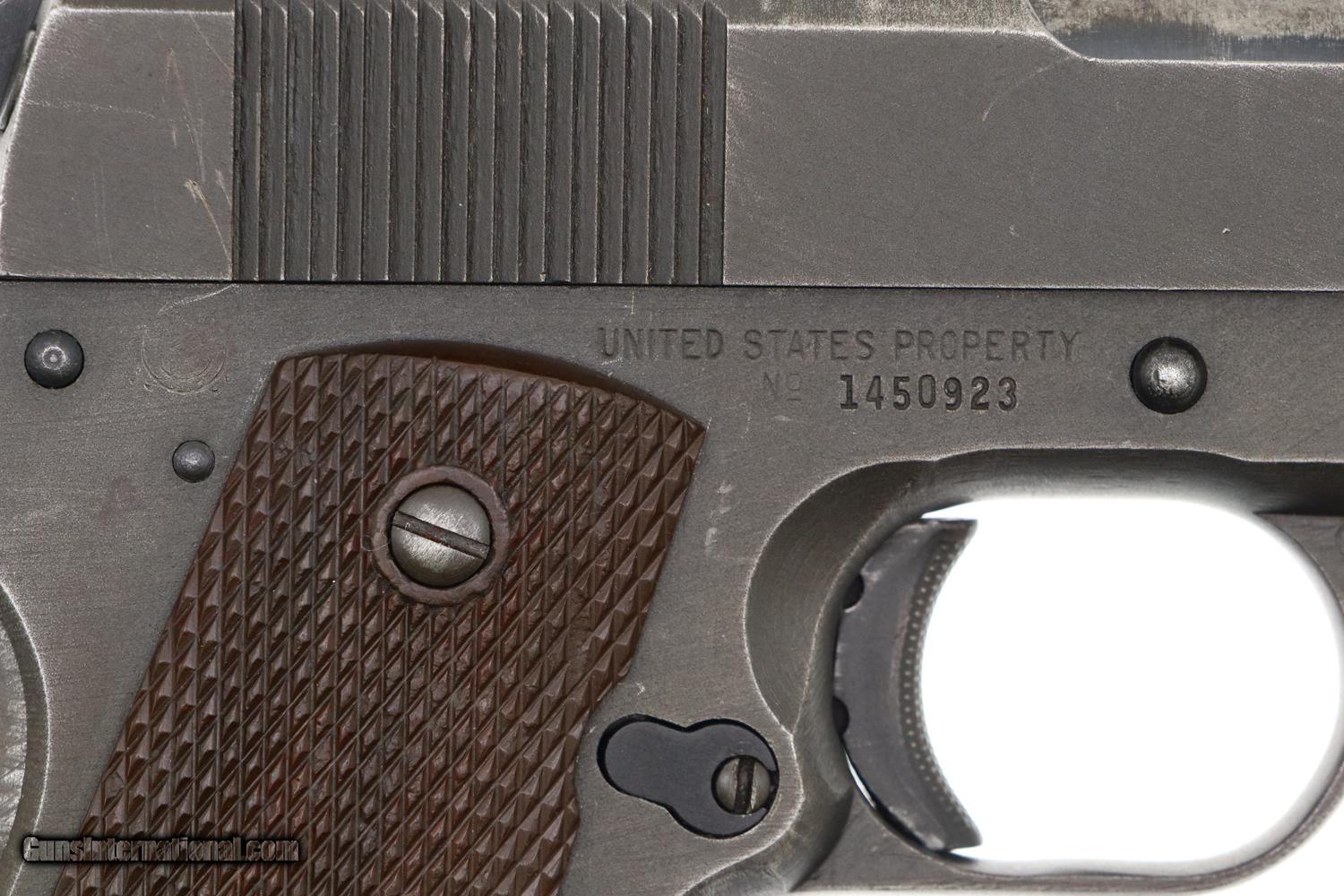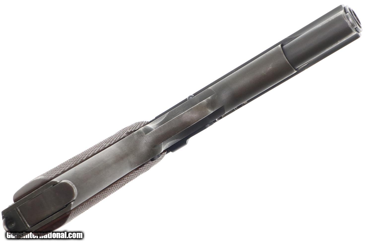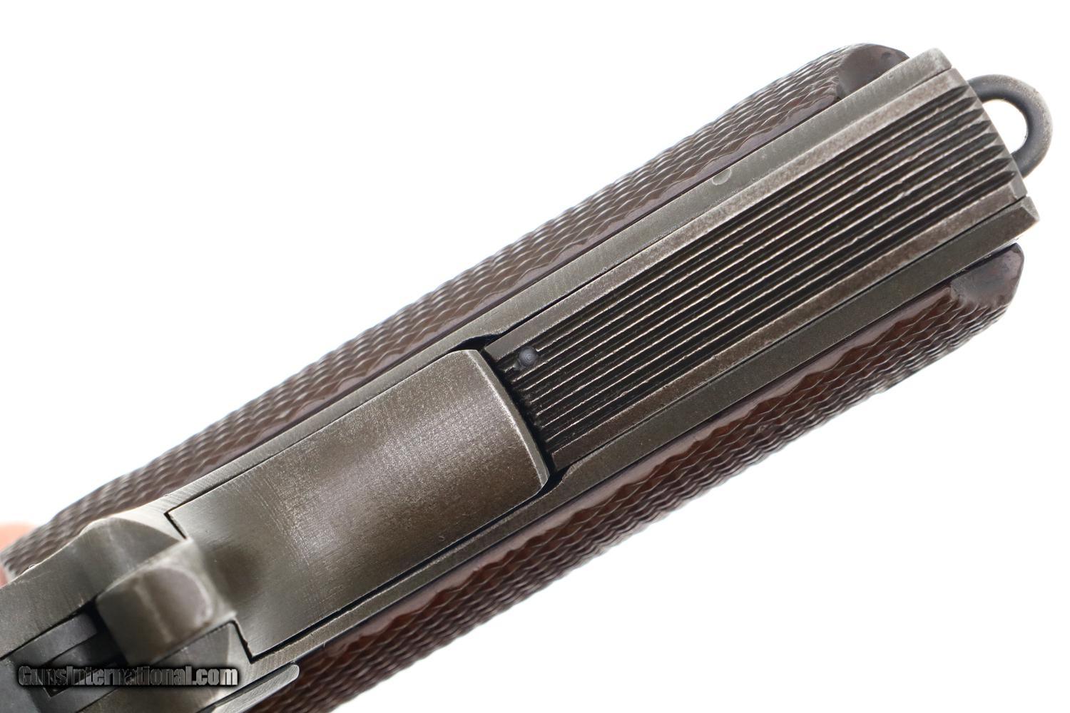 Description: Synopsis: Very attractive Original Condition Ithaca 1911A1 pistol, U.S. Military, WWII, made 1943. Description: Standard configuration 1911A1 manufactured by Ithaca in 1943, the left side of the slide marked with the usual two-line Ithaca address. The model designation, SN, and U.S. Army markings are on the right side of the frame. Proofing includes the “P” on top of the slide and on the left frame below the magazine release, both breaking through the parkerized finish. The left side of the frame has the “FJA” inspection mark while the ordnance wheel is lightly stamped on the right frame near the tang. It is fitted with blade and notch sights, serrated slide release, thumb safety, narrow serrated hammer, short grip safety, and checkered Keyes Fiber grips with screw reinforcements. Correct blued magazine marked with an ‘S’ on the toe. Disassembly shows barrel lug marked with "P" and "F". Complete with Boyt U.S. Military shoulder holster same- dated 1943. Condition: Very good original parkerized finish with sharp edge, holster, and handling wear consistent with a service pistol having seen moderate use. Comparable grips and magazine. Bright bore. Perfect manual mechanics. Comparable condition shoulder holster. A very attractive and all original U.S. military classic rig that would fit any collection! SOLD Manufacturer: Ithaca Serial Number: 1450923 Caliber Info: .45 ACP |