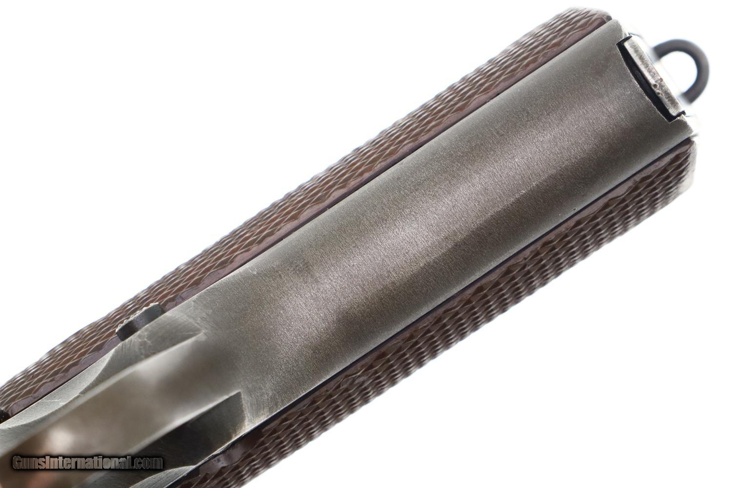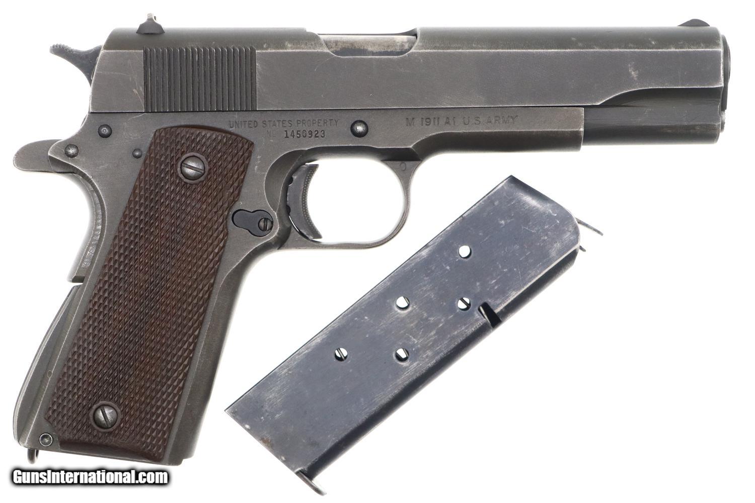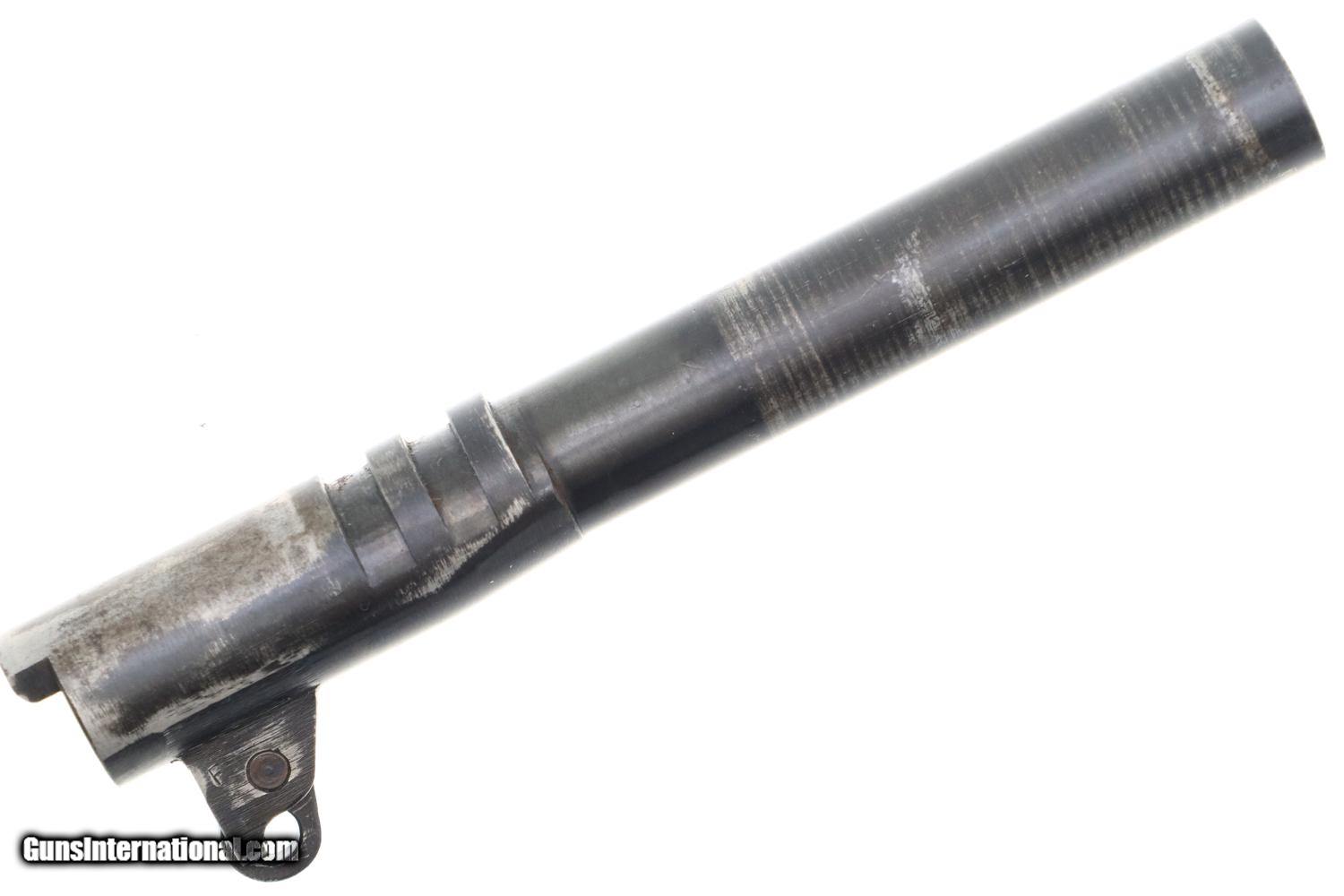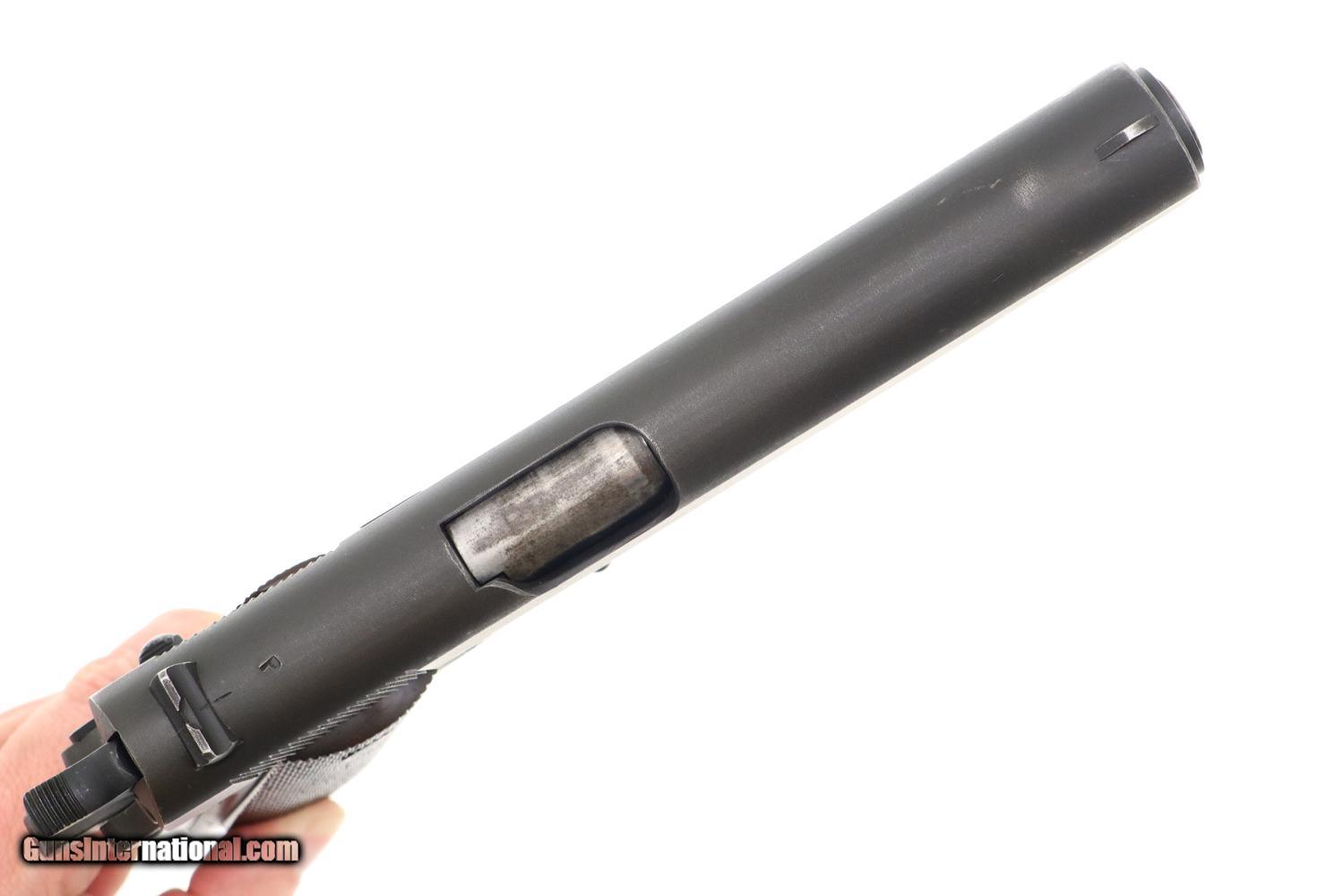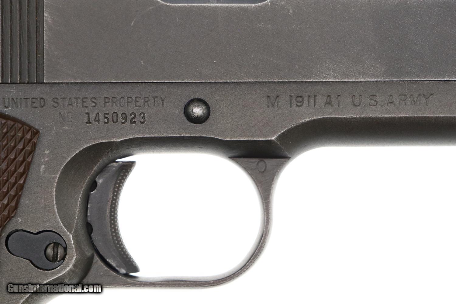 Description: Synopsis: Very attractive Original Condition Ithaca 1911A1 pistol, U.S. Military, WWII, made 1943. Description: Standard configuration 1911A1 manufactured by Ithaca in 1943, the left side of the slide marked with the usual two-line Ithaca address. The model designation, SN, and U.S. Army markings are on the right side of the frame. Proofing includes the “P” on top of the slide and on the left frame below the magazine release, both breaking through the parkerized finish. The left side of the frame has the “FJA” inspection mark while the ordnance wheel is lightly stamped on the right frame near the tang. It is fitted with blade and notch sights, serrated slide release, thumb safety, narrow serrated hammer, short grip safety, and checkered Keyes Fiber grips with screw reinforcements. Correct blued magazine marked with an ‘S’ on the toe. Disassembly shows barrel lug marked with "P" and "F". Complete with Boyt U.S. Military shoulder holster same- dated 1943. Condition: Very good original parkerized finish with sharp edge, holster, and handling wear consistent with a service pistol having seen moderate use. Comparable grips and magazine. Bright bore. Perfect manual mechanics. Comparable condition shoulder holster. A very attractive and all original U.S. military classic rig that would fit any collection! SOLD Manufacturer: Ithaca Serial Number: 1450923 Caliber Info: .45 ACP |