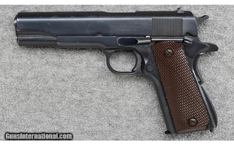 Description: Gun has been re-blued at some point with some light pitting under finish on top of slide. Remainder is excellent with an excellent bore. Grips are also excellent. Nice gun! .45 Auto SOLD Metal Condition: Very Good Bore Condition: Excellent Barrels: 5 Triggers: Factory Butt Pad: Checkered Bakelite Grips Weight: 40 Oz. Sights: Fixed Blade Front - Adjustable Notch Rear Item Location: Wheeling |