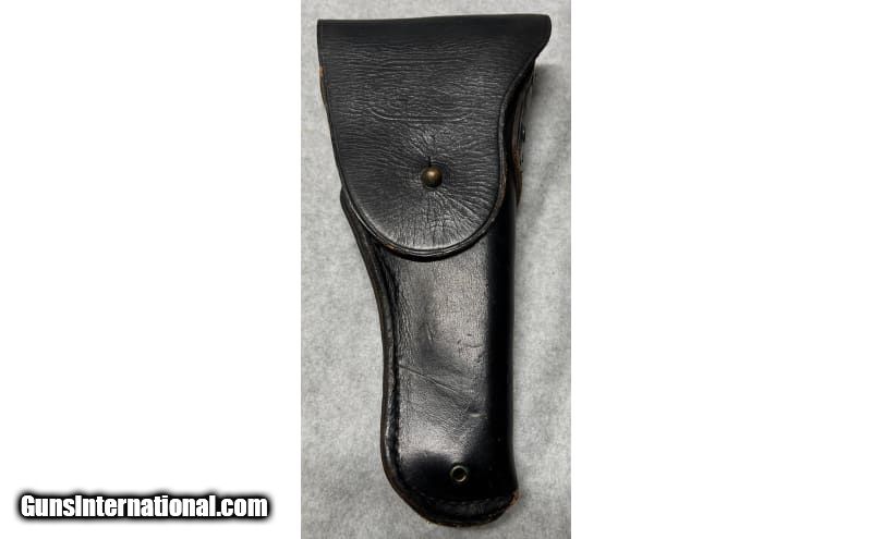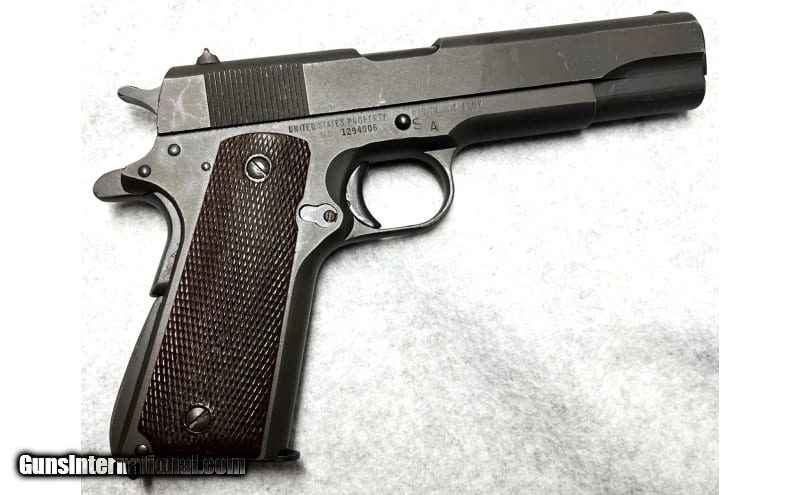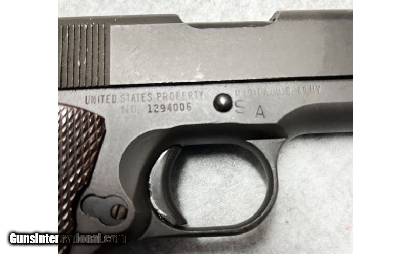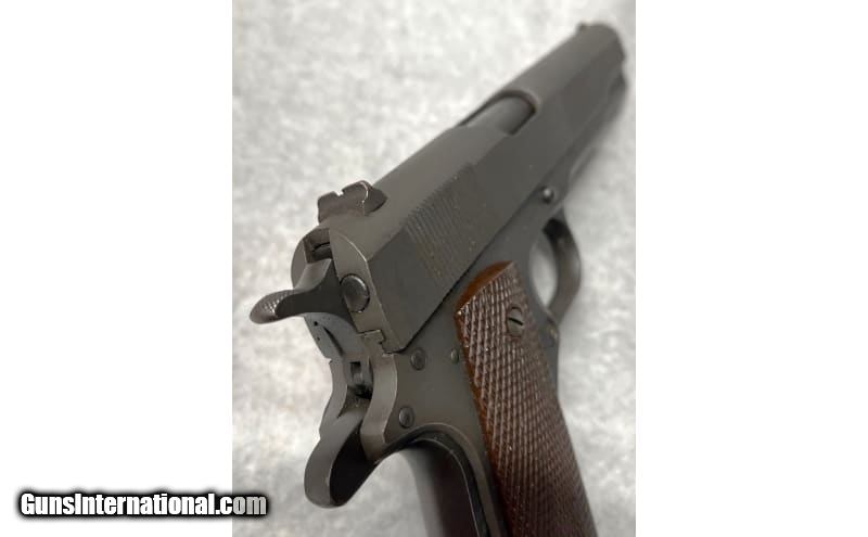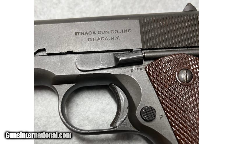 Description: Wartime production, U.S. Army marked, Ithaca M19911A1 semiautomatic pistol chambered in .45 Auto. "United States Property" marked, the serial number (1264006) indicates that the pistol was produced in 1943. The original holster is included. .45 Auto SOLD Chambers: 45 AUTO Metal Condition: GOOD WITH WARE Wood Condition: GOOD WITH WARE Bore Condition: BRIGHT AND CLEAN NO PITTING Barrels: 5 Triggers: FACTORY TRIGGER Weight: 2 lbs 4 oz Sights: FIXED SIGHTS Item Location: Grandville, MI |