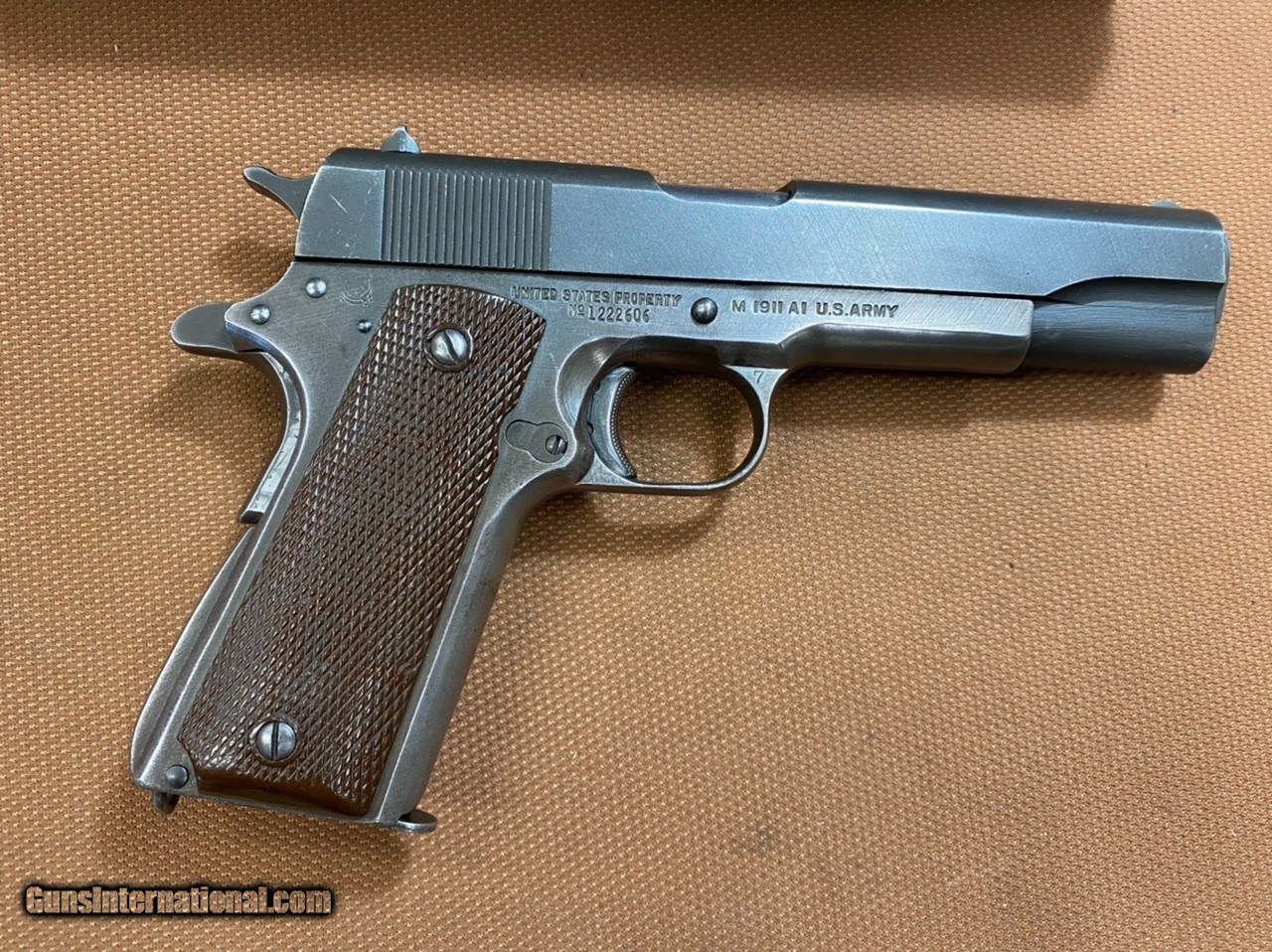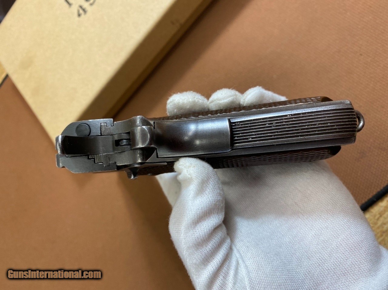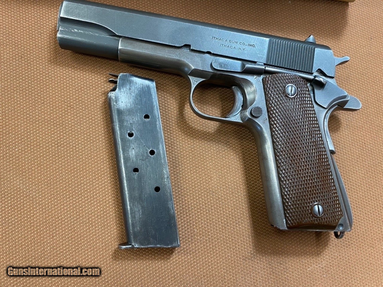 Description: Beautiful Ithaca M1911A1 WWII, manufacture in 1943. The pistol is in excellent condition! All Original based on our thorough inspection. The original finis is outstanding! In great condition! it comes with correct HS barrel, Keyes grips, and Scovill magazine. Also a repro box! Please see pics and ask any questions! UPS shipping $75 to Continental US ONLY. NO California! Thanks! SOLD Handgun Caliber: .45 ACP (.45 Auto) |