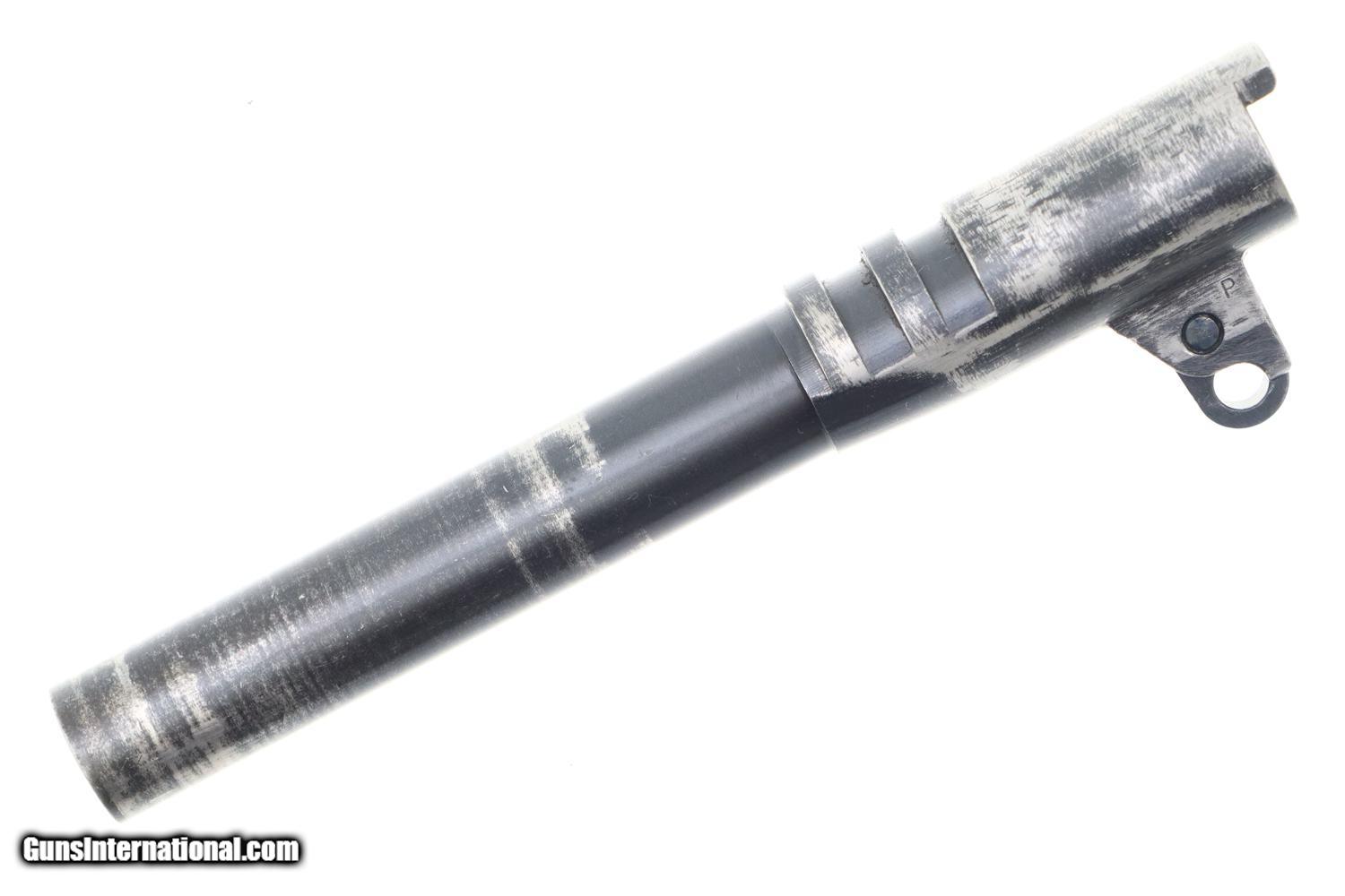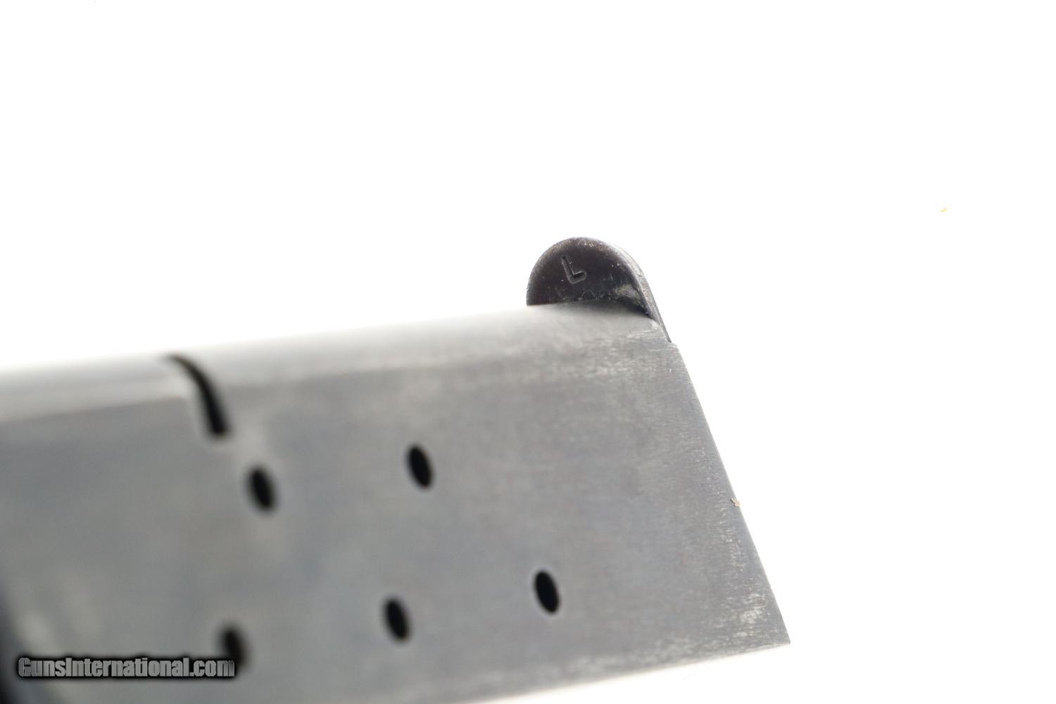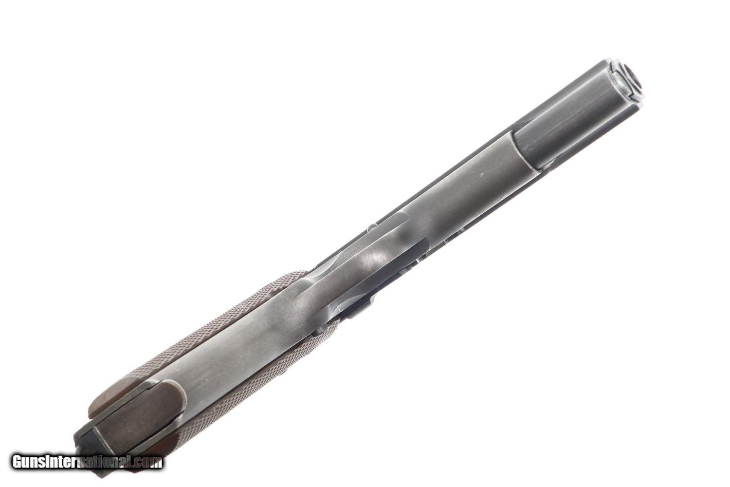 Description: Synopsis: Attractive, Original Ithaca 1911A1 pistol, U.S. Military, WWII, made 1945. Description: Standard configuration 1911A1 manufactured by Ithaca in 1945, the left side of the slide marked with the usual two-line Ithaca address. The model designation, SN, and U.S. Army markings are on the right side of the frame. Proofing includes the “P” on top of the slide and on the left frame below the magazine release, both barely breaking through the parkerized finish. The left side of the frame has the “FJA” inspection mark. The ordnance wheel is very lightly stamped on the right frame near the tang. It is fitted with blade and notch sights, serrated slide release, thumb safety, and hammer; short grip safety, and checkered Keyes Fiber grips with reinforcements around the screws. Correct blued magazine marked with an ‘L’ on the toe. Disassembly shows the barrel lug marked with a "P" (left side) and "F" (right side). Condition: Very good original parkerized finish with sharp edge wear and a scattering of handling marks reflecting its history of service. Comparable grips and magazine. Bright bore with sharp rifling. Perfect manual mechanics. A very attractive and all original U.S. military classic 1911A1 that would fit any collection! ~~Insured shipping fee of $65; most packages shipped using FedEx 2nd Day.~~ SOLD Curio/Relic: Yes Manufacturer: Ithaca Serial Number: 2627059 Caliber Info: .45 ACP |