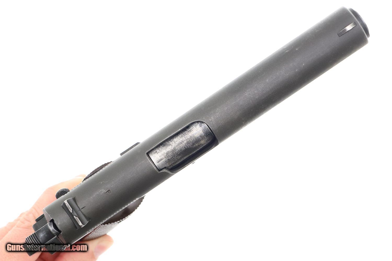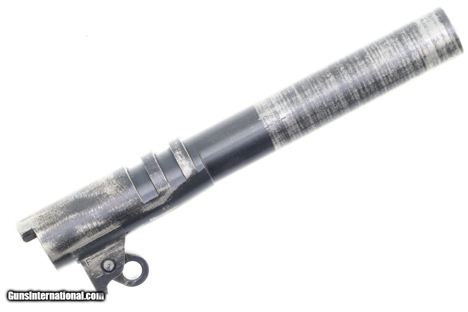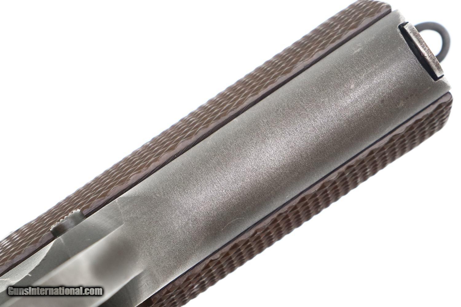 Description: Synopsis: Attractive, Original Ithaca 1911A1 pistol, U.S. Military, WWII, made 1945. Description: Standard configuration 1911A1 manufactured by Ithaca in 1945, the left side of the slide marked with the usual two-line Ithaca address. The model designation, SN, and U.S. Army markings are on the right side of the frame. Proofing includes the “P” on top of the slide and on the left frame below the magazine release, both barely breaking through the parkerized finish. The left side of the frame has the “FJA” inspection mark. The ordnance wheel is very lightly stamped on the right frame near the tang. It is fitted with blade and notch sights, serrated slide release, thumb safety, and hammer; short grip safety, and checkered Keyes Fiber grips with reinforcements around the screws. Correct blued magazine marked with an ‘L’ on the toe. Disassembly shows the barrel lug marked with a "P" (left side) and "F" (right side). Condition: Very good original parkerized finish with sharp edge wear and a scattering of handling marks reflecting its history of service. Comparable grips and magazine. Bright bore with sharp rifling. Perfect manual mechanics. A very attractive and all original U.S. military classic 1911A1 that would fit any collection! ~~Insured shipping fee of $65; most packages shipped using FedEx 2nd Day.~~ SOLD Curio/Relic: Yes Manufacturer: Ithaca Serial Number: 2627059 Caliber Info: .45 ACP |