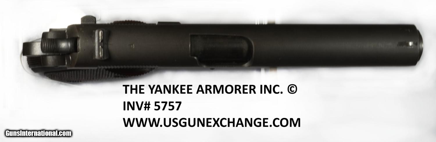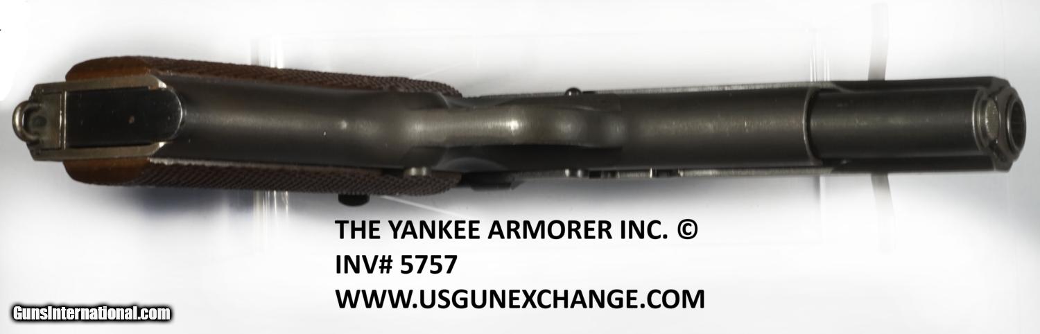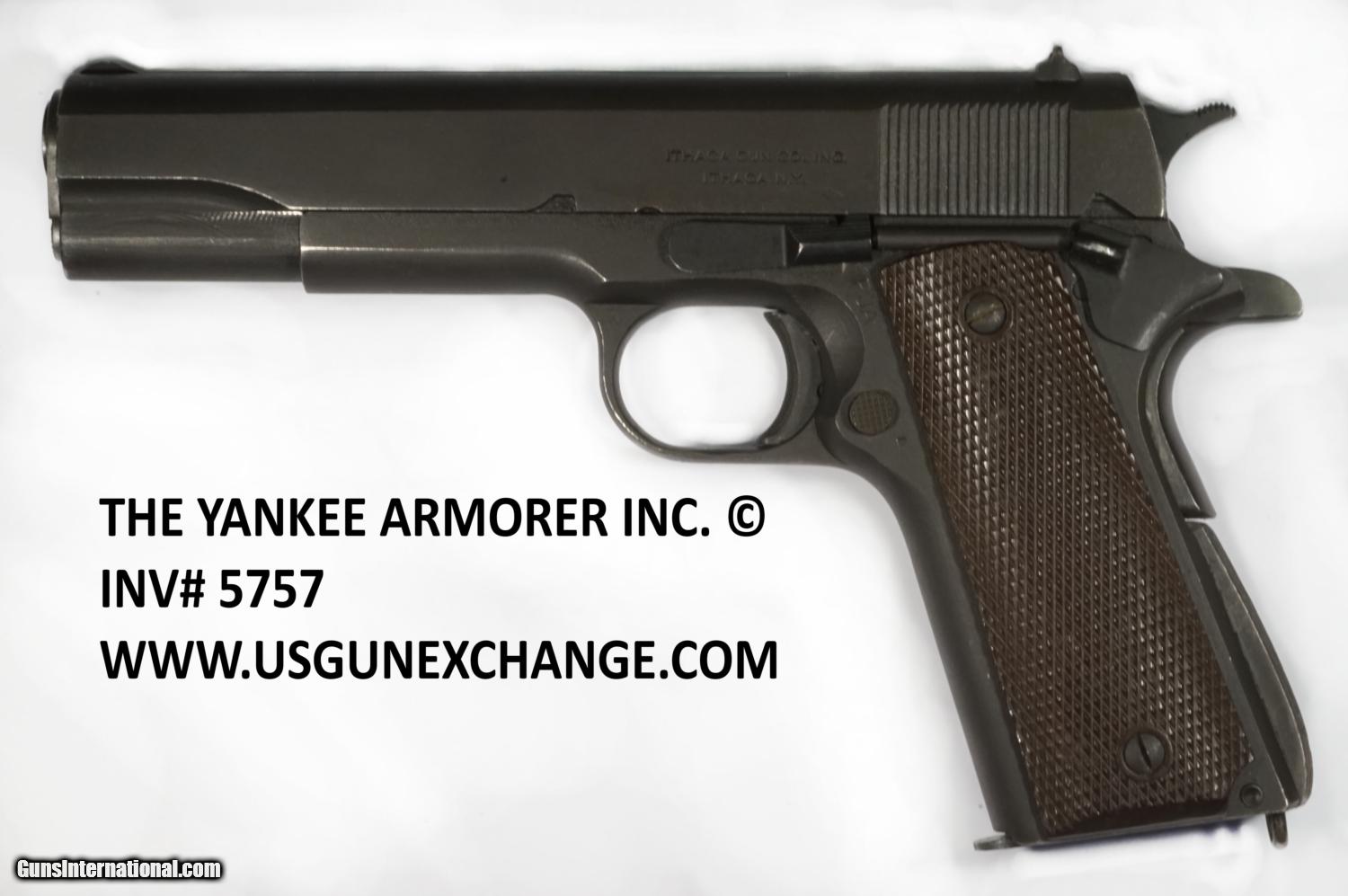 Description: Inv. 5757 Ithaca Mdl. 1911-A1 Cal. .45acp, Ser. 21095XX. It would be hard indeed to find a nicer Ithaca. A tiny rub mark on the front grip, a scant bit of edge silvering, a tiny scratch from the take down lever tale. That's it. All symptoms of some minor holster wear. The gun does not look like it has seen any use at all. The right rear of the frame has the Crossed Cannons Ordinance stamp. The top of the slide, the P proof and the left side JFA inspector's stamp and P proof. All parts match and are proper for the gun. The brown plastic grip panels are the correct ring series and are flawless. The bolt face and feed ramp shows almost no use. The Barrel is the correct High Standard type. The bore is impeccable with razor sharp, and mirror bright rifling. The gun comes with one correct "L" (M.S. Little) stamped magazine. What a center piece to a collection this is......$2295 To purchase this firearm or if you want to request more information contact us at: Email ckgunsymail Phone 201-512-0002 Cell 201-575-6838 FAX 201-215-4759 We accept most major credit cards. Prices shown are Discounted 3% for Cash or Check. The buyer must be familiar with all the laws governing the purchase and the ownership of firearms in their own city and state. The Yankee Armorer, Inc is not responsible for any failure to comply with or observe these laws. The Yankee Armorer, Inc will only ship after full payment and receipt of all required documents. Shipping: Add $35.00 for handguns, $45.00 for long guns. New Jersey buyers are subject to a 7% sales tax. The Yankee Armorer, Inc offers a 3 day inspection period with full refund upon return of intact firearm and in the original condition. The Yankee Armorer, Inc offers a no interest lay away program - 25% down; 25% in 30 days; 25% in 60 days; and full payment in 90 days. Any violation of this policy is subject to restocking and forfeiture of all payments. Any variation from this policy must be agreed to in advance. Unshipped Cancelled sales are subject to a 20% restocking fee. Be advised that all firearms sold by The Yankee Armorer, Inc. or the Gun Exchange, LLC (SELLER) are sold as collector’s items. They have not been fired or tested for safety and must be examined by a license gunsmith prior to use. By purchasing any item from the (SELLER), you are agreeing to hold the (SELLER) free from any damages or lawsuits of any nature. Any item left for transfer or storage will be charged to $25.00 per month, per item from the day of its receipt. Any variation from this policy must be agreed to in advance. Store hours 10:00 am to 5:00 pm Tuesday -Saturday. It's always best to call for appointment. Store 201-512-0002, cell 201-575-6838. SOLD Manufacturer: Ithaca Model: 1911-A1 Serial Number: 21095XX Caliber Info: .45 |