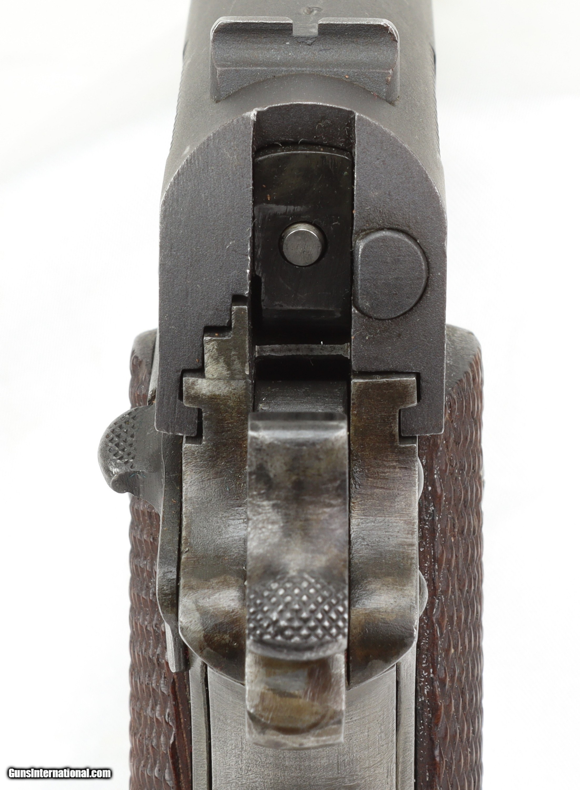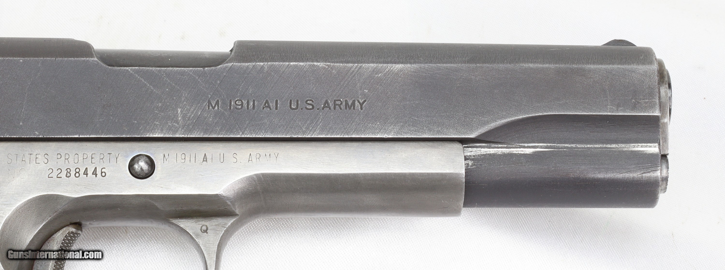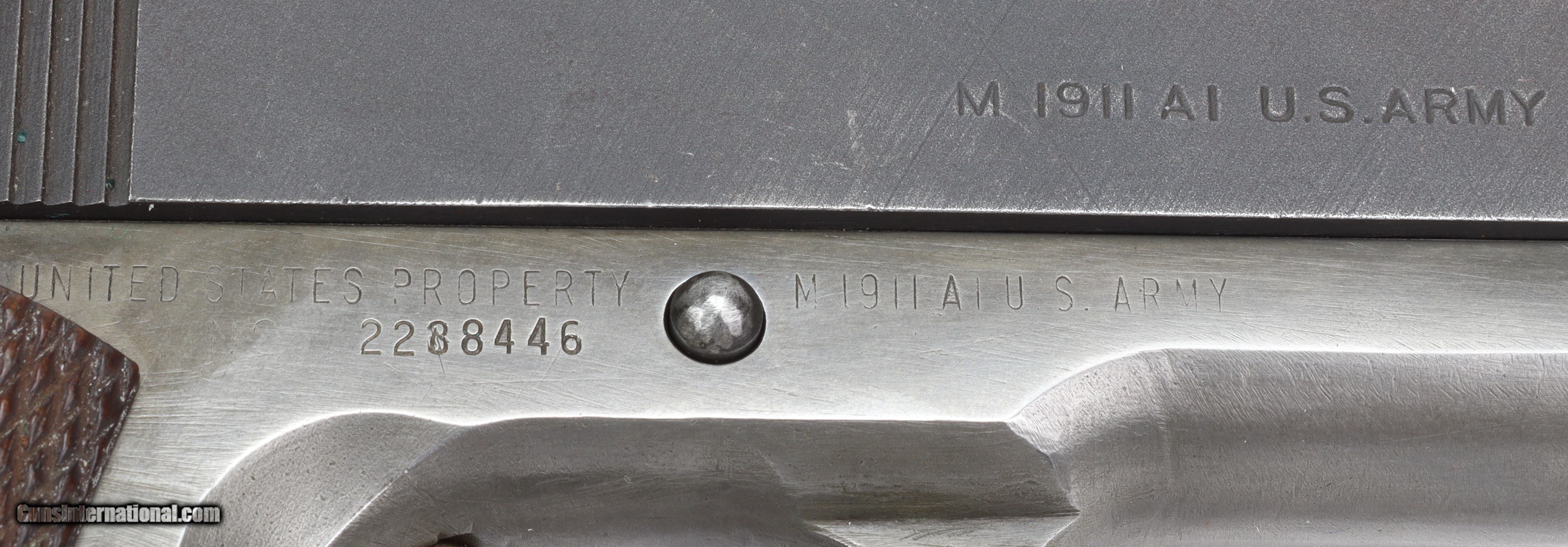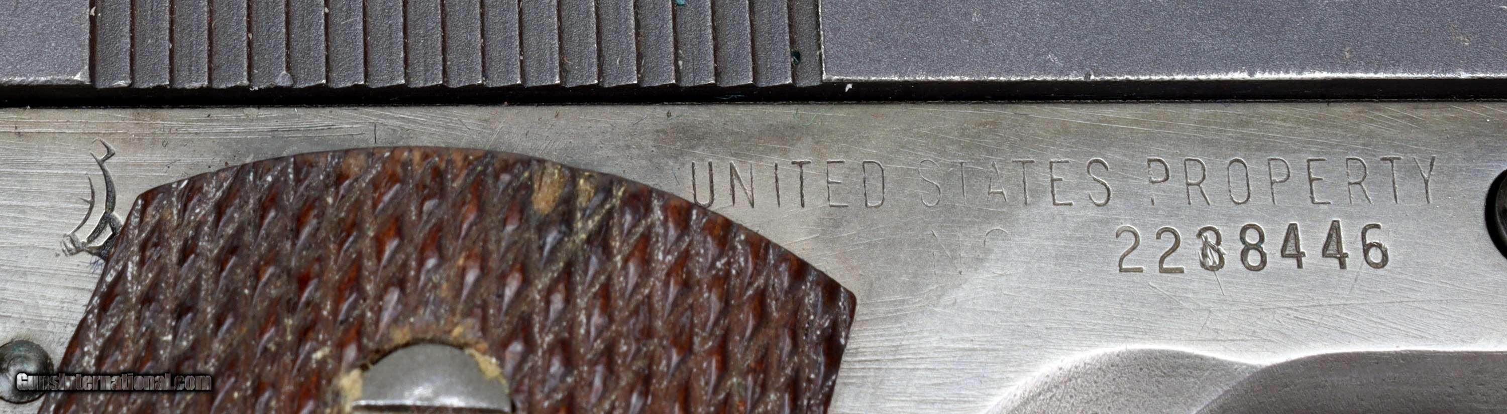 Description: Ithaca 1911A1 U.S. Army Semi-Auto Pistol in .45ACP. SN #2288446. Mfg. in 1945. 5" Barrel with an EXCELLENT Bright Bore with STRONG RIFLING. Parkerized Metal Finish has the usual wear and is in VERY GOOD condition for it's age. The Walnut checkered grips are in GOOD to VERY GOOD condition for their age. Marked with "UNITED STATES PROPERTY" "M1911A1 U.S. ARMY on right side of slide. Inspector Proof "FJA" for Frank J. Atwood, Lt. Col. on left side of frame. Fixed Sights. 1 - 7 round magazine. Weight: 2.42 lbs. Trigger Pull: 3 lbs. 8 oz. More photos available upon request. Ships to Lower 48 W/ Insurance $45.00. SOLD Curio/Relic: Yes Handgun Caliber: .45 ACP (.45 Auto) Manufacturer: Ithaca Model: 1911A1 Serial Number: 2288446 Barrel Length: 5 Condition: VG for Age Metal Condition: VG for Age Wood Condition: VG for Age Bore Condition: Excellent Action: Semi Auto Finish: Parkerized Weight: 2.42 lbs. Manufacture Date: 1945 |