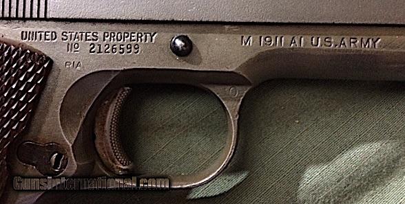 Description: Semi-automatic pistol with holster. 5" barrel. Parkerized. This pistol was shipped in 1945 by Ithaca. The pistol's serial number is Ithaca - Model 1911A1 serial number 2125593 - One of 5000 pistols manufactured in the serial number range 2124483-2127082 shipped January 16, 1945 to Transportation Officer - Benicia Ordnance Depot - Benicia, California. Slight holster wear near muzzle. Initials FJA, P and trigger guard stamp marks. RIA and crossed cannon cartouche stamps on right side above trigger and above right grip. The number 40 is painted into the left grip. The riflings are sharp with no defects. Bore is very good with strong rifling. Type 19 Flannery bbl. Early Colt Type E hammer & earlier Type B checkered safety lock tab w/out milling cut. Functions flawlessly. FJA Proofed on left side above left side showing the ordnance inspectors mark "FJA". This is the mark of Col. Frank J. Atwood. The "P" proofmark is located on the left side of receiver, top of slide and left barrel lug. release. Ships to FFL or C&R. SOLD Curio/Relic: Yes Manufacturer: Ithaca Model: 1911 Serial Number: 2125593 Caliber Info: 45 ACAP Bore: Very Good Chambers: Very Good Ejectors: Very Good Condition: Very Good Metal Condition: Very Good Bore Condition: Very Good Barrels: Very Good Action: Semi Auto |